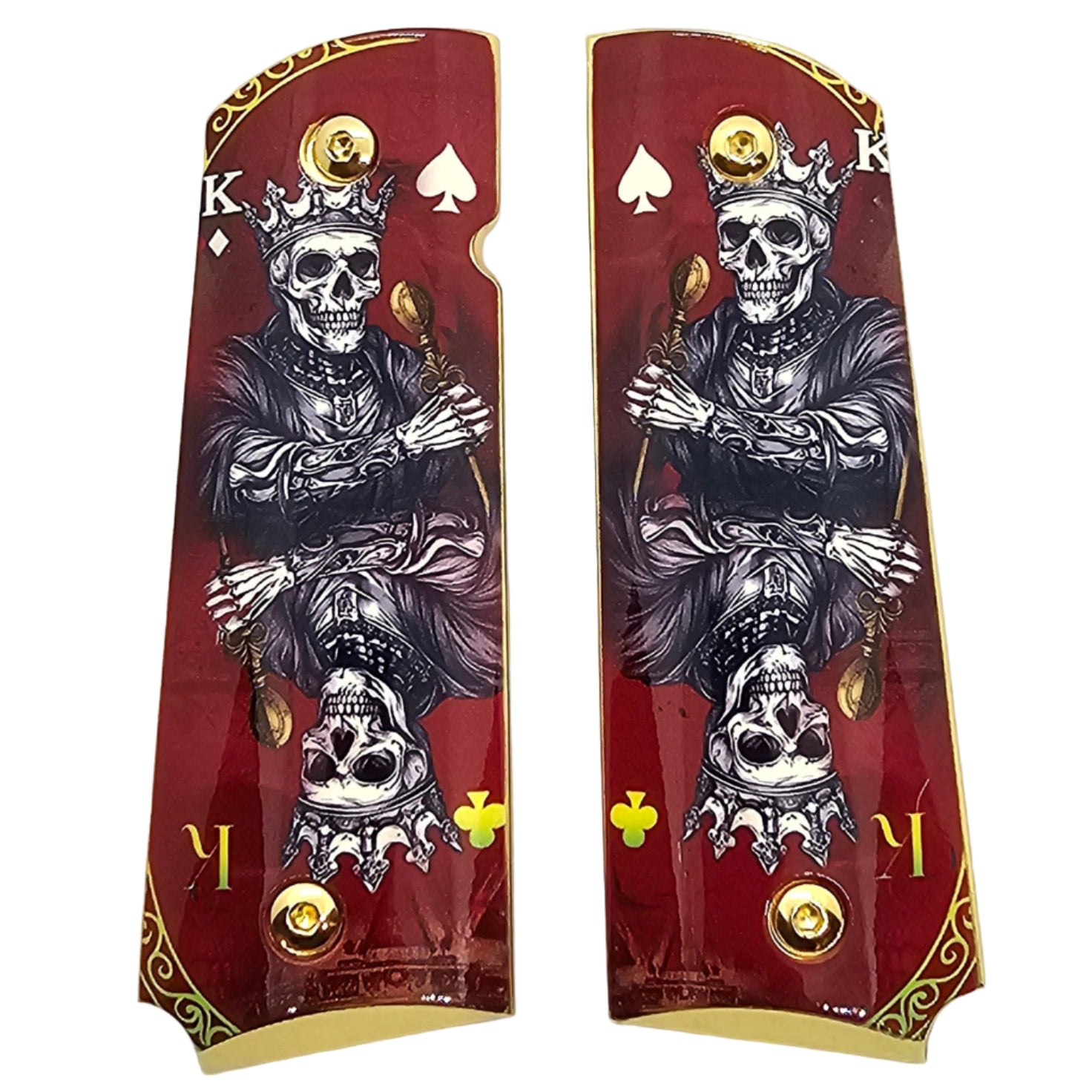 This design showcases the Skeleton King Playing Card theme, featuring a skeletal monarch with crown and scepter set against a deep red card-style background. A perfect choice for collectors, card enthusiasts, or anyone who wants a striking custom look. Includes 4 gold-plated screws for quick and secure installation.