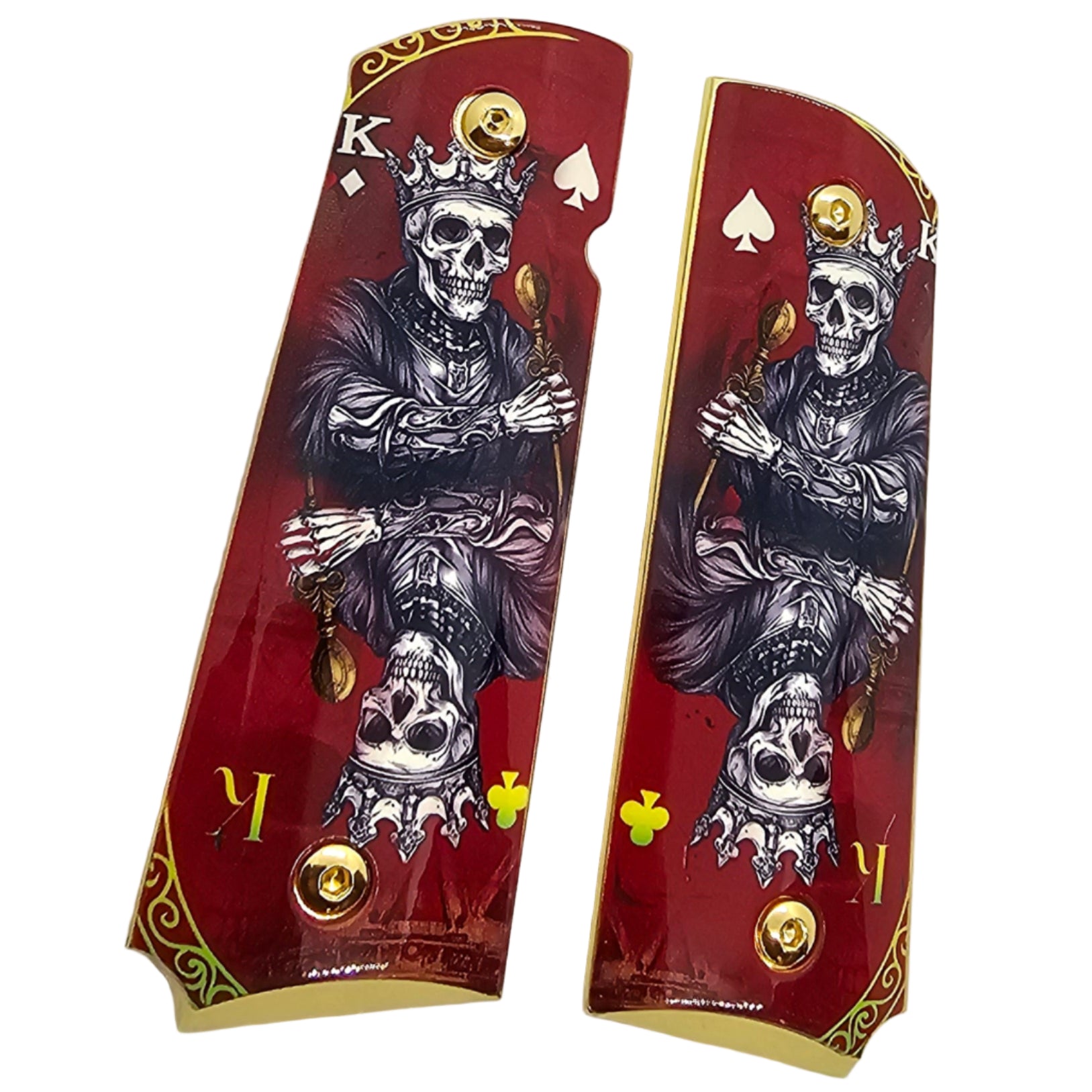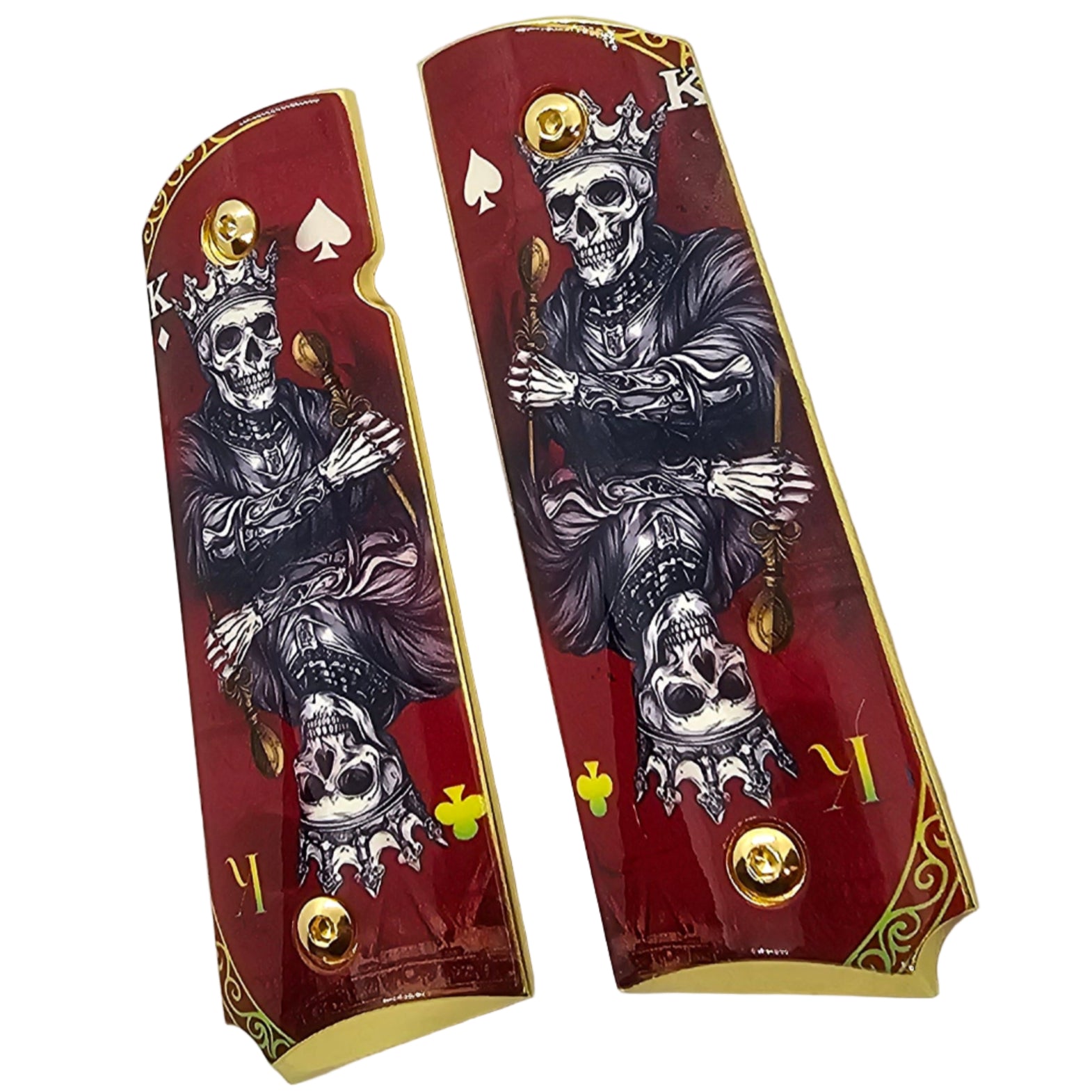 Stand out with these custom full-size 1911 grips, combining durability, artistry, and bold style. Made with a gold-plated metal base for strength and shine, these grips are designed with an ambi safety cut, ensuring compatibility with Government and Commander frame 1911 models that use ambidextrous safeties.