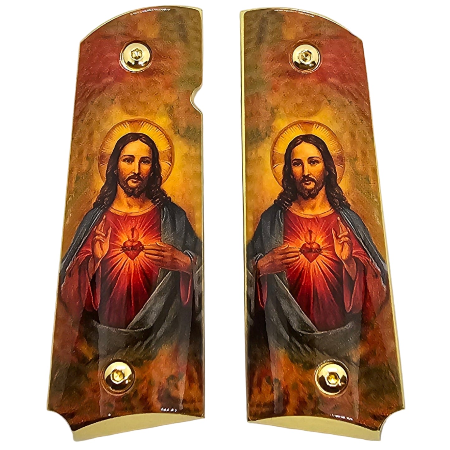 The grips feature a vivid Sacred Heart of Jesus design, richly detailed with warm colors and religious symbolism. This makes them not only durable and functional but also a unique and meaningful collectible. Includes 4 gold-plated screws for quick and easy installation.