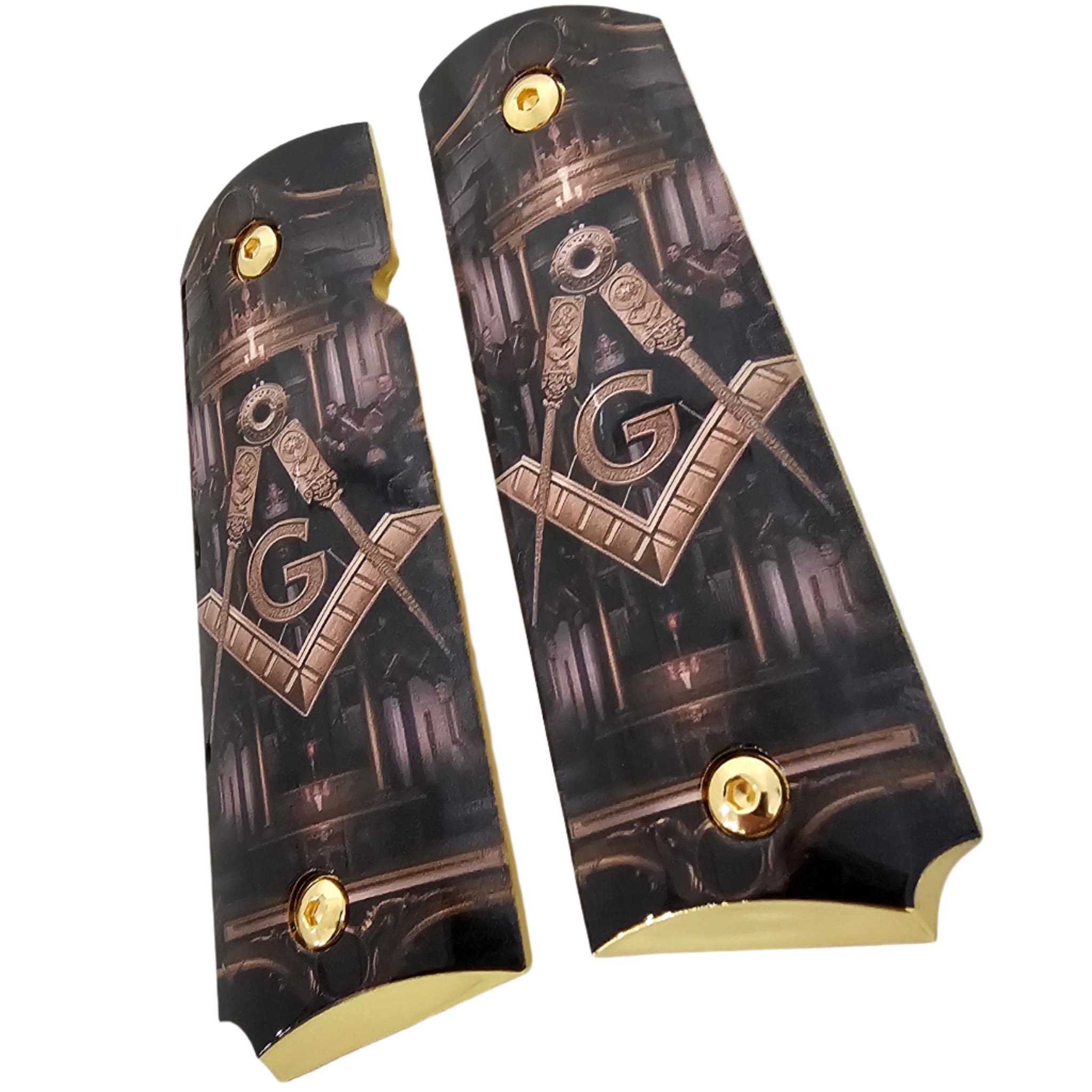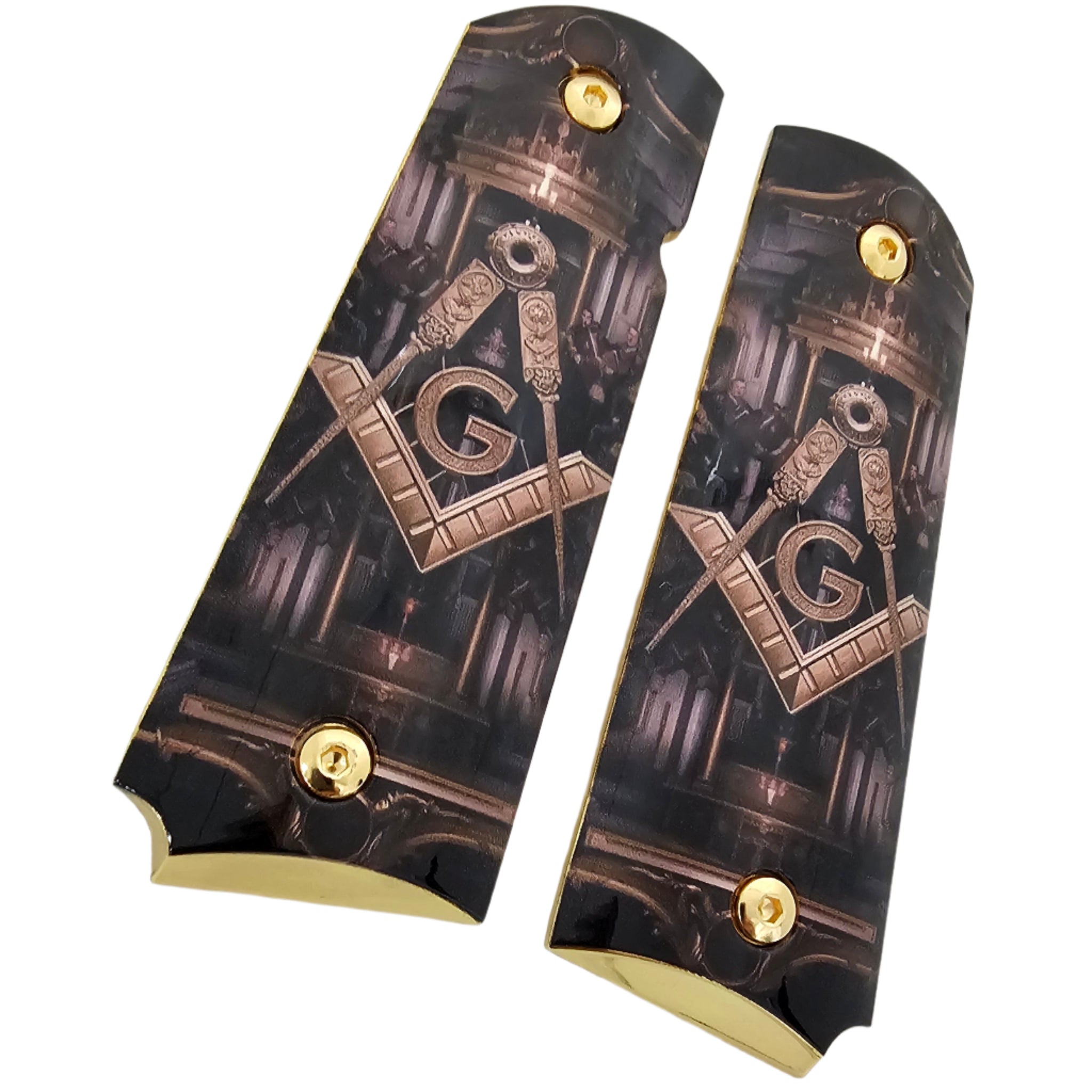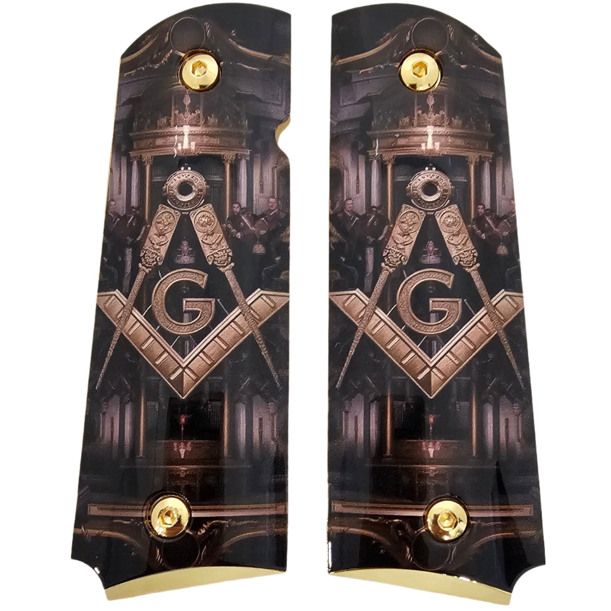 Celebrate tradition, craftsmanship, and symbolism with these premium 1911 full-size metal grips featuring the iconic Freemason Square and Compass design. The gold and blue detailing, centered with the classic “G” emblem and topped by the all-seeing eye, creates a bold statement against a deep polished black background.
