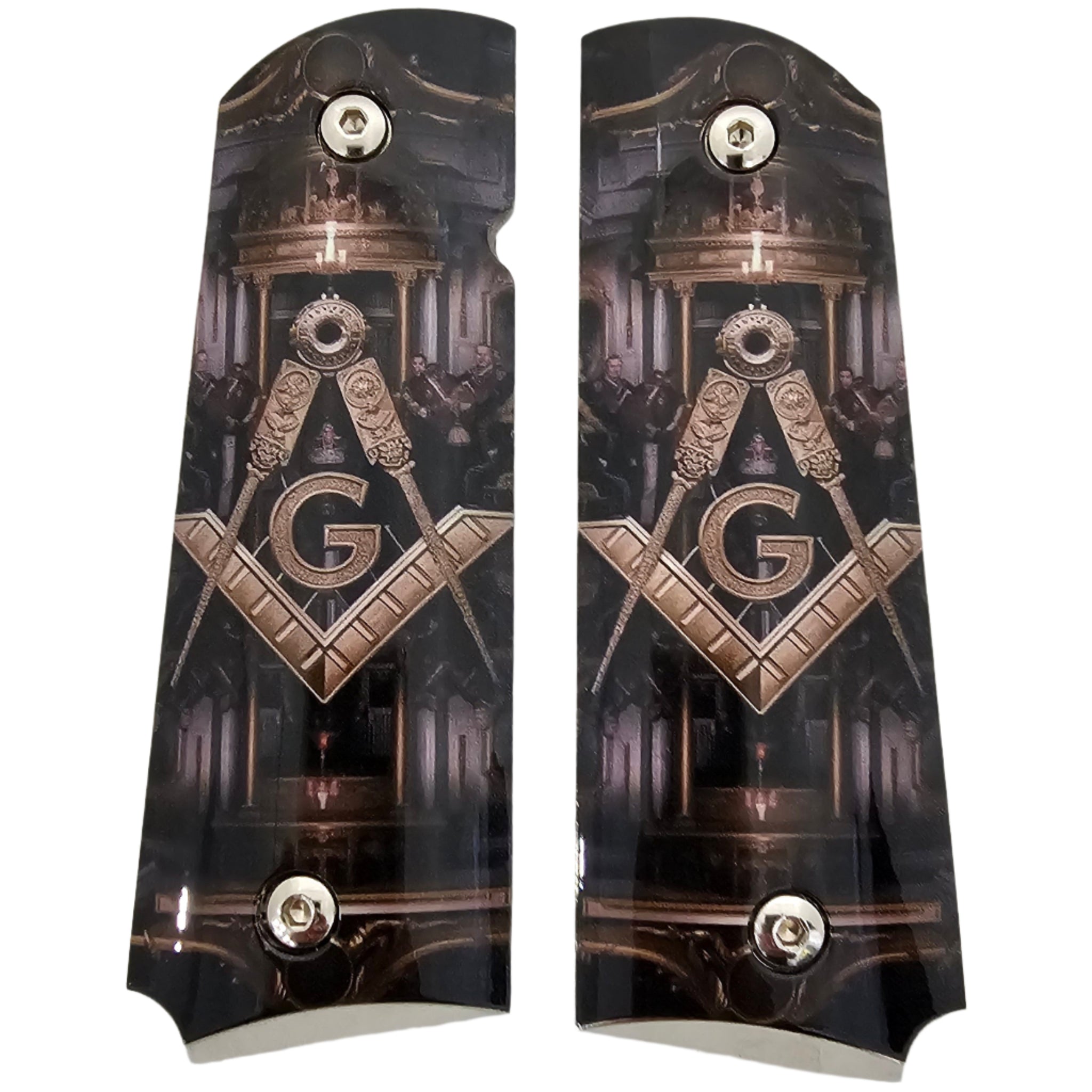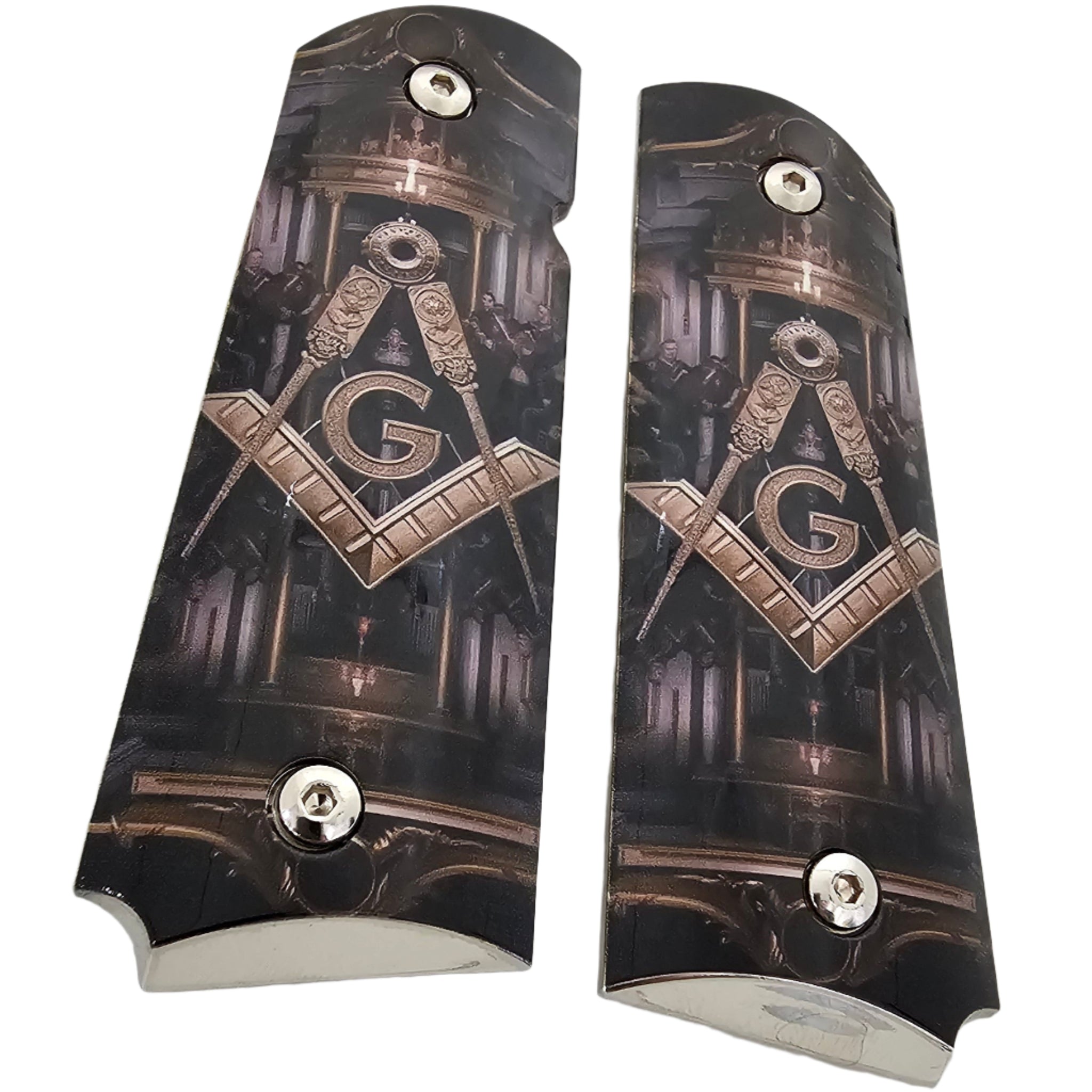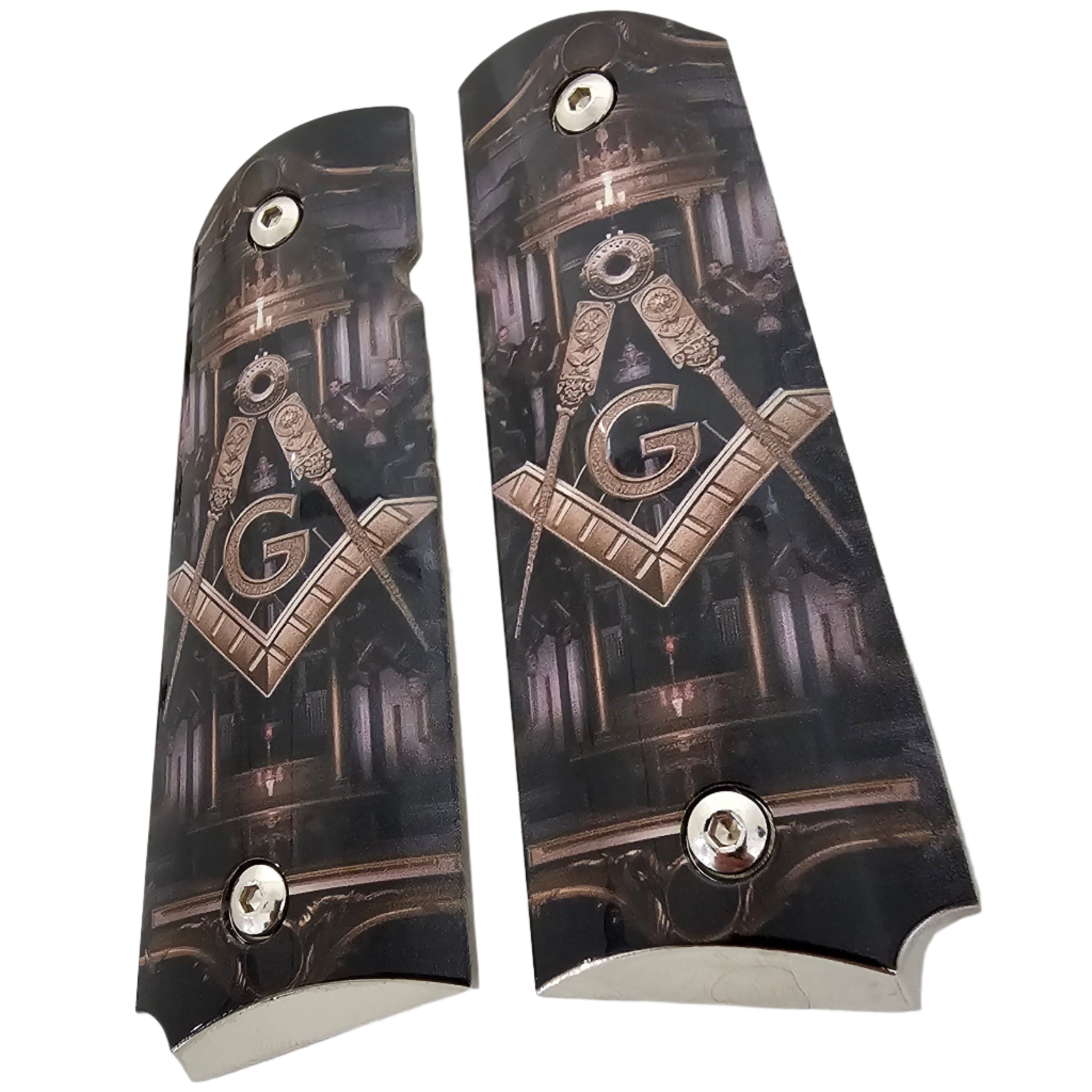 Celebrate tradition, craftsmanship, and symbolism with these premium 1911 full-size metal grips featuring the iconic Freemason Square and Compass design. The nickel and blue detailing, centered with the classic “G” emblem and topped by the all-seeing eye, creates a bold statement against a deep polished black background.