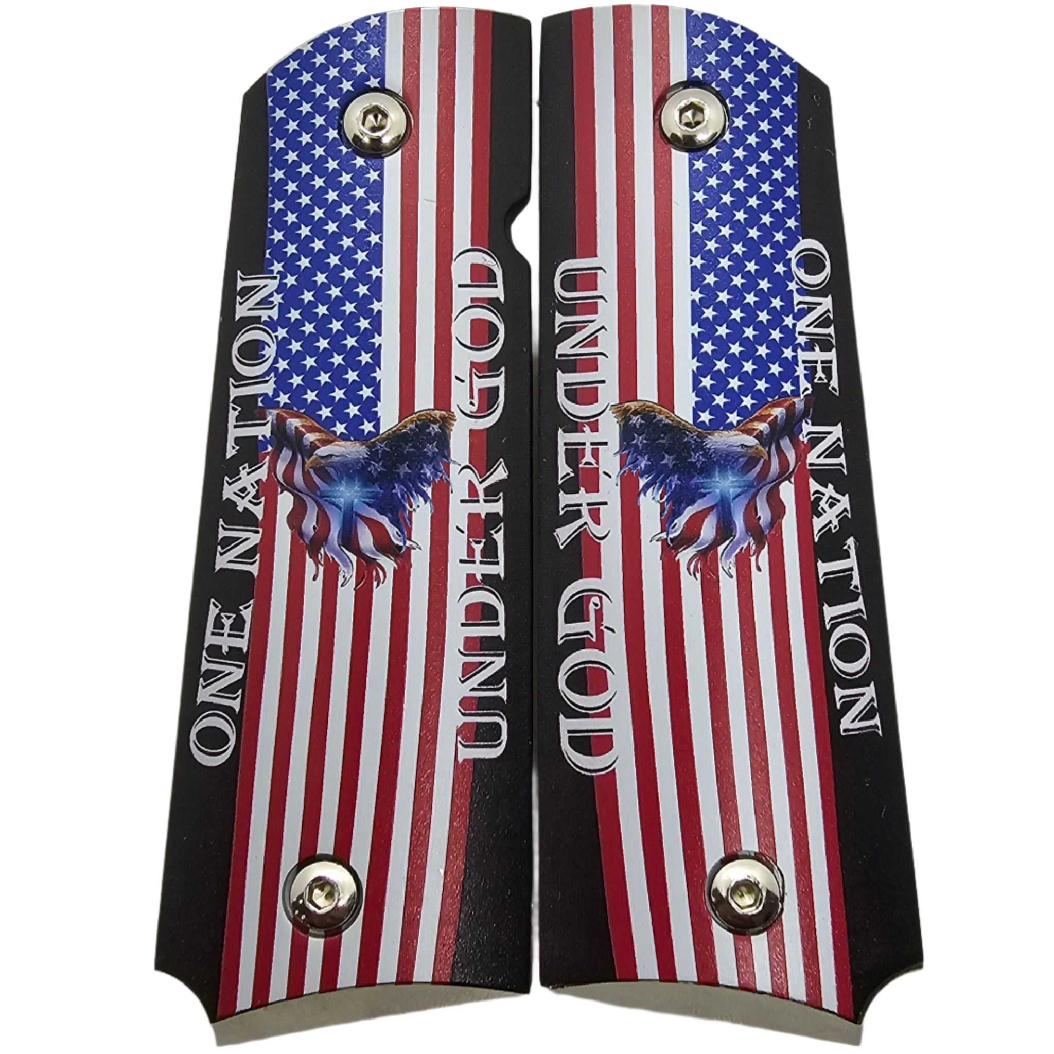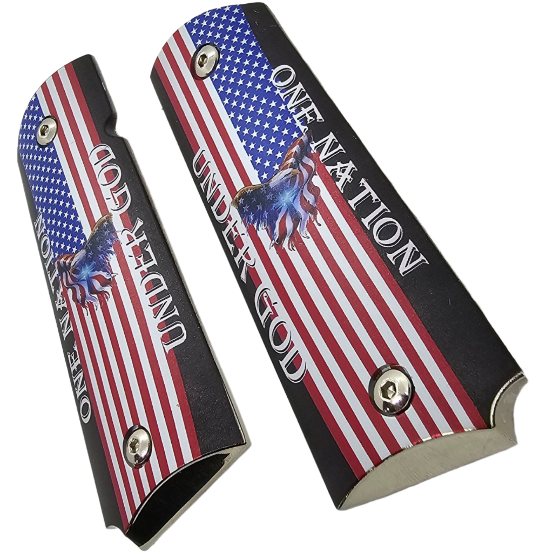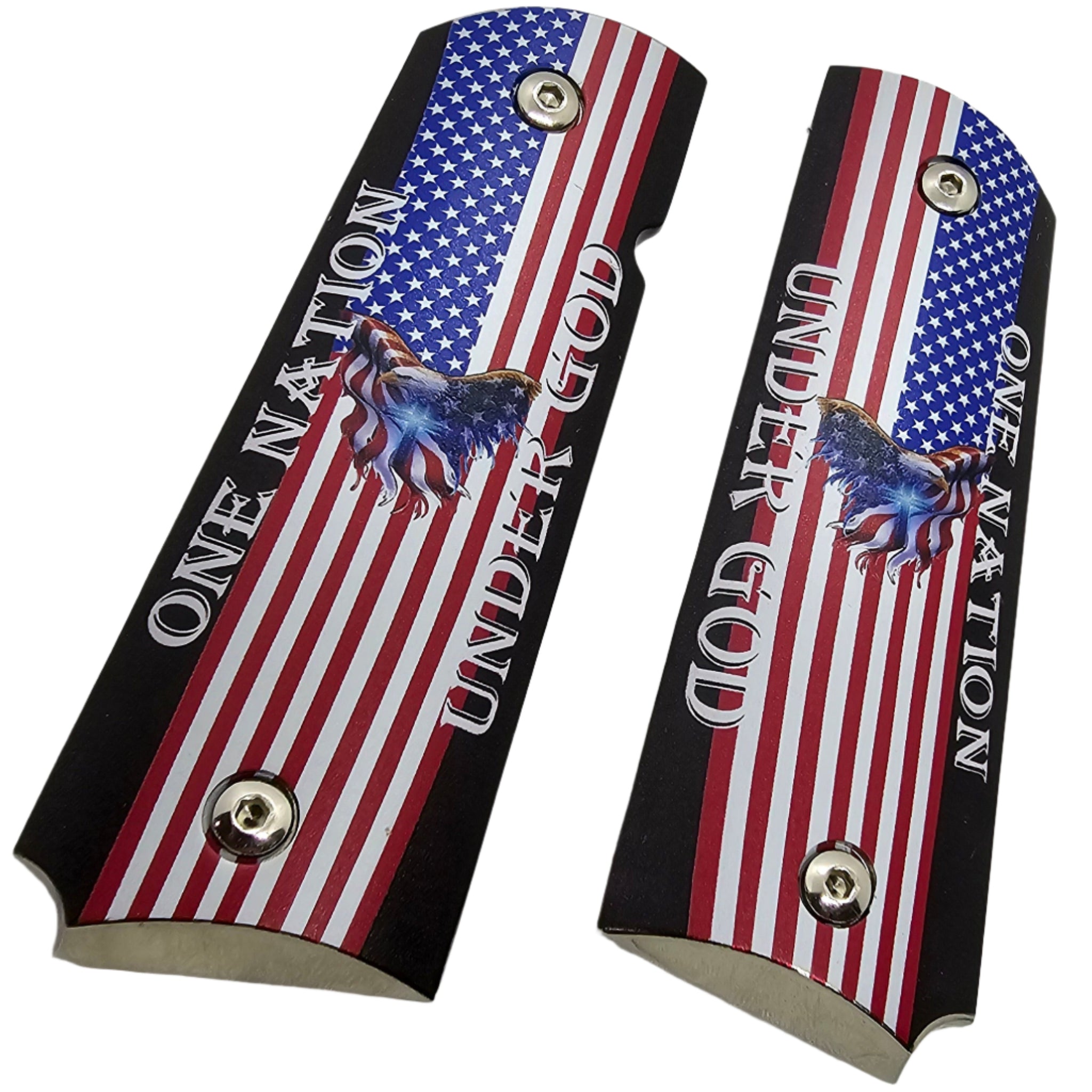 Show your patriotism and faith with these bold 1911 full-size metal grips featuring a vibrant American flag background, a soaring bald eagle, and the inspiring words "One Nation Under God."