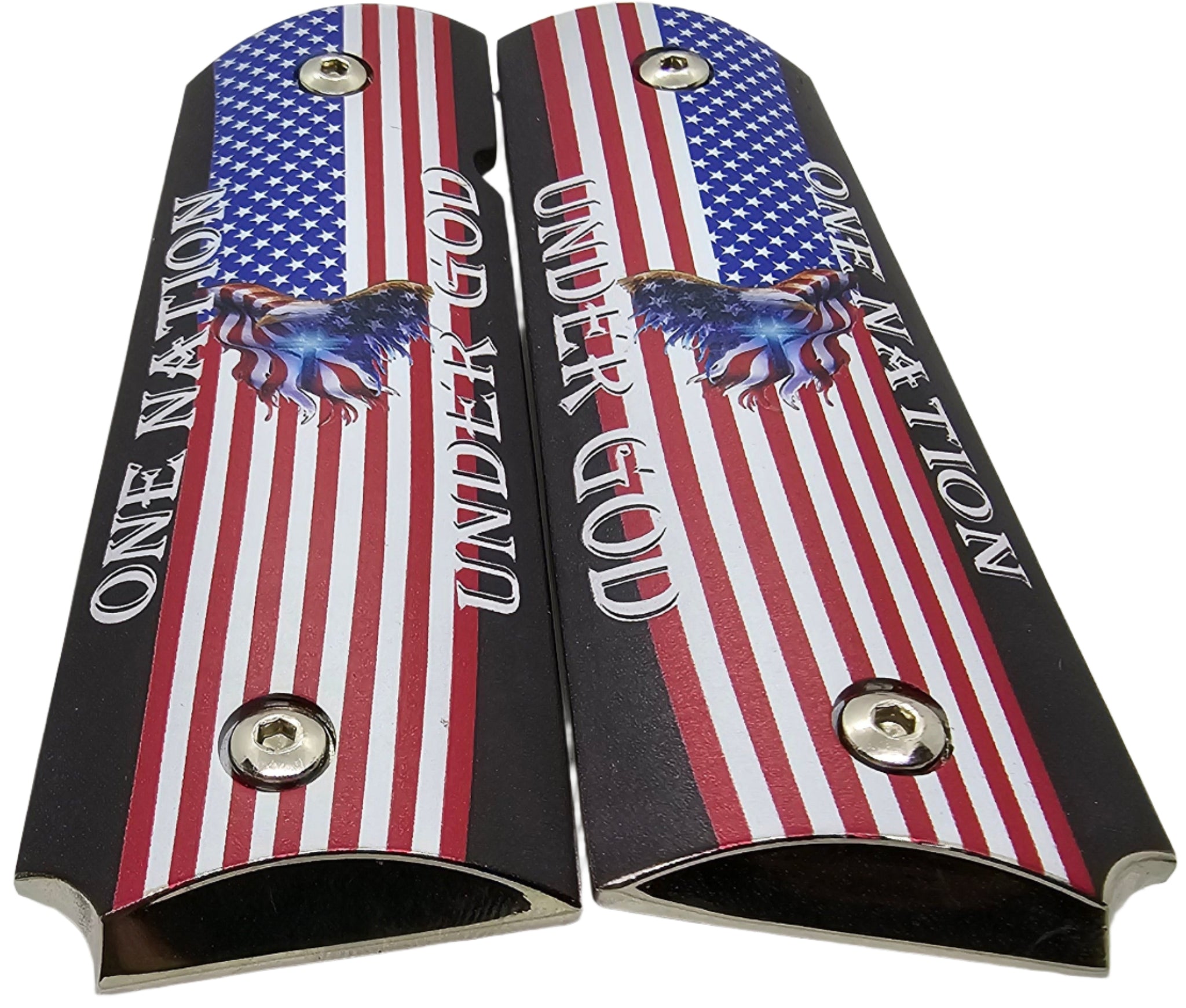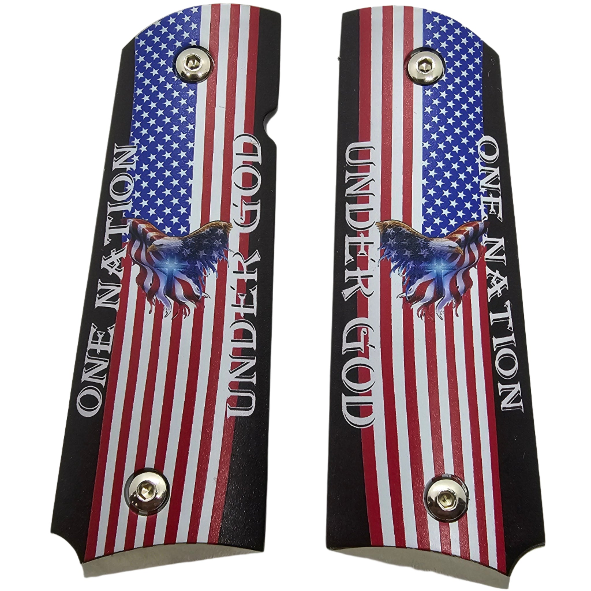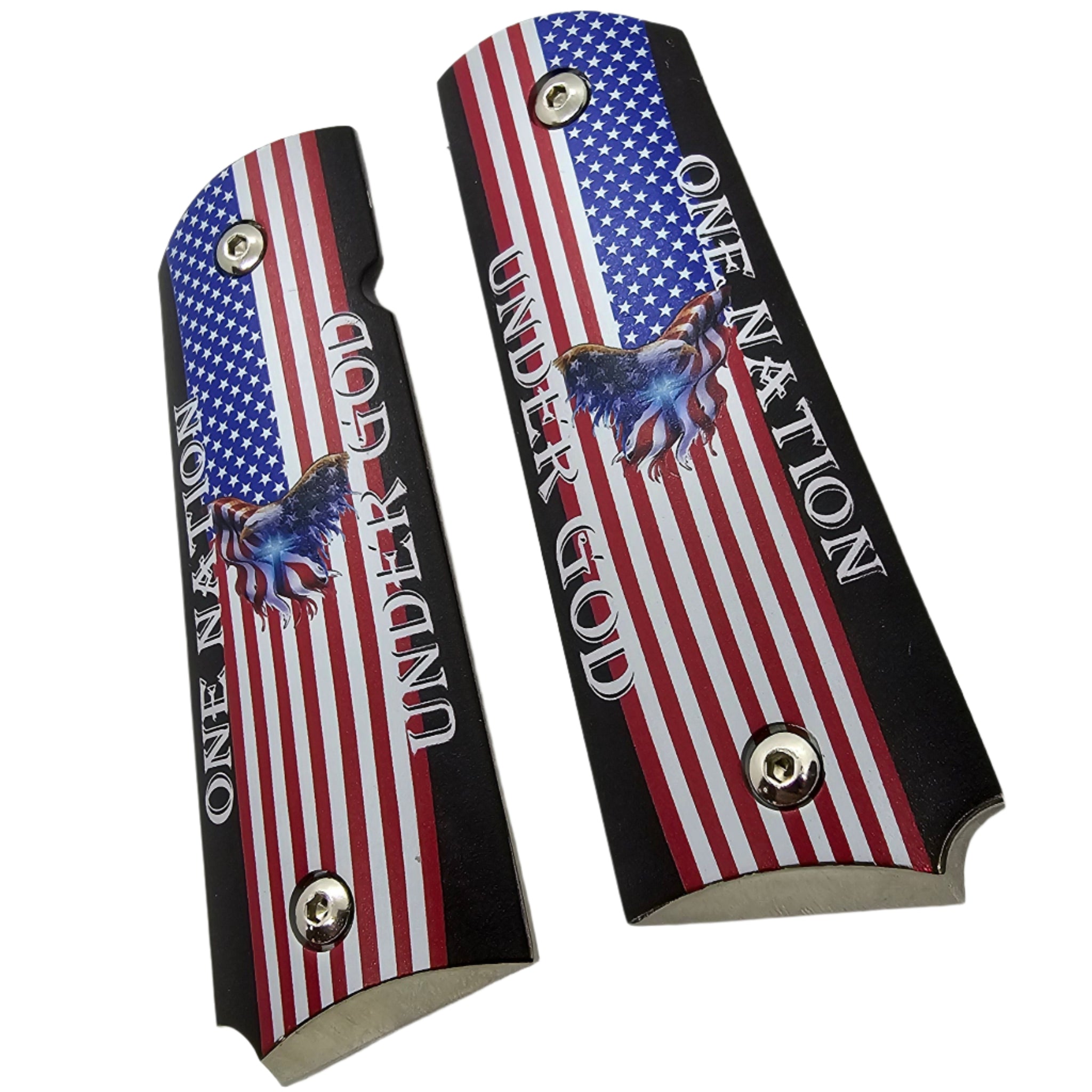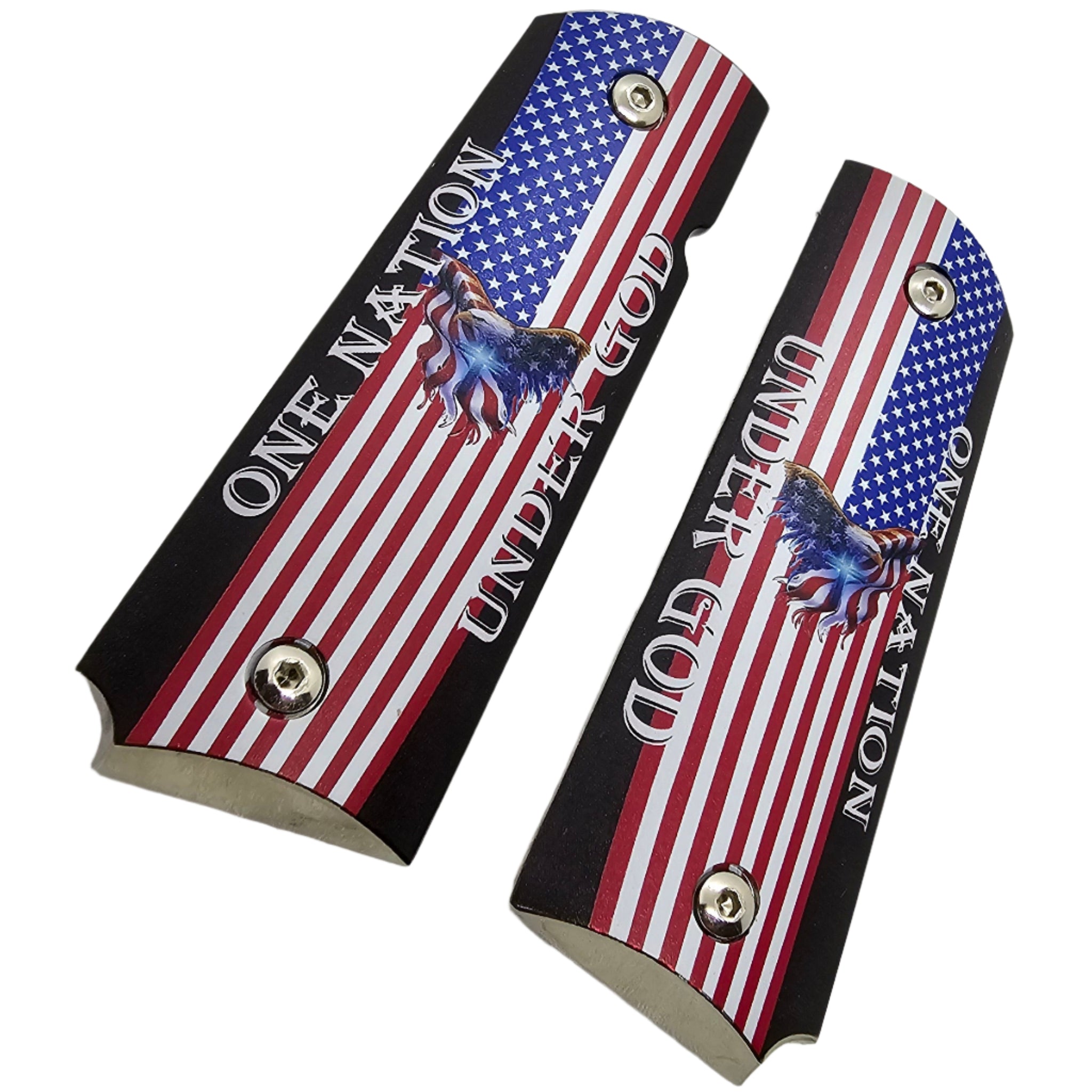 Show your patriotism and faith with these bold 1911 full-size metal grips featuring a vibrant American flag background, a soaring bald eagle, and the inspiring words "One Nation Under God."