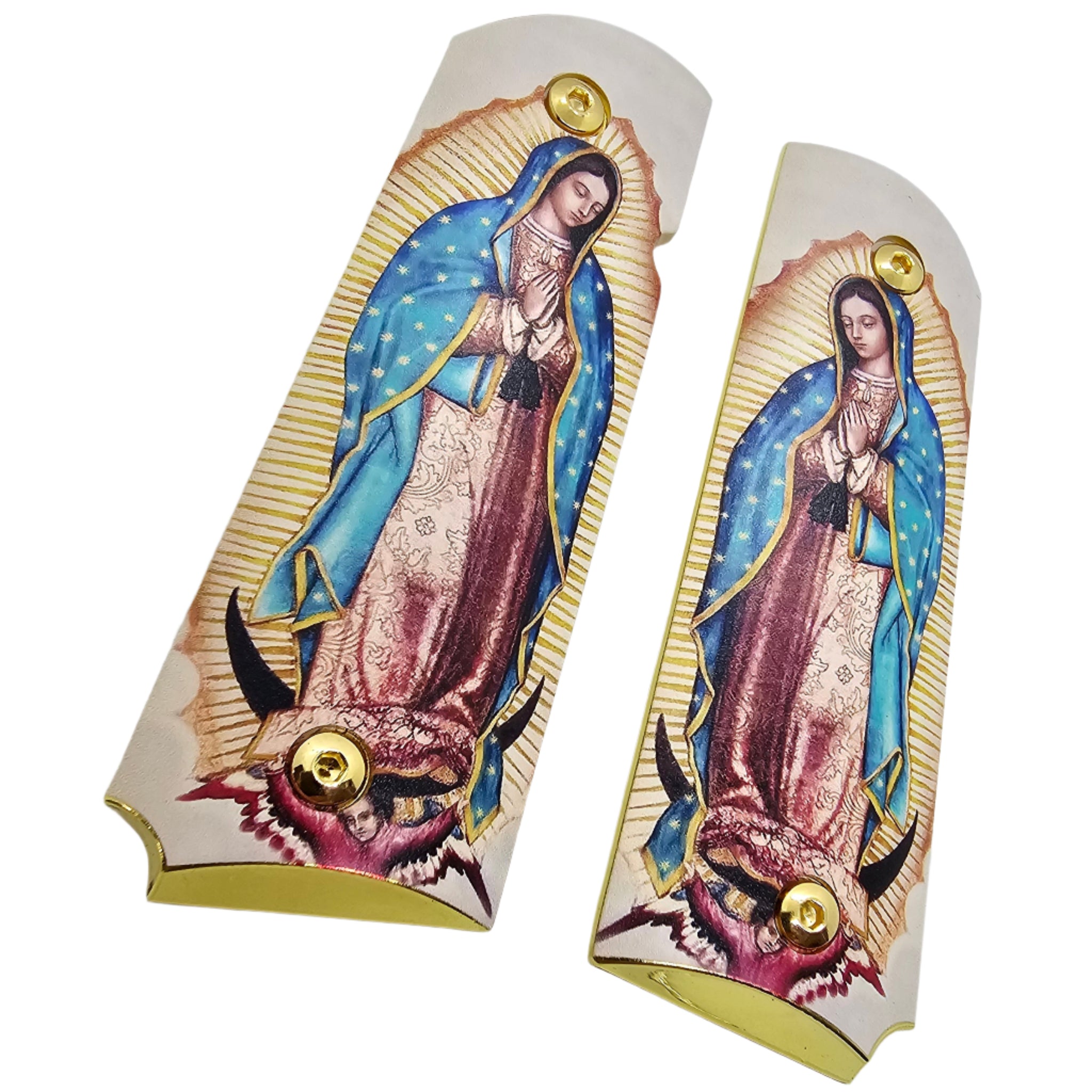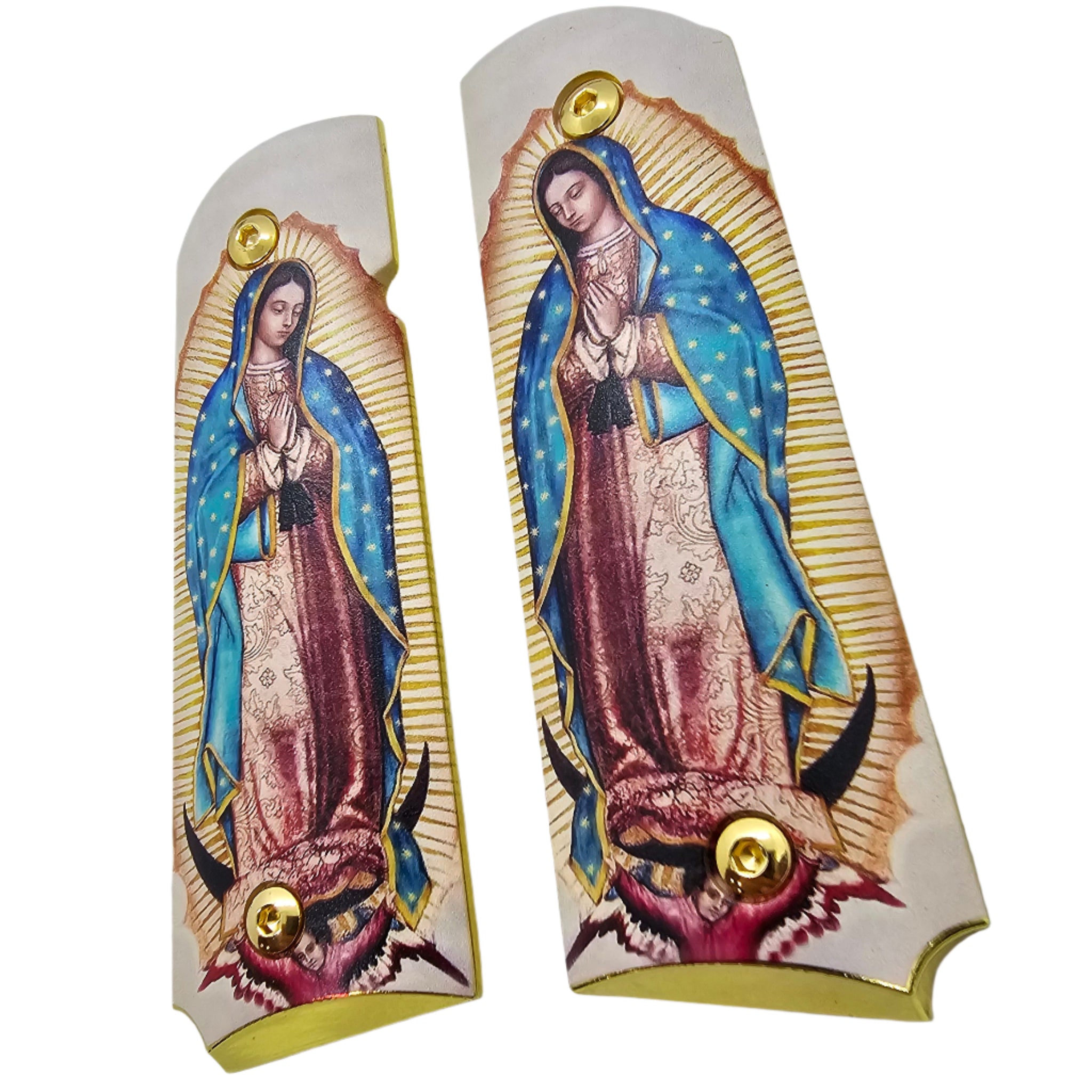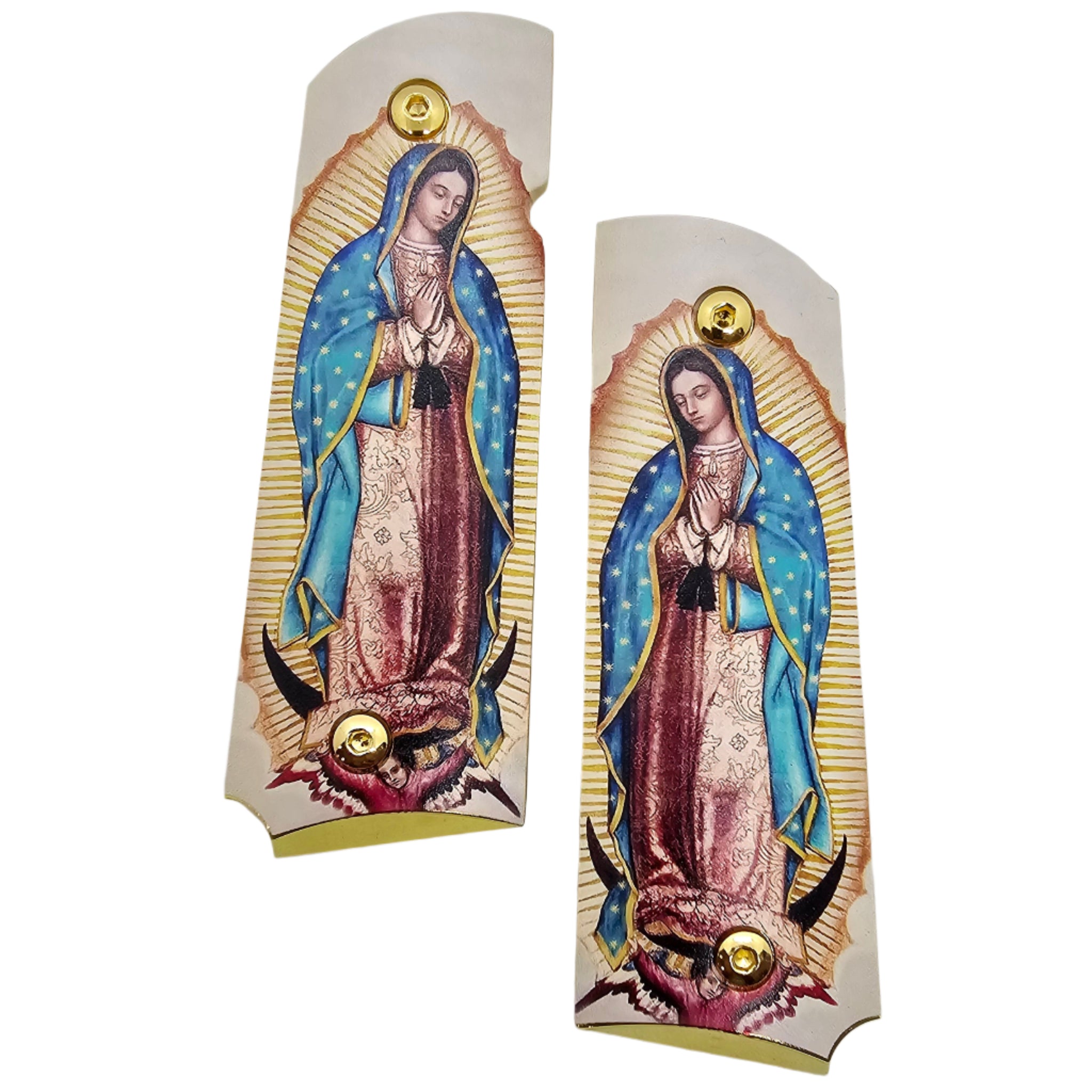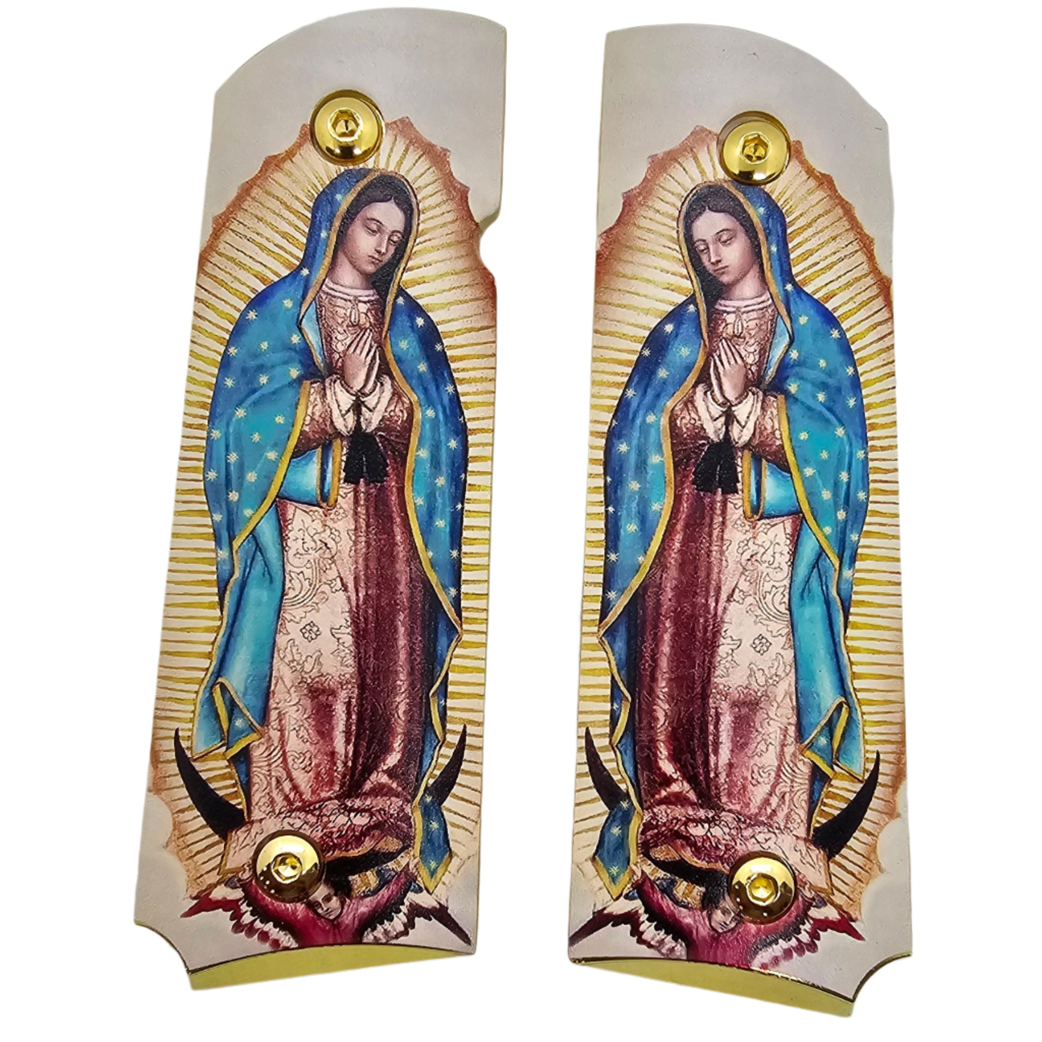 Honor faith and craftsmanship with these stunning 1911 full-size metal grips featuring a detailed and vibrant image of Our Lady of Guadalupe. The Blessed Virgin is depicted in her traditional posture, surrounded by golden rays and draped in her flowing blue starry mantle. The beautiful religious artwork adds both elegance and spiritual meaning to your firearm.