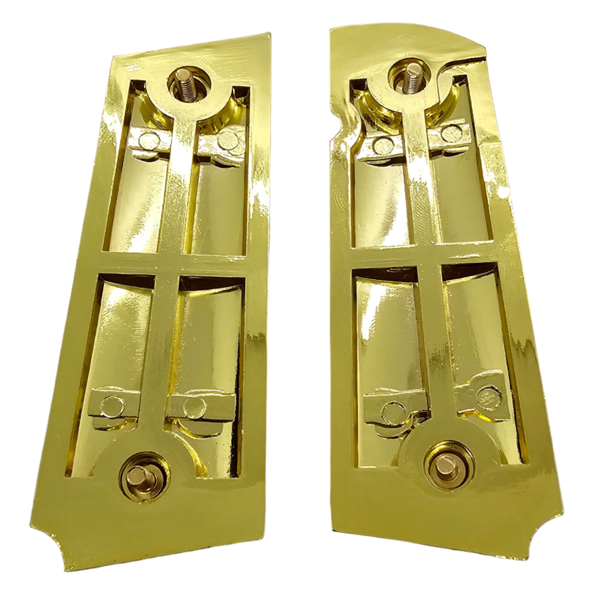 Constructed from solid metal with a high-gloss polished finish, these grips offer exceptional durability and a smooth, eye-catching look. The gold-tone back adds strength and style, while the ambidextrous safety cut ensures perfect compatibility with all standard full-size 1911 pistols.