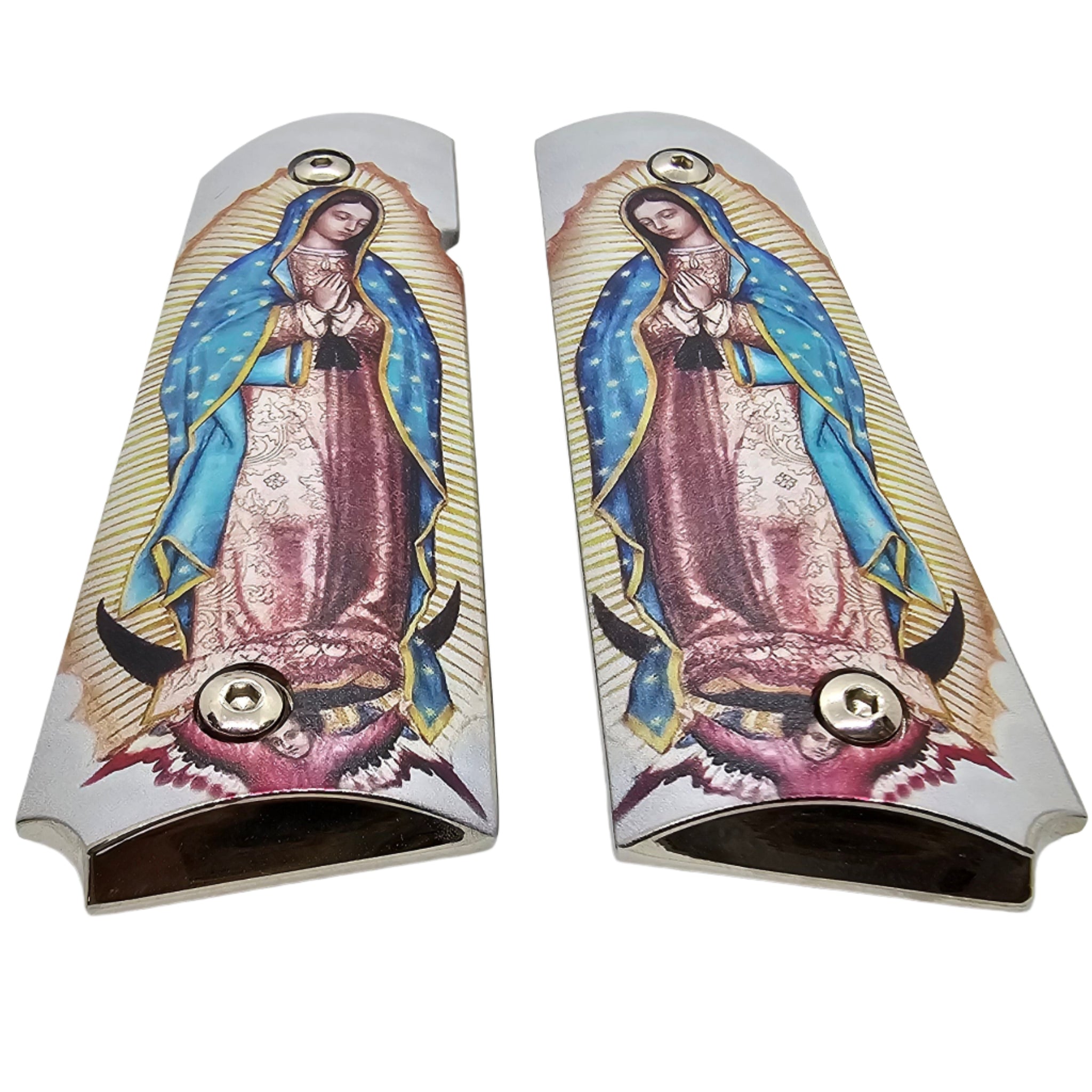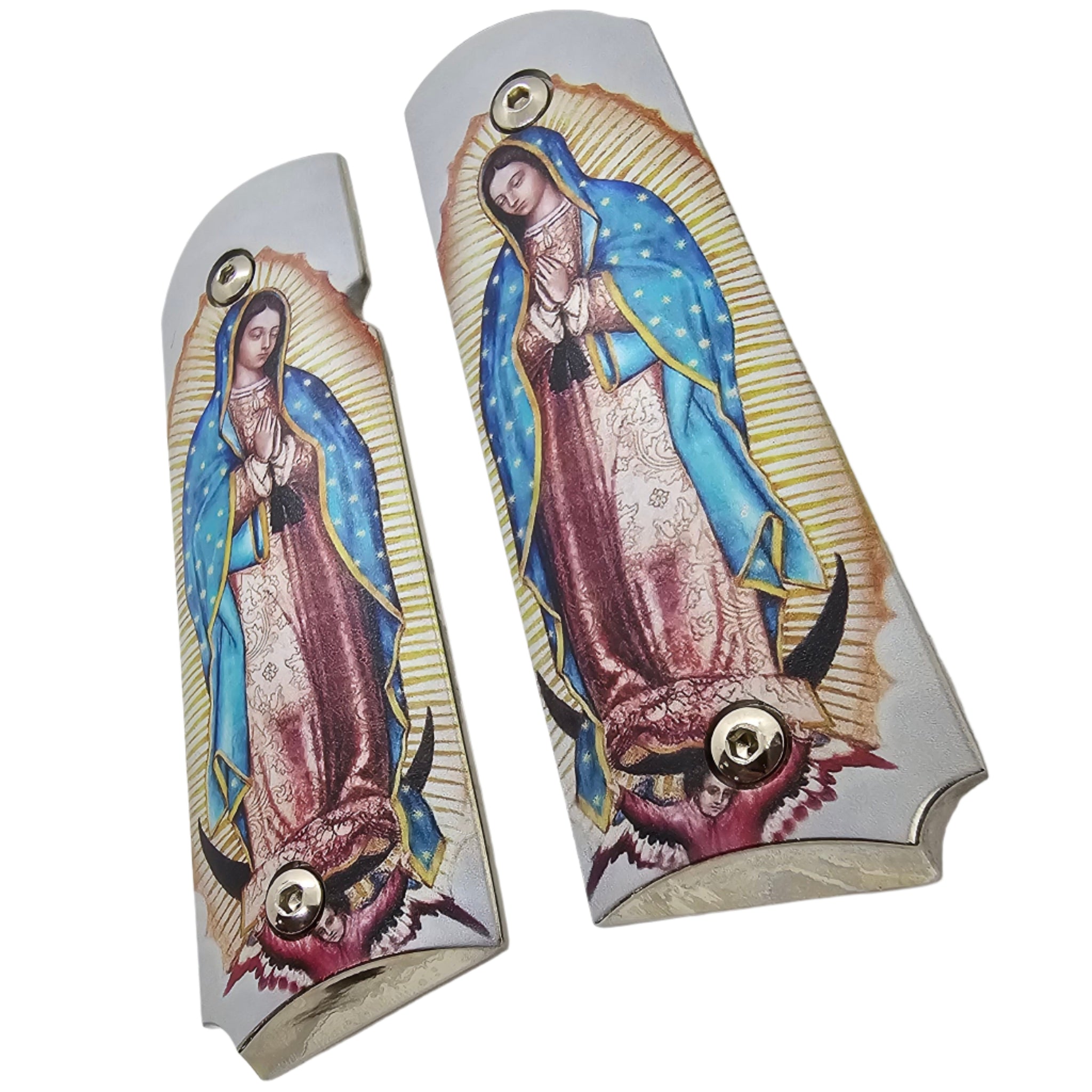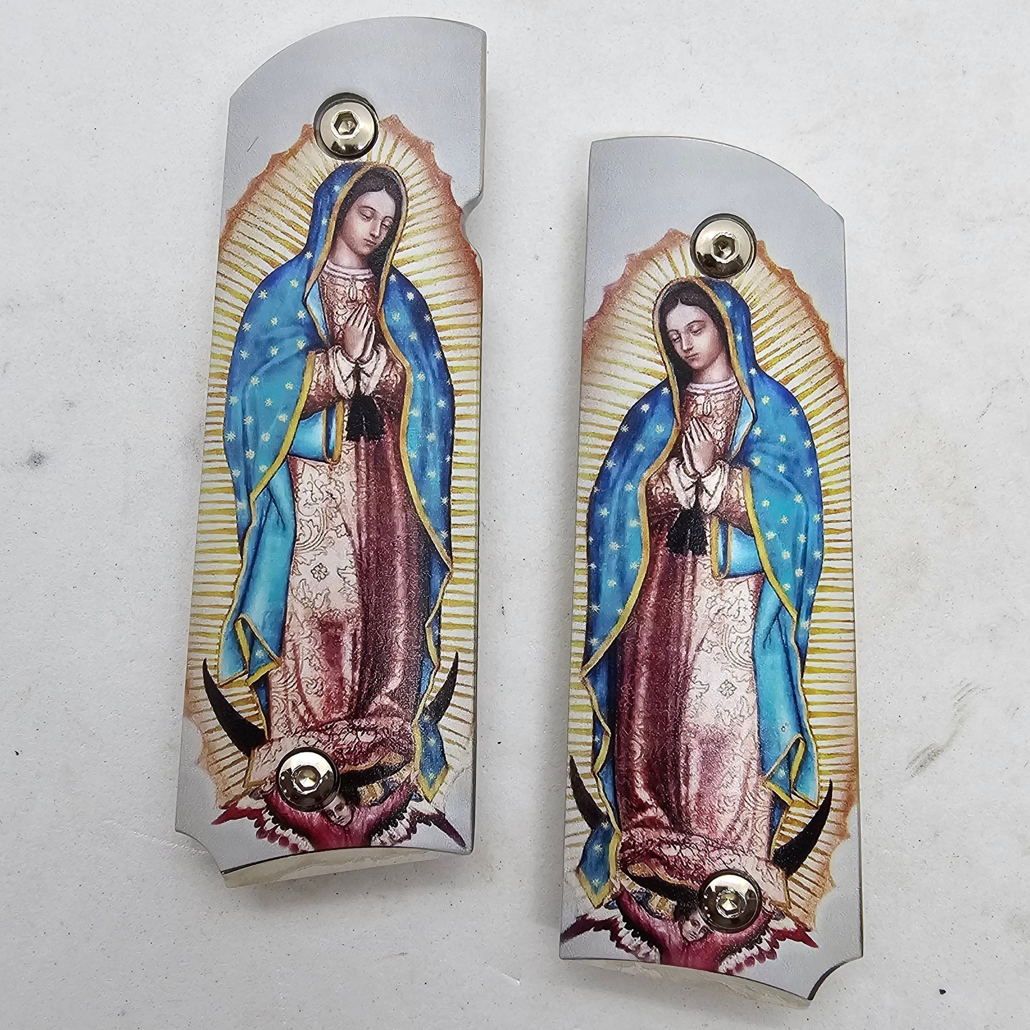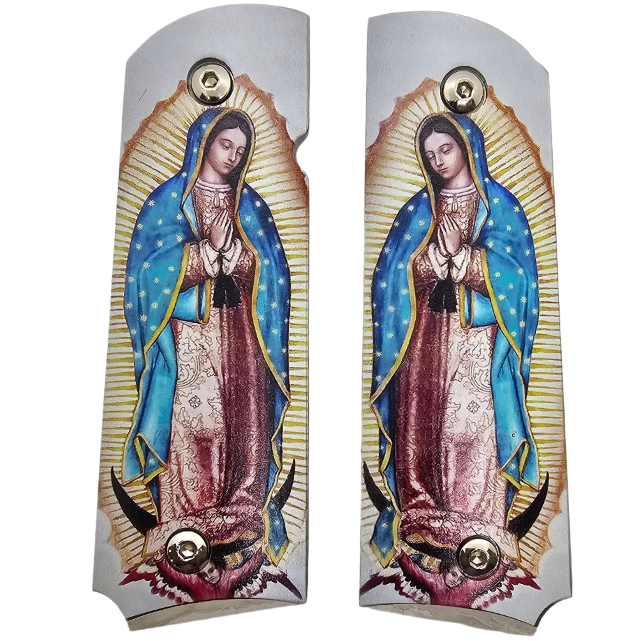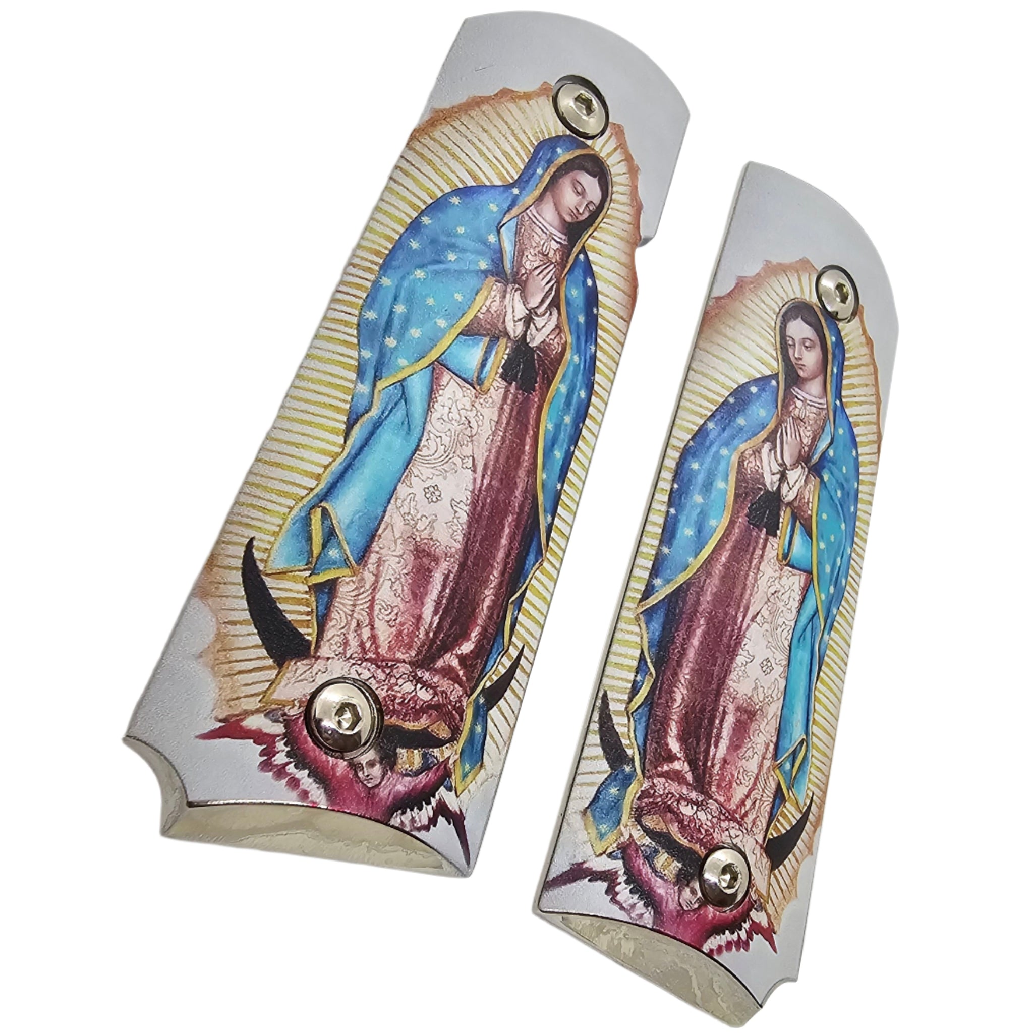 Honor faith and craftsmanship with these stunning 1911 full-size metal grips featuring a detailed and vibrant image of Our Lady of Guadalupe. The Blessed Virgin is depicted in her traditional posture, surrounded by golden rays and draped in her flowing blue starry mantle. The beautiful religious artwork adds both elegance and spiritual meaning to your firearm.