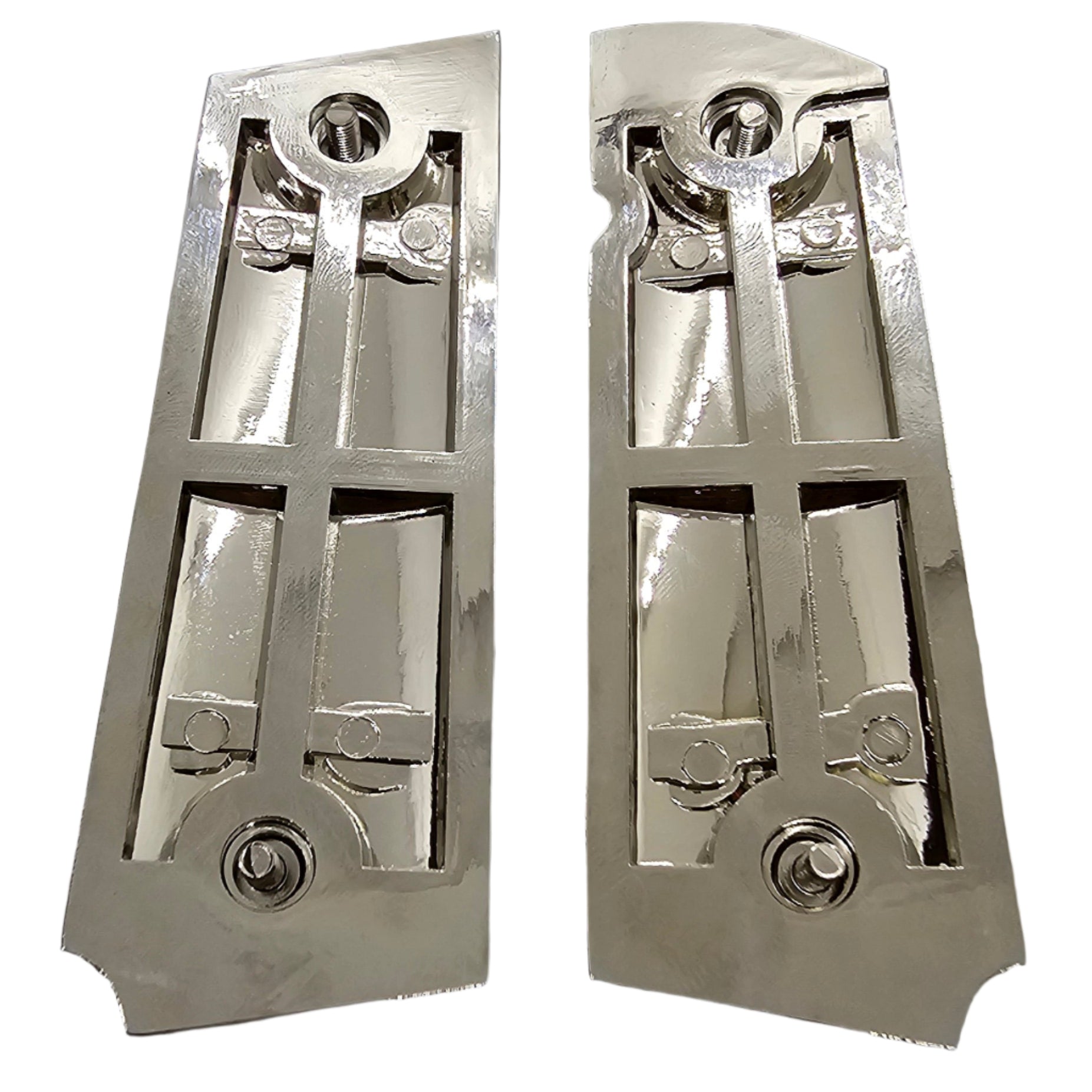 Constructed from solid metal with a high-gloss polished finish, these grips offer exceptional durability and a smooth, eye-catching look. The nickel-tone back adds strength and style, while the ambidextrous safety cut ensures perfect compatibility with all standard full-size 1911 pistols.