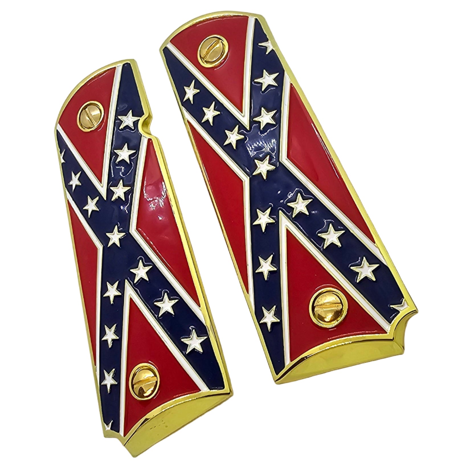 Give your 1911 a standout look with these full-size metal grips. Each panel features a detailed flag-style design set into a glossy enamel surface, surrounded by a polished gold-plated border/base that really pops on the pistol.