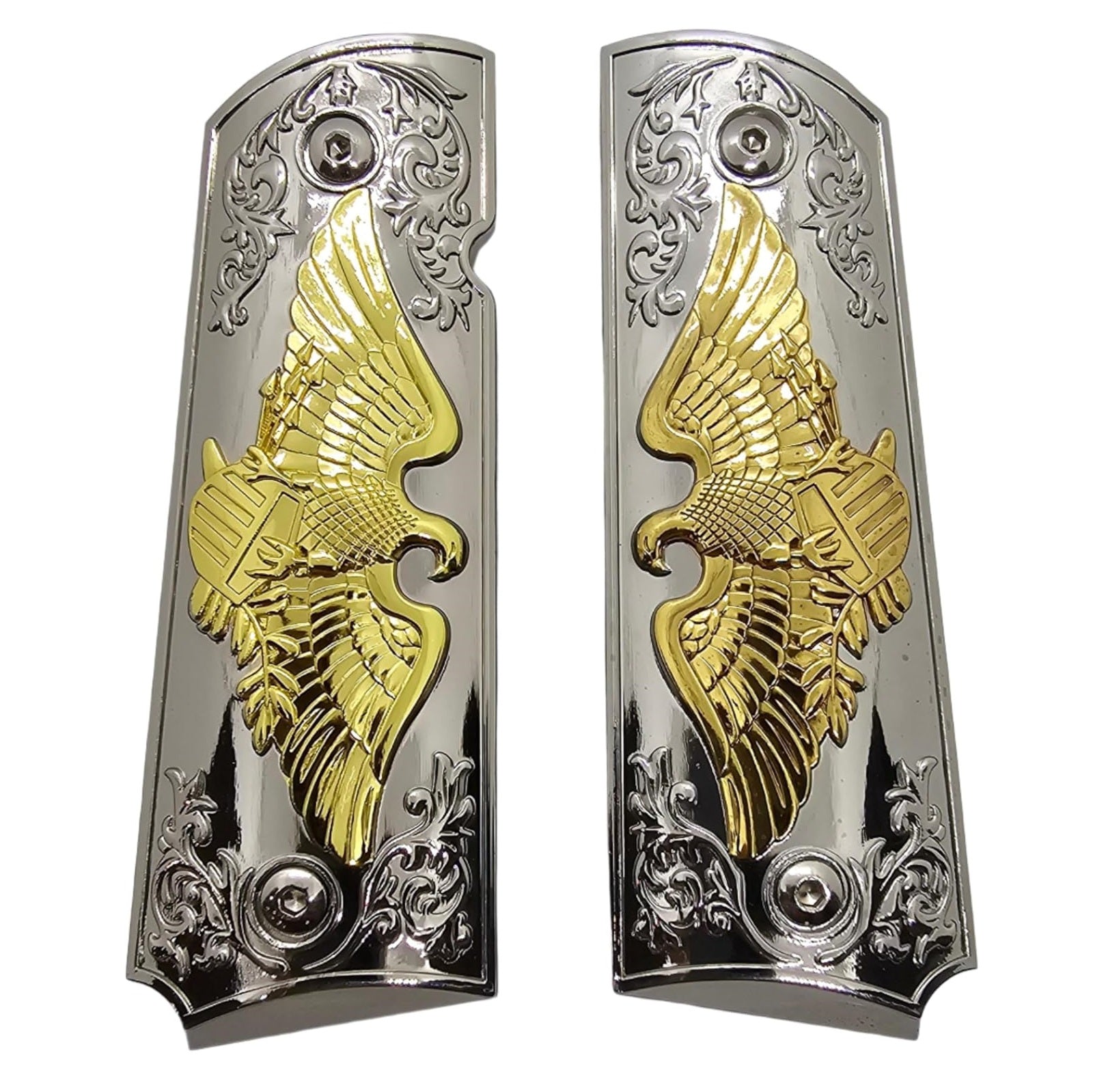 Add prestige and strength to your 1911 with these Silver & Gold Eagle Metal Grips. The brilliant mirror-silver finish paired with a raised golden eagle and detailed floral engraving delivers a striking look that commands attention. Crafted from a durable cast metal alloy, these grips offer a secure hold, perfect alignment, and long-lasting shine — ideal for display or range use alike.