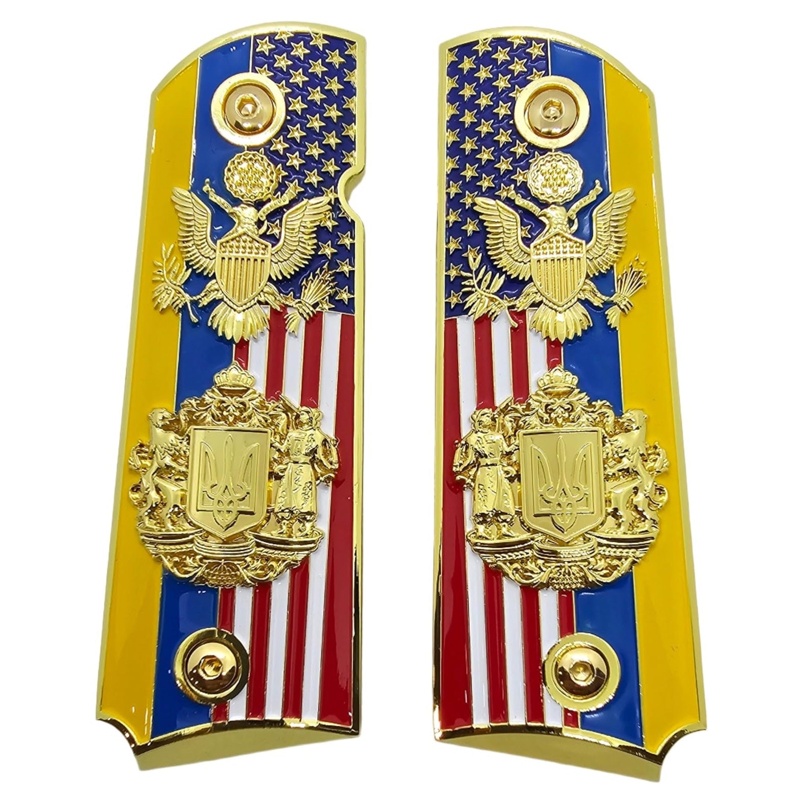 Show solidarity and pride with these USA–Ukraine Flag 1911 Metal Grips, featuring both nations’ emblems and flags in a unified design. The brilliant gold-plated finish contrasts against the red, white, blue, and yellow enamel for a powerful and patriotic statement. Each grip proudly displays the American bald eagle crest and the Ukrainian trident coat of arms, symbolizing strength, unity, and freedom. Crafted from high-quality cast metal alloy for lasting durability and a premium feel.