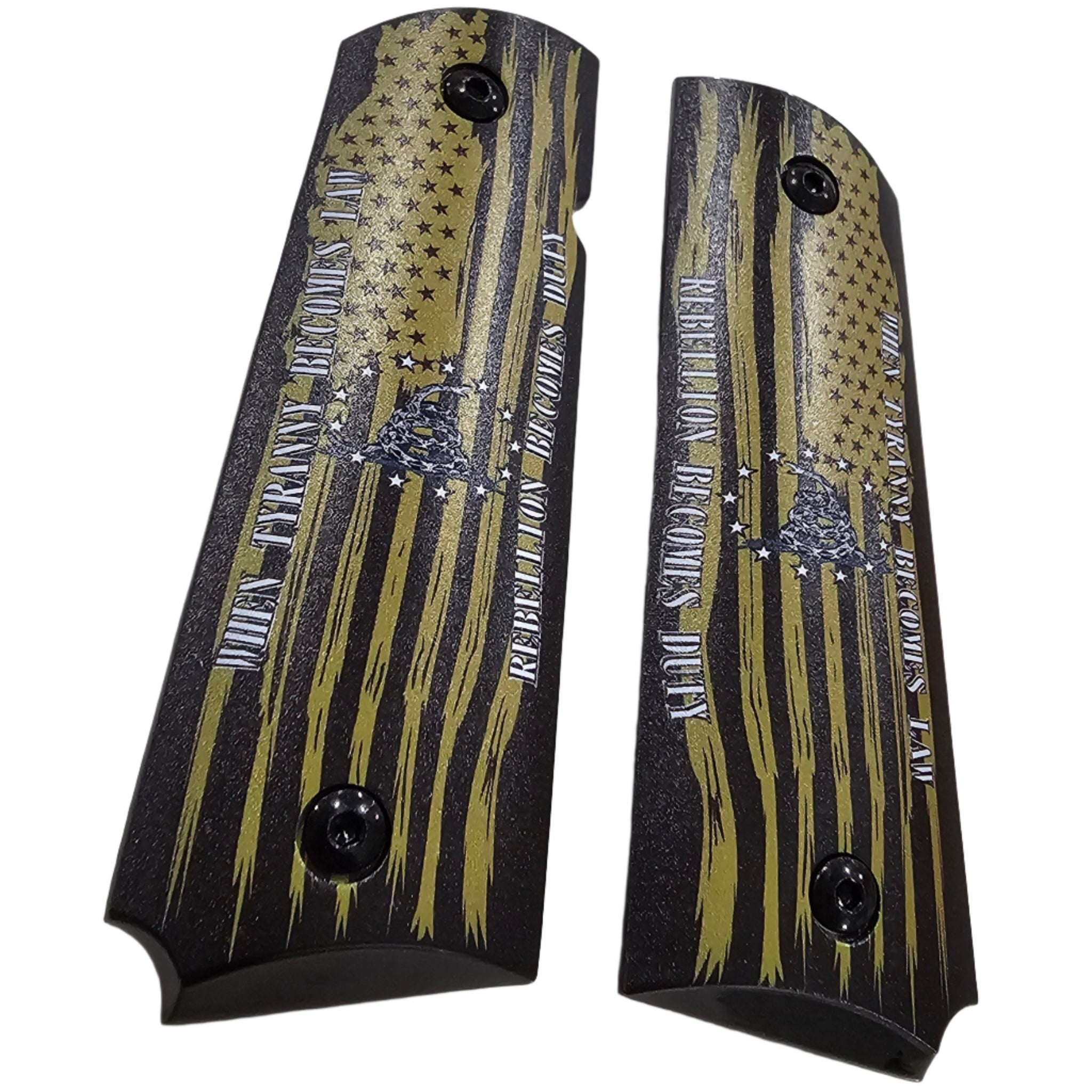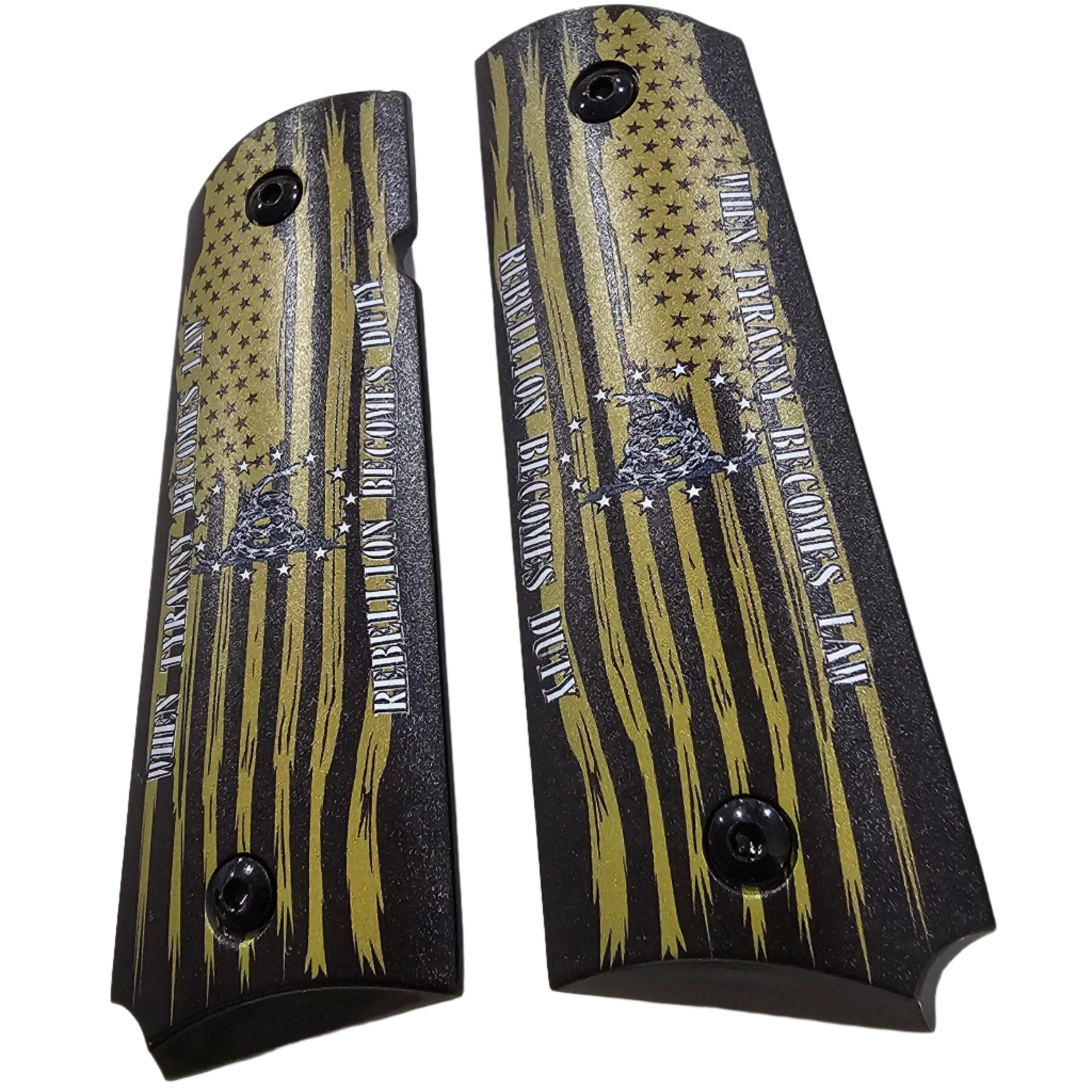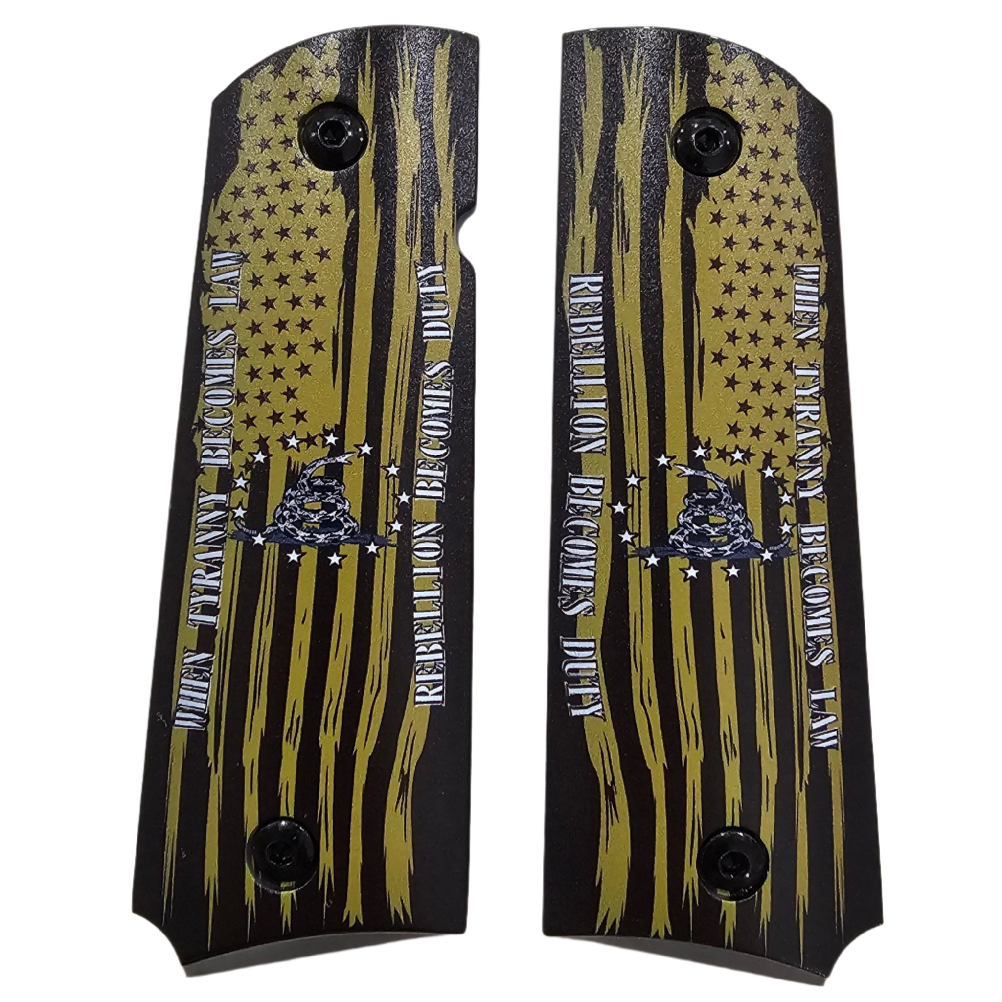 Make a bold statement with these custom 1911 full-size grips featuring a distressed yellow-and-black American flag design, a coiled rattlesnake, and the powerful quote: