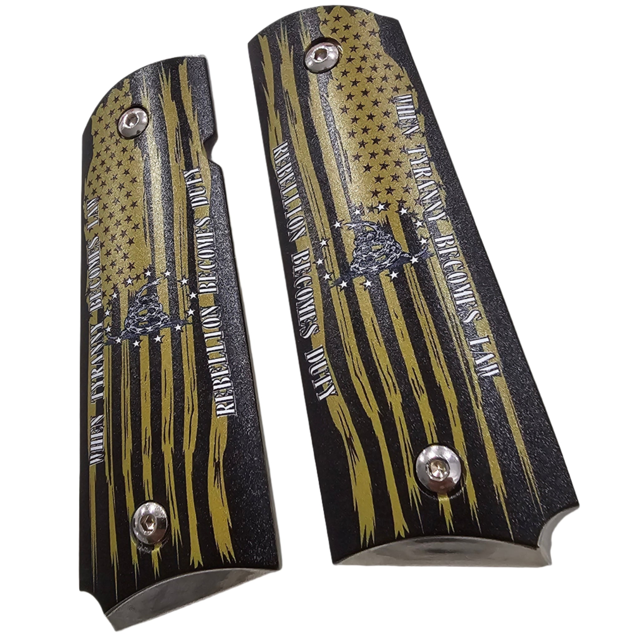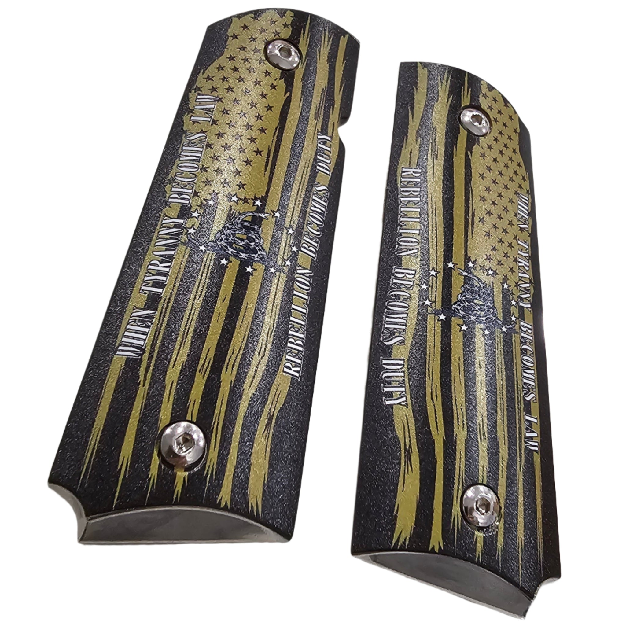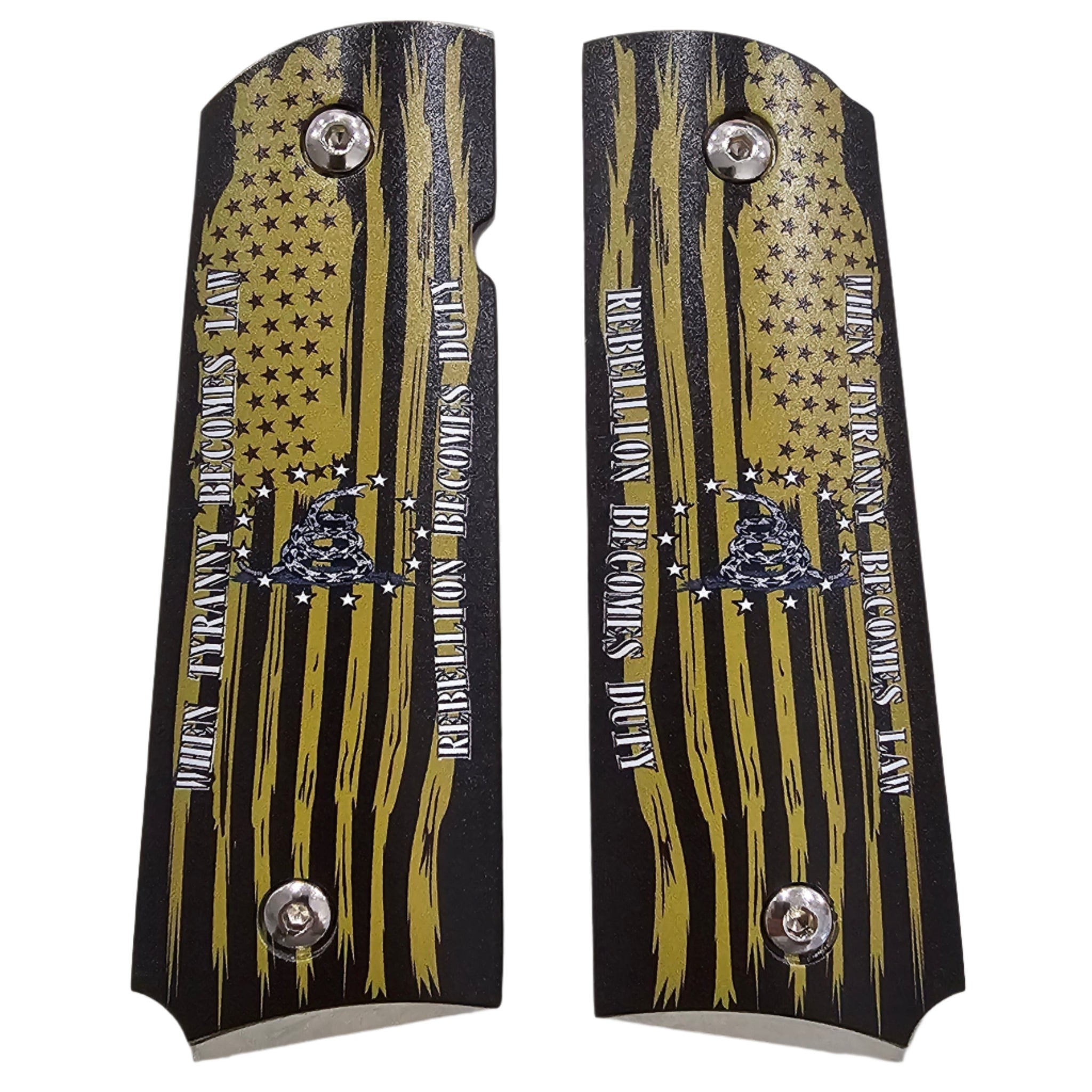Make a bold statement with these custom 1911 full-size grips featuring a distressed yellow-and-black American flag design, a coiled rattlesnake, and the powerful quote: