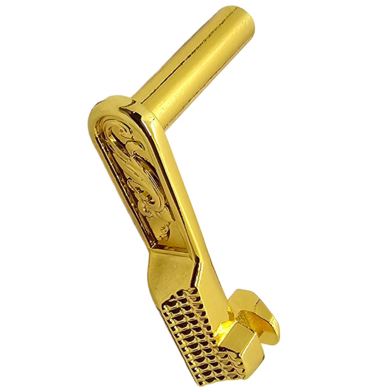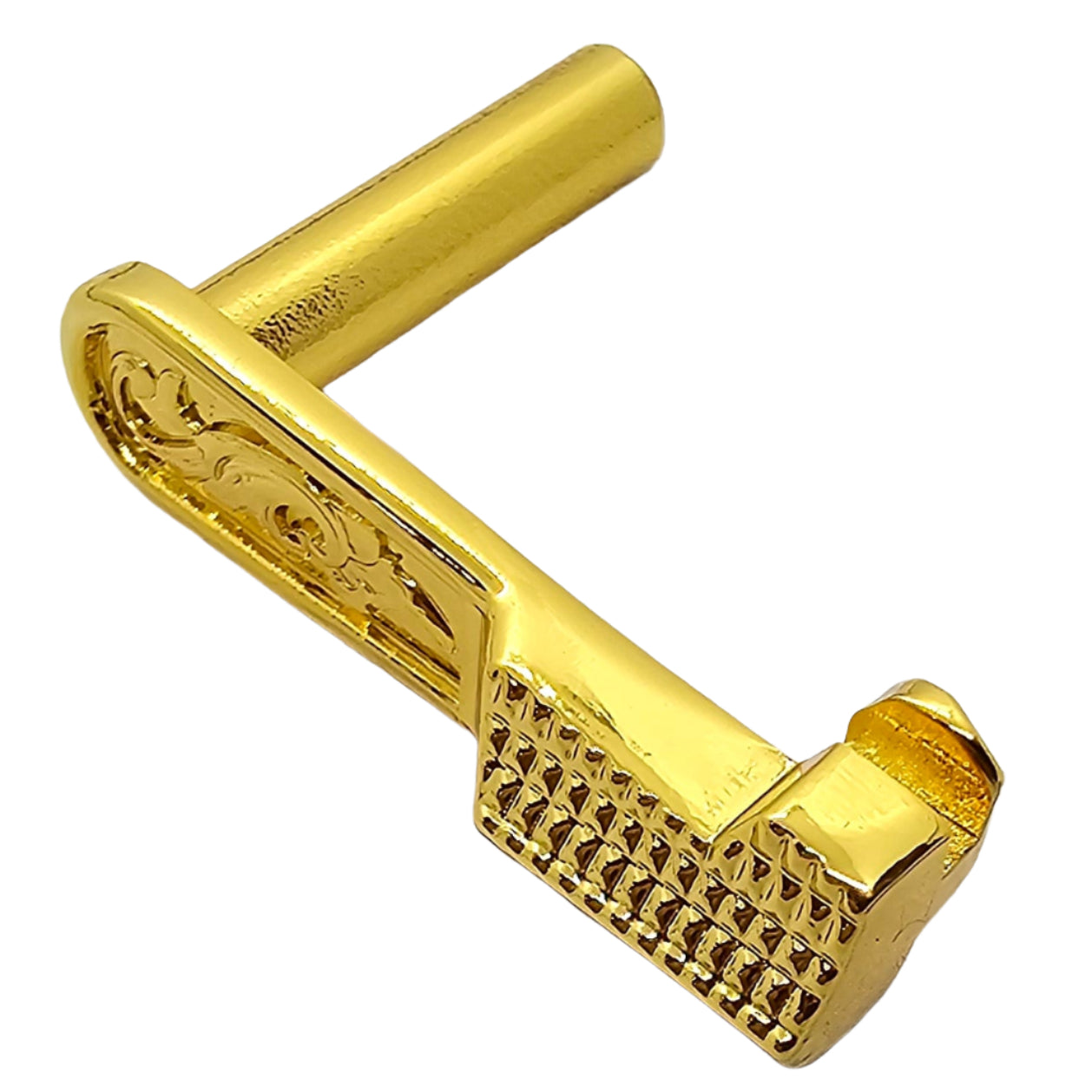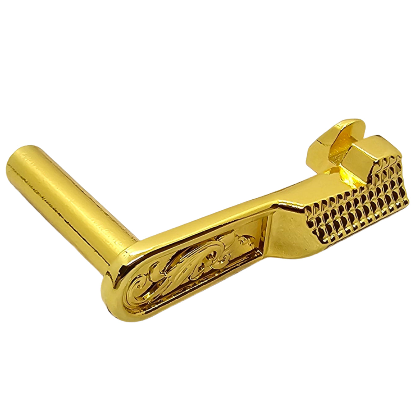 Give your 1911 a luxury upgrade with this engraved slide stop, crafted from durable steel and finished in polished gold plating. Designed to fit both full-size Government and compact 1911 pistols, this custom part combines strength, reliability, and high-end style.