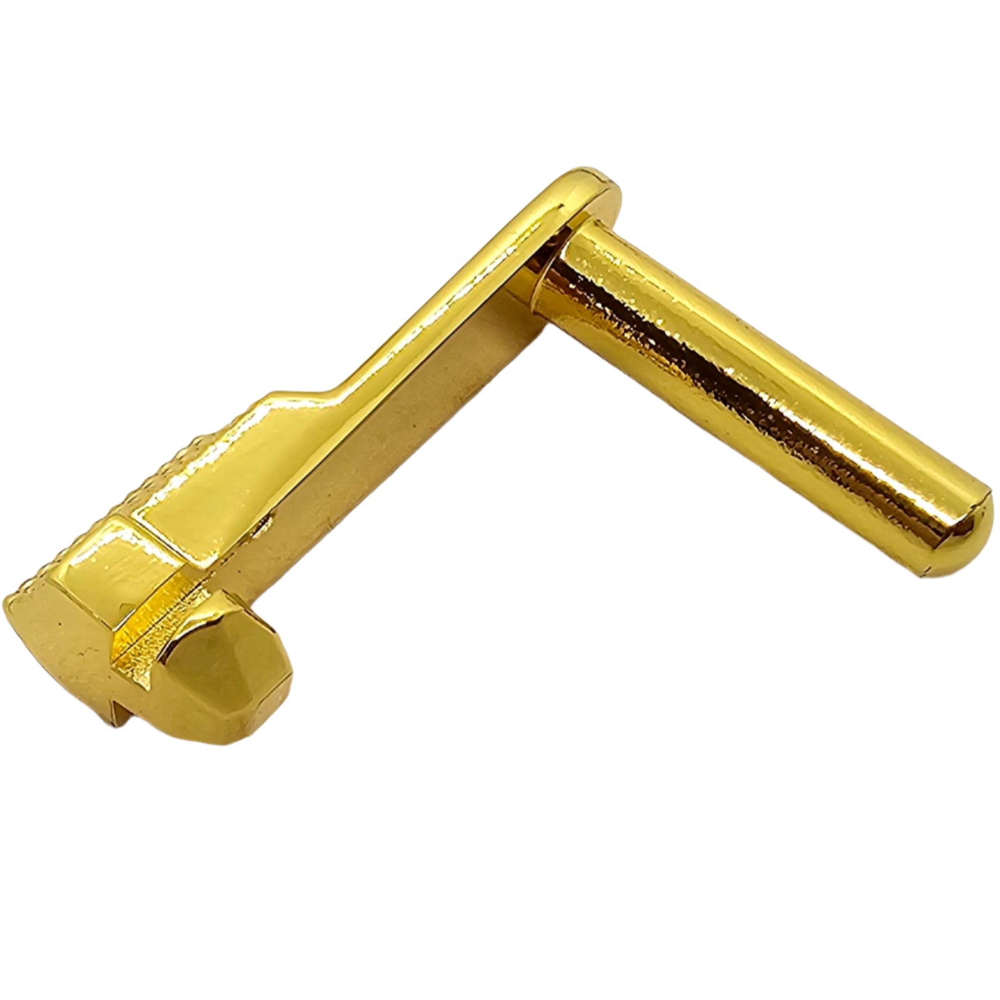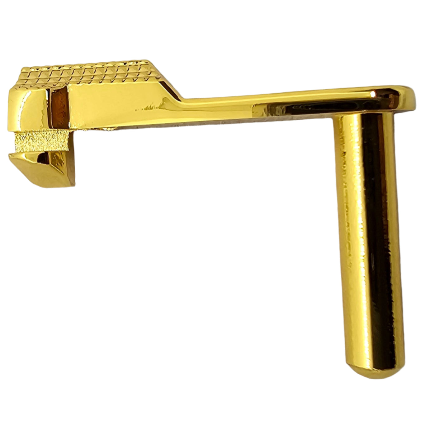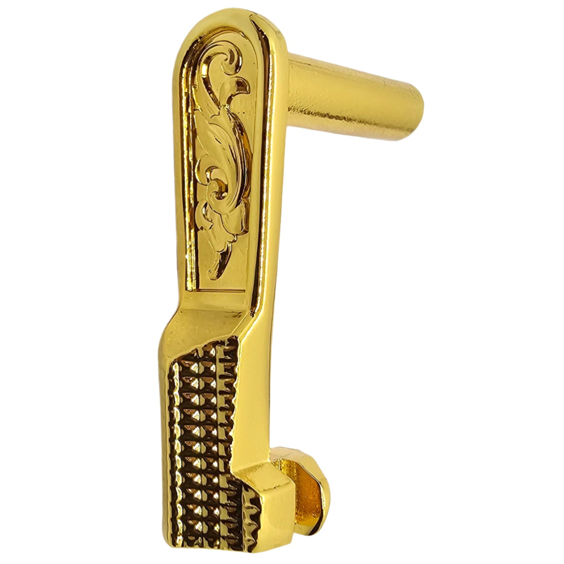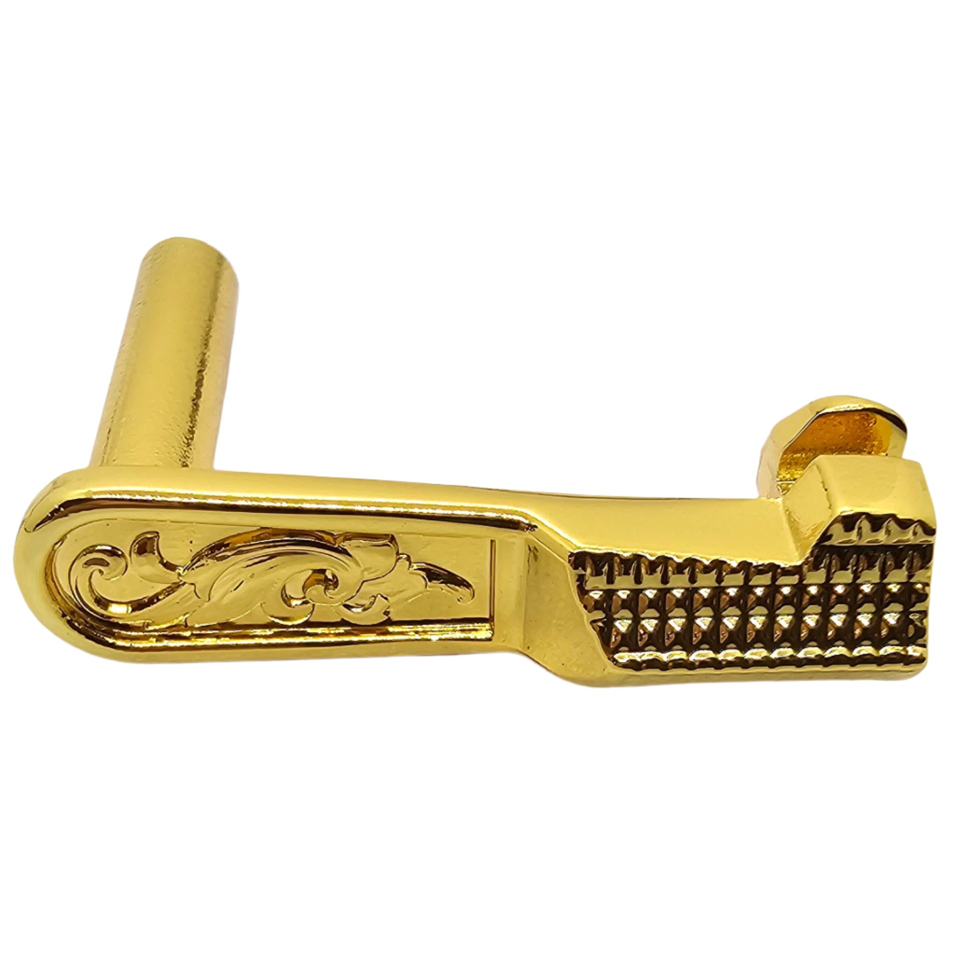 Give your 1911 a luxury upgrade with this engraved slide stop, crafted from durable steel and finished in polished gold plating. Designed to fit both full-size Government and compact 1911 pistols, this custom part combines strength, reliability, and high-end style.