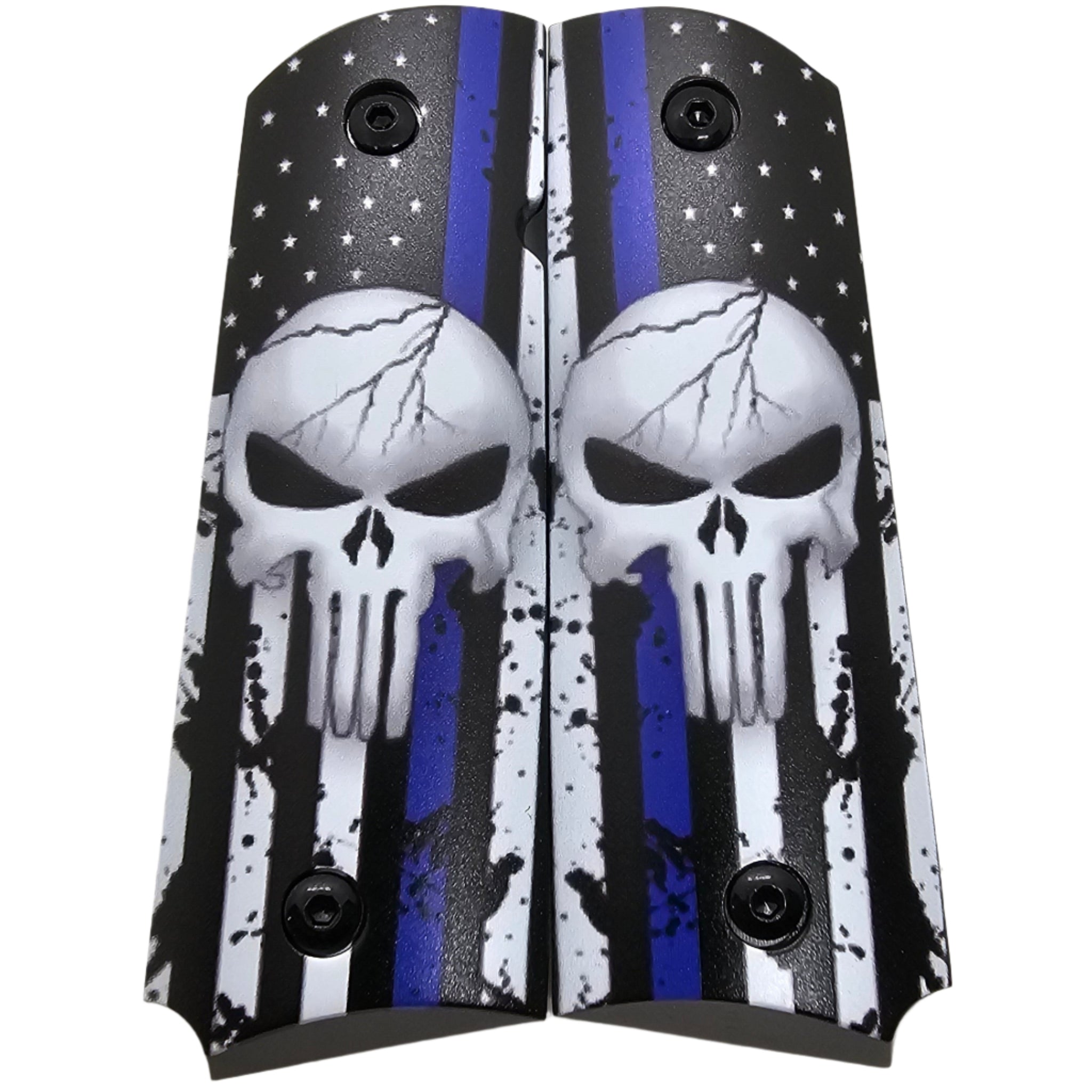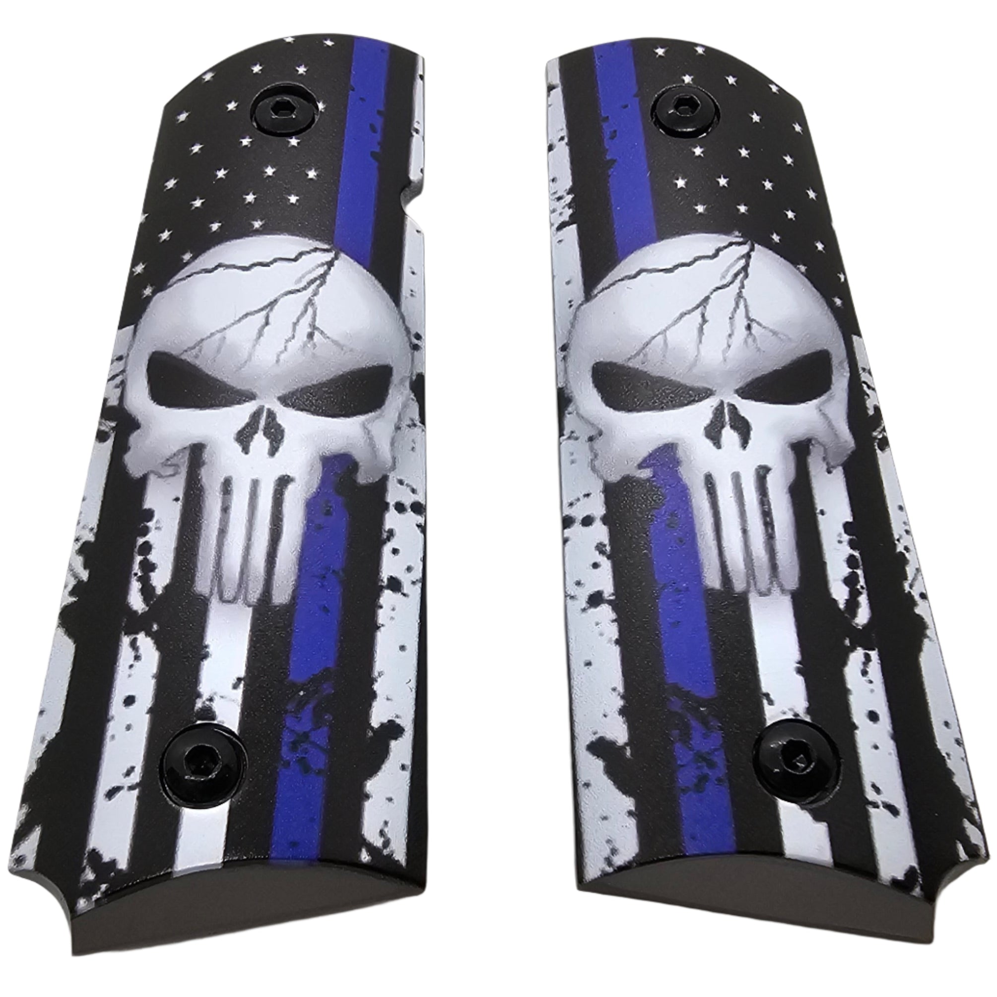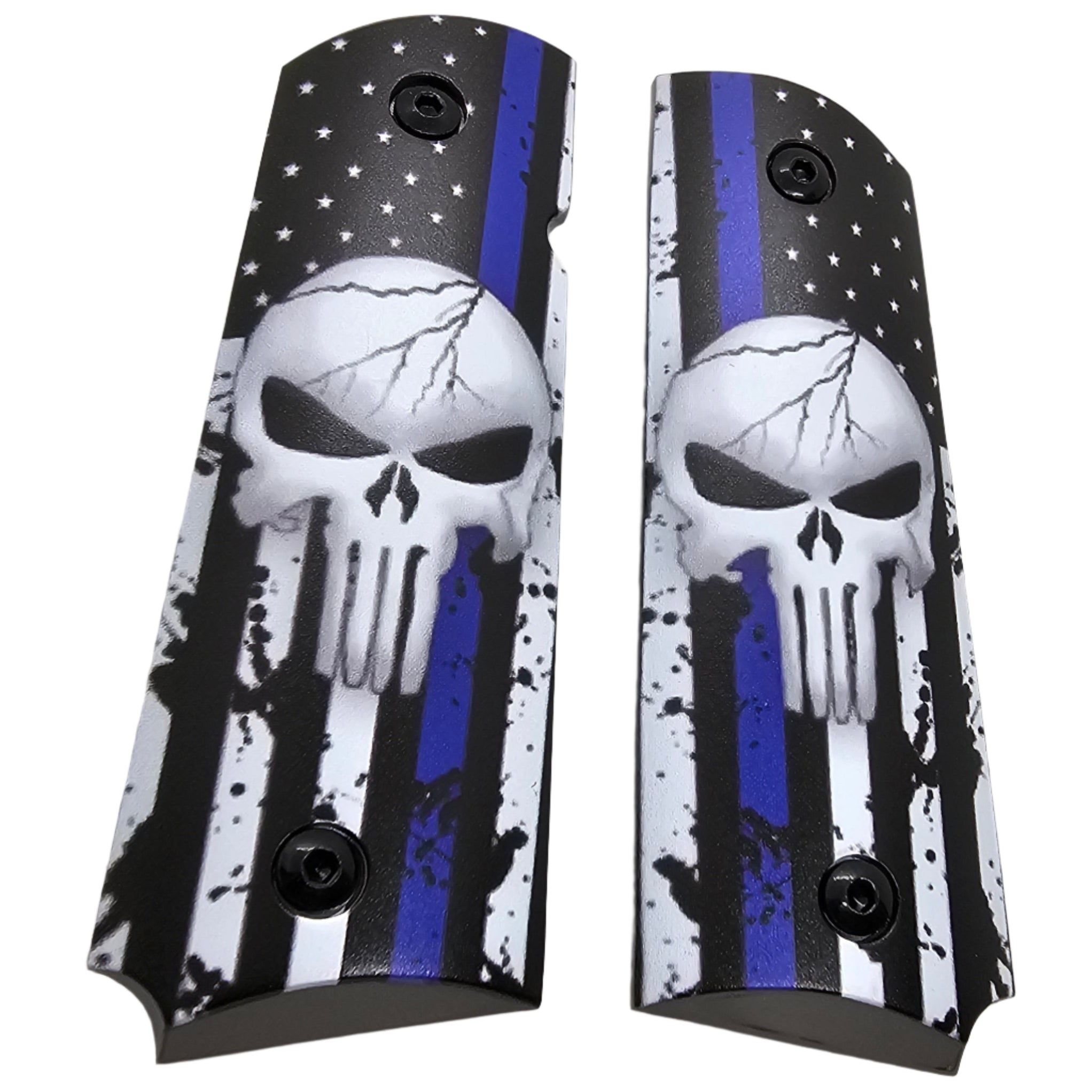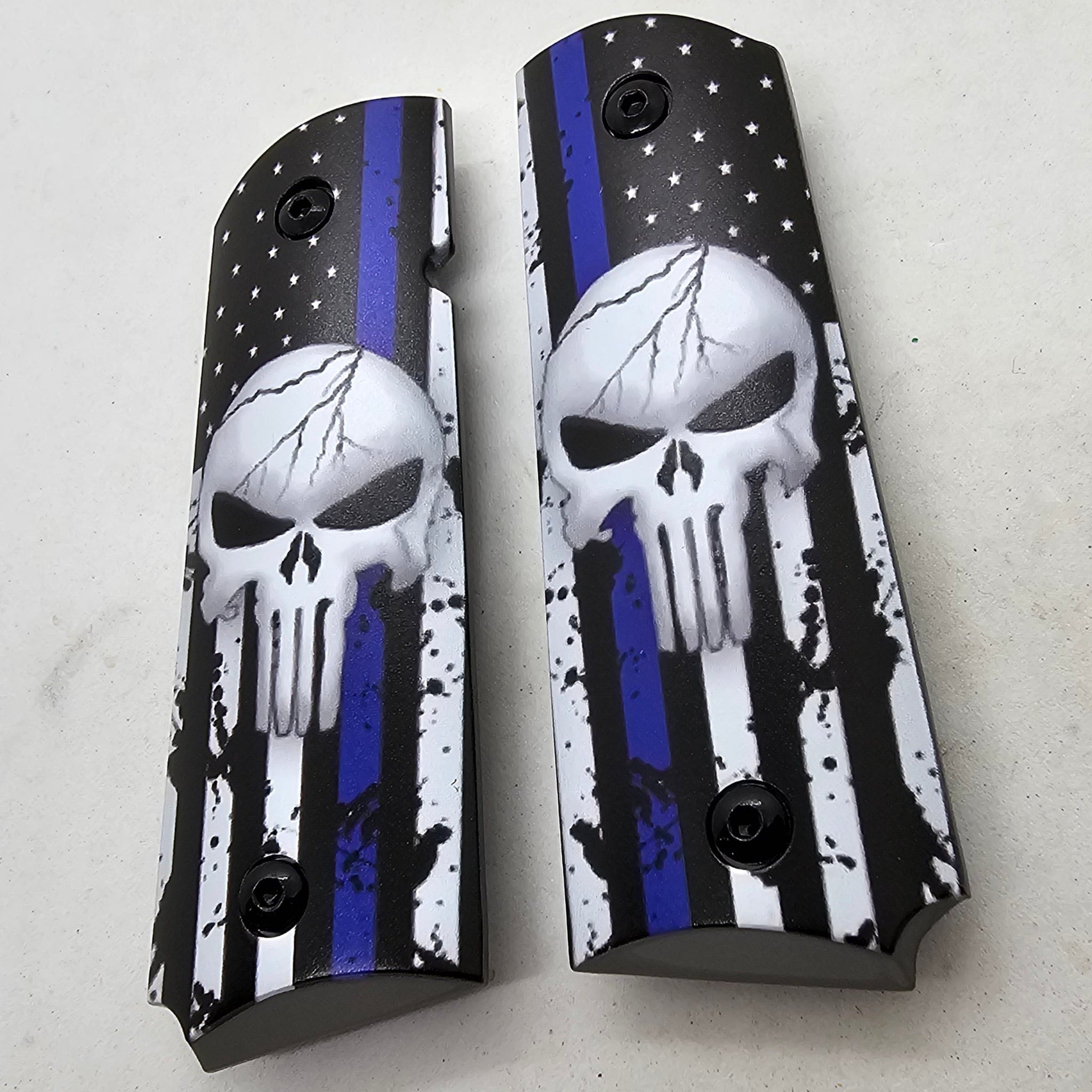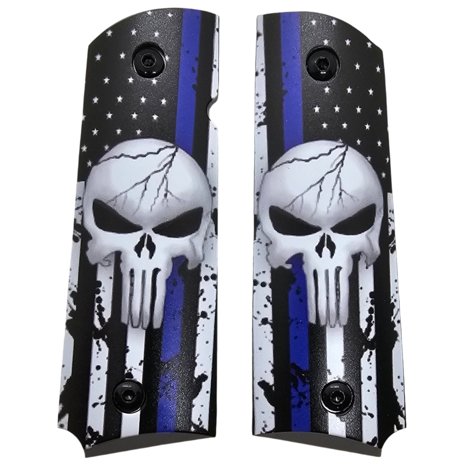 Bring bold style and tactical pride to your 1911 with these custom full-size grips. Featuring a high-definition Punisher-style skull over a Thin Blue Line American flag, this design honors law enforcement while delivering a fierce, rugged look.