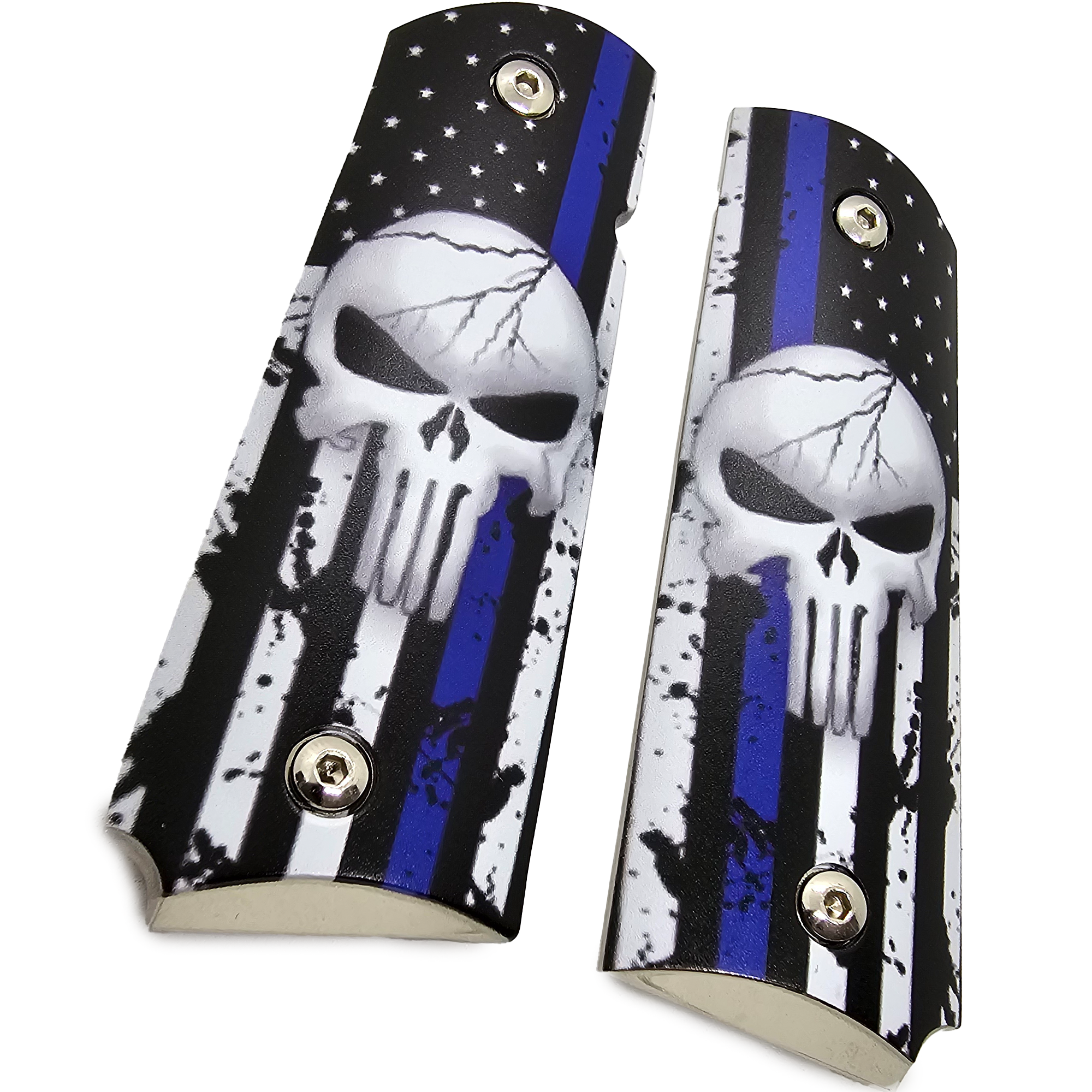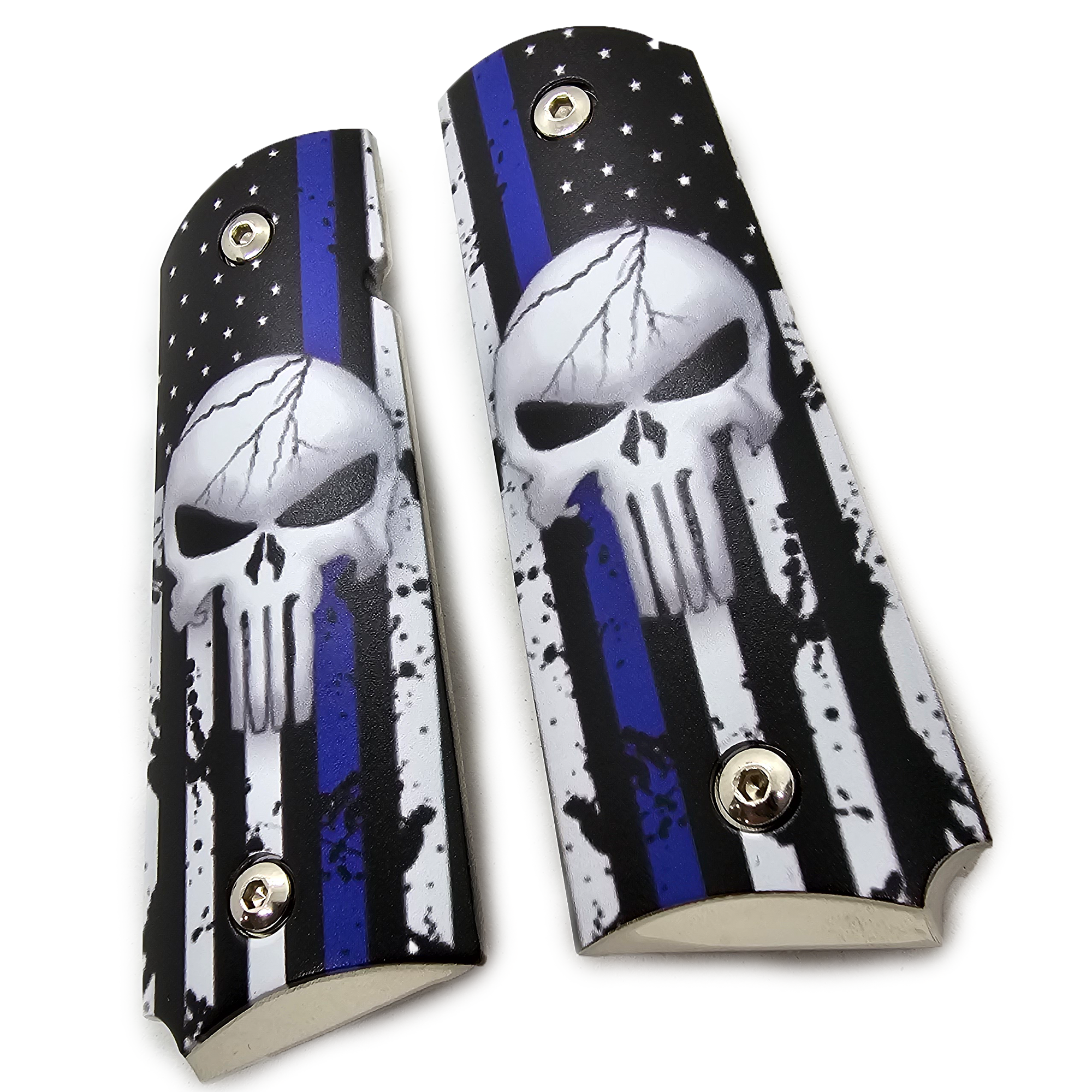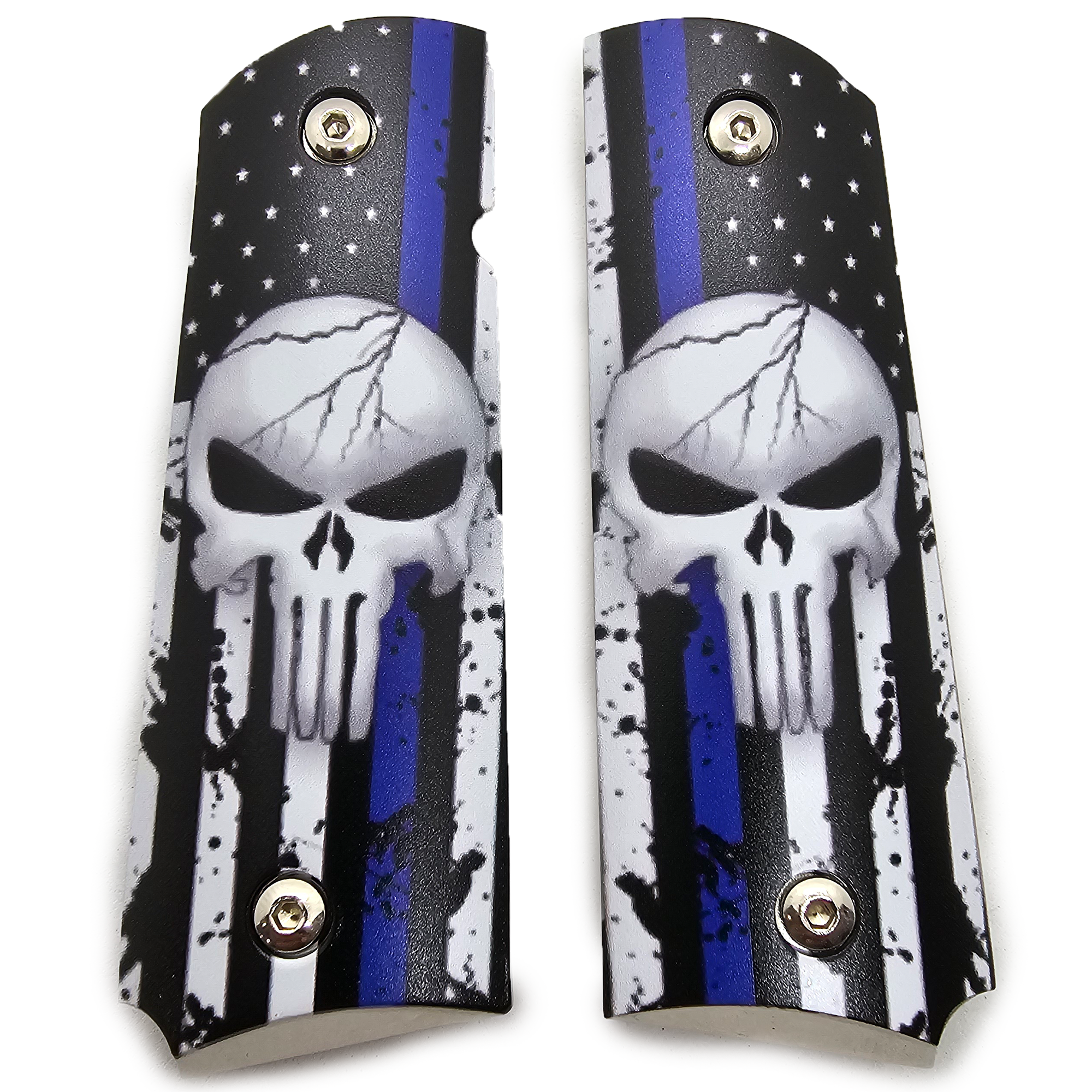 Bring bold style and tactical pride to your 1911 with these custom full-size grips. Featuring a high-definition Punisher-style skull over a Thin Blue Line American flag, this design honors law enforcement while delivering a fierce, rugged look.