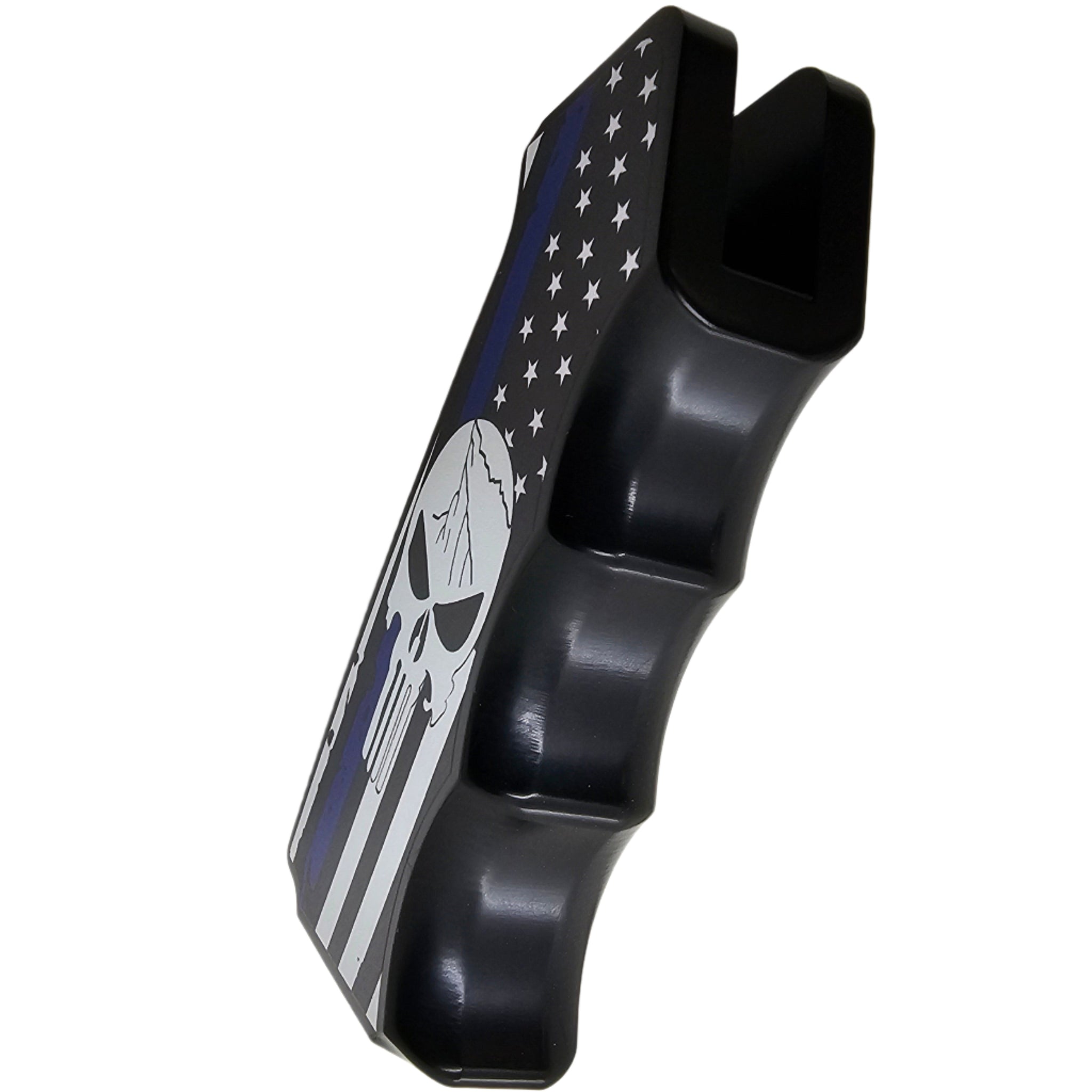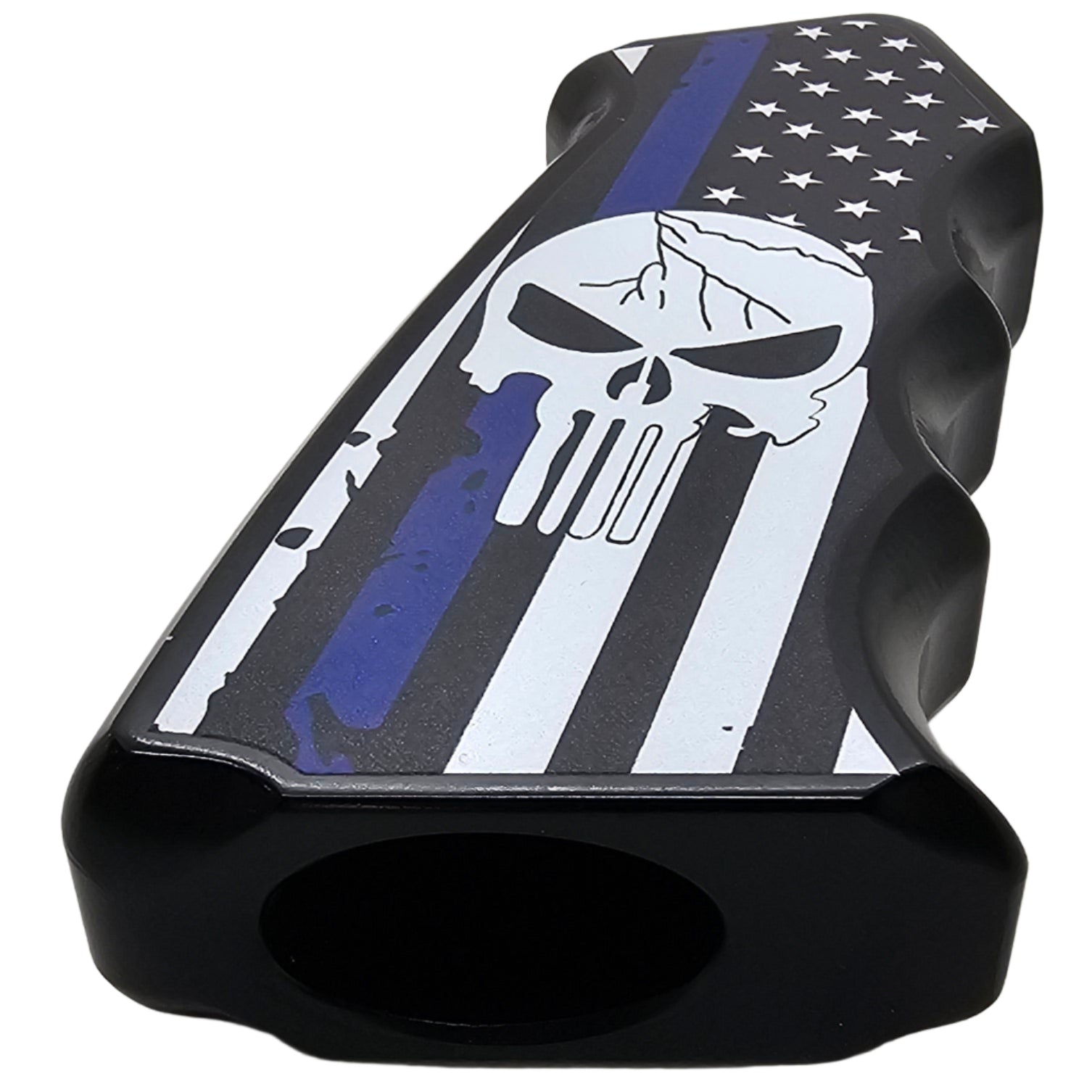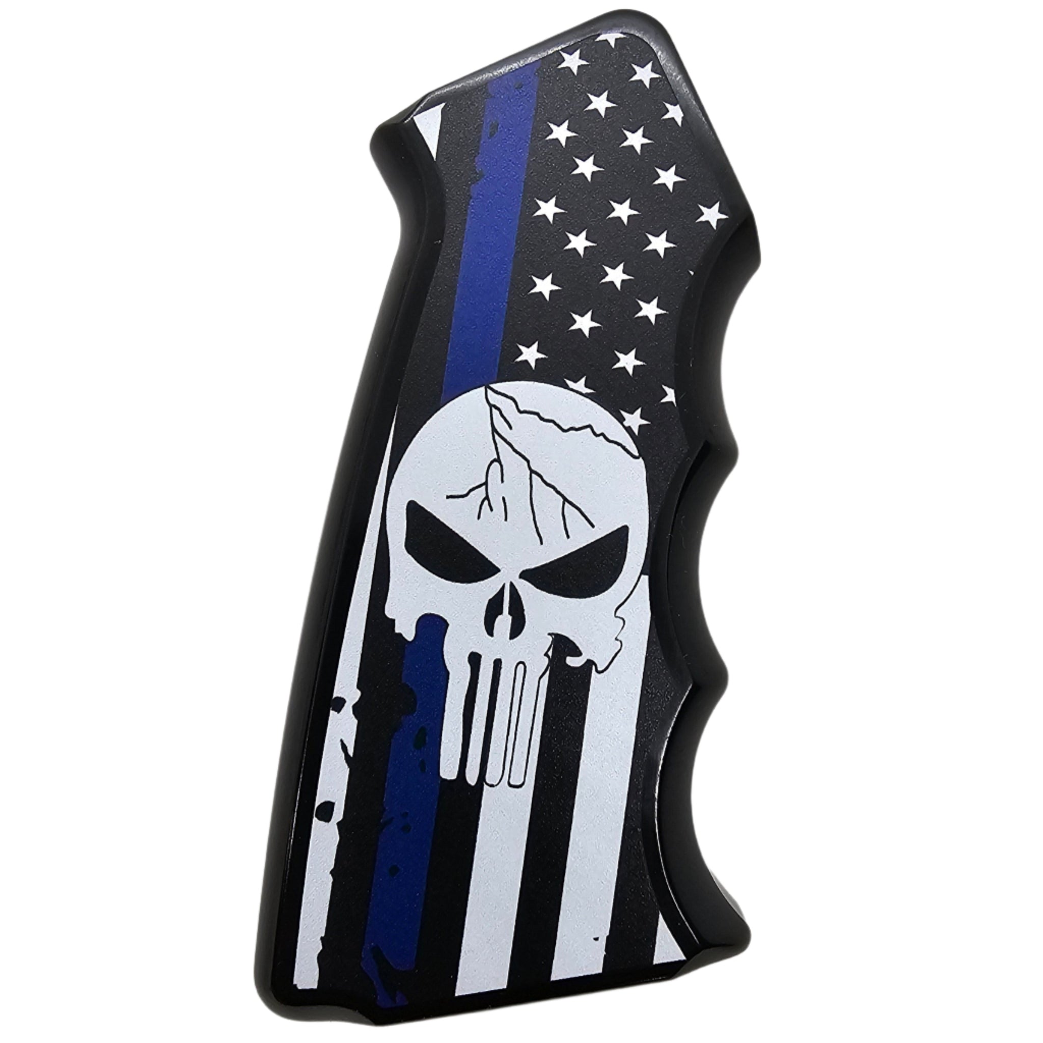 Upgrade your AR-15/M4 with this CNC-machined aluminum pistol grip, featuring a bold Thin Blue Line American Flag with a skull design. Built for durability and ergonomics, this grip delivers both high performance and a striking custom look.