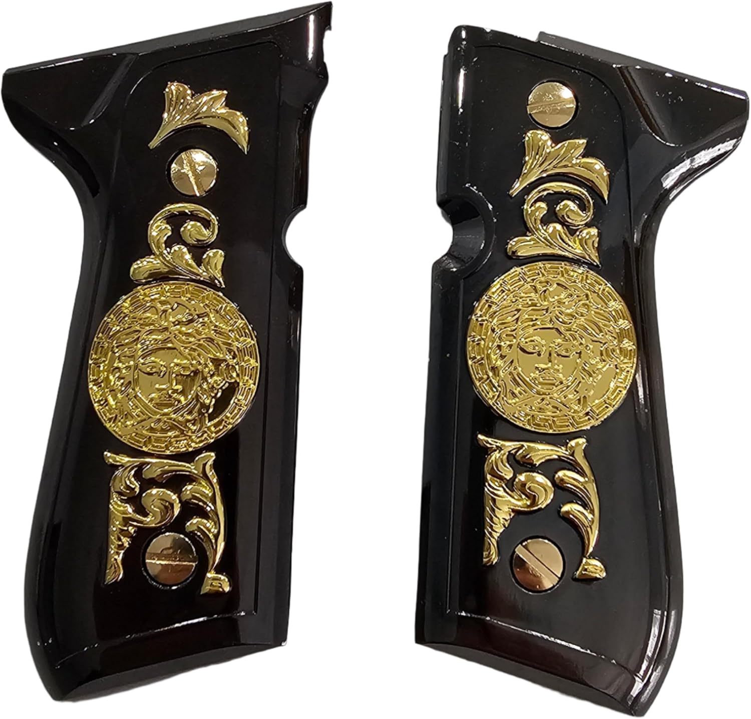 • Beretta 92 / 96 Full Size Metal Grips – Black with Gold Medusa Design (Fits 92FS, M9, 92A1, 92 INOX – Includes Screws)