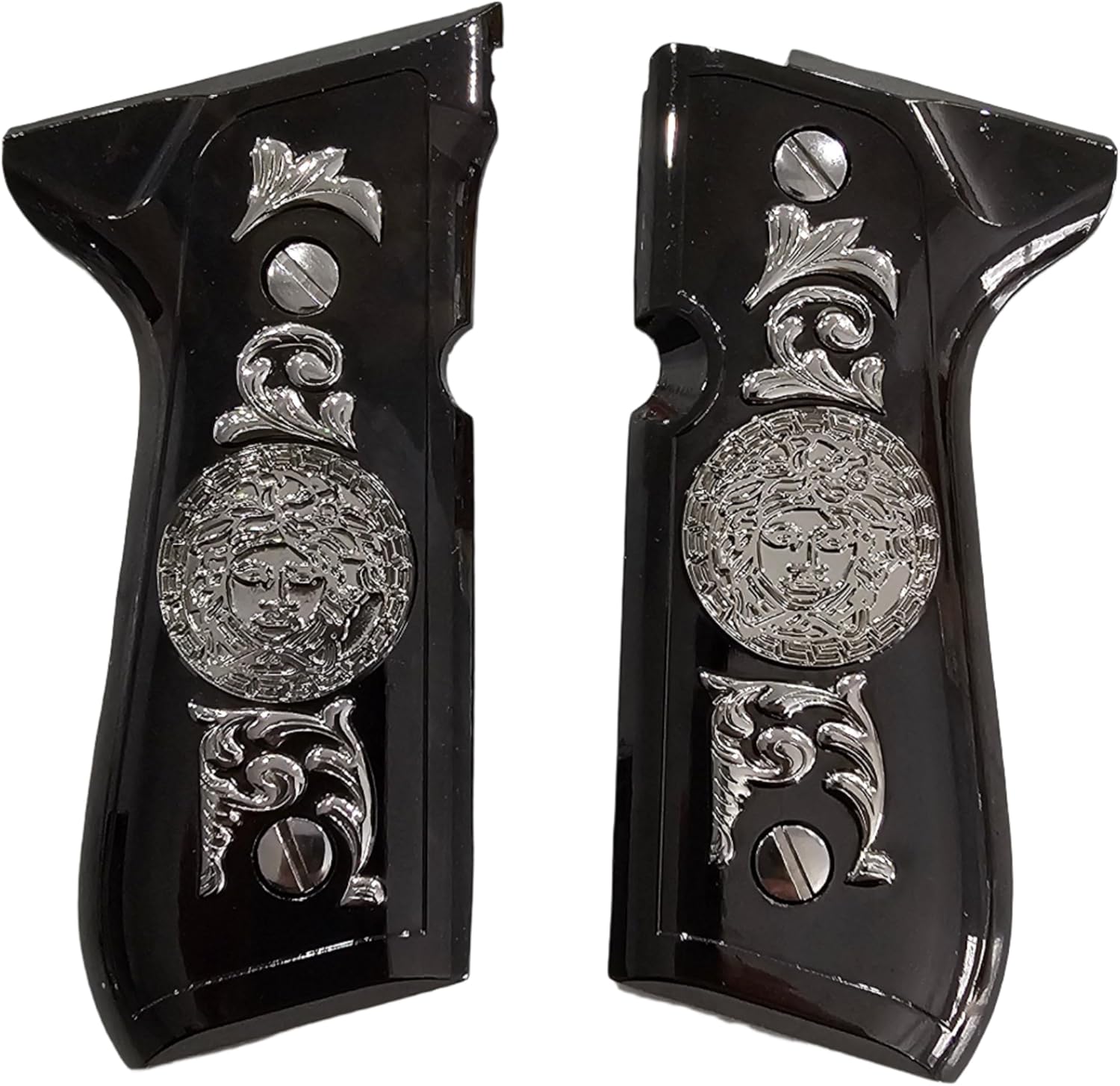 Elevate your Beretta’s look with these black full-size metal grips featuring a detailed silver Medusa emblem and ornate scroll engraving. Crafted for 92 and 96 series models, these grips deliver premium style, precision fit, and lasting durability for any enthusiast or collector.