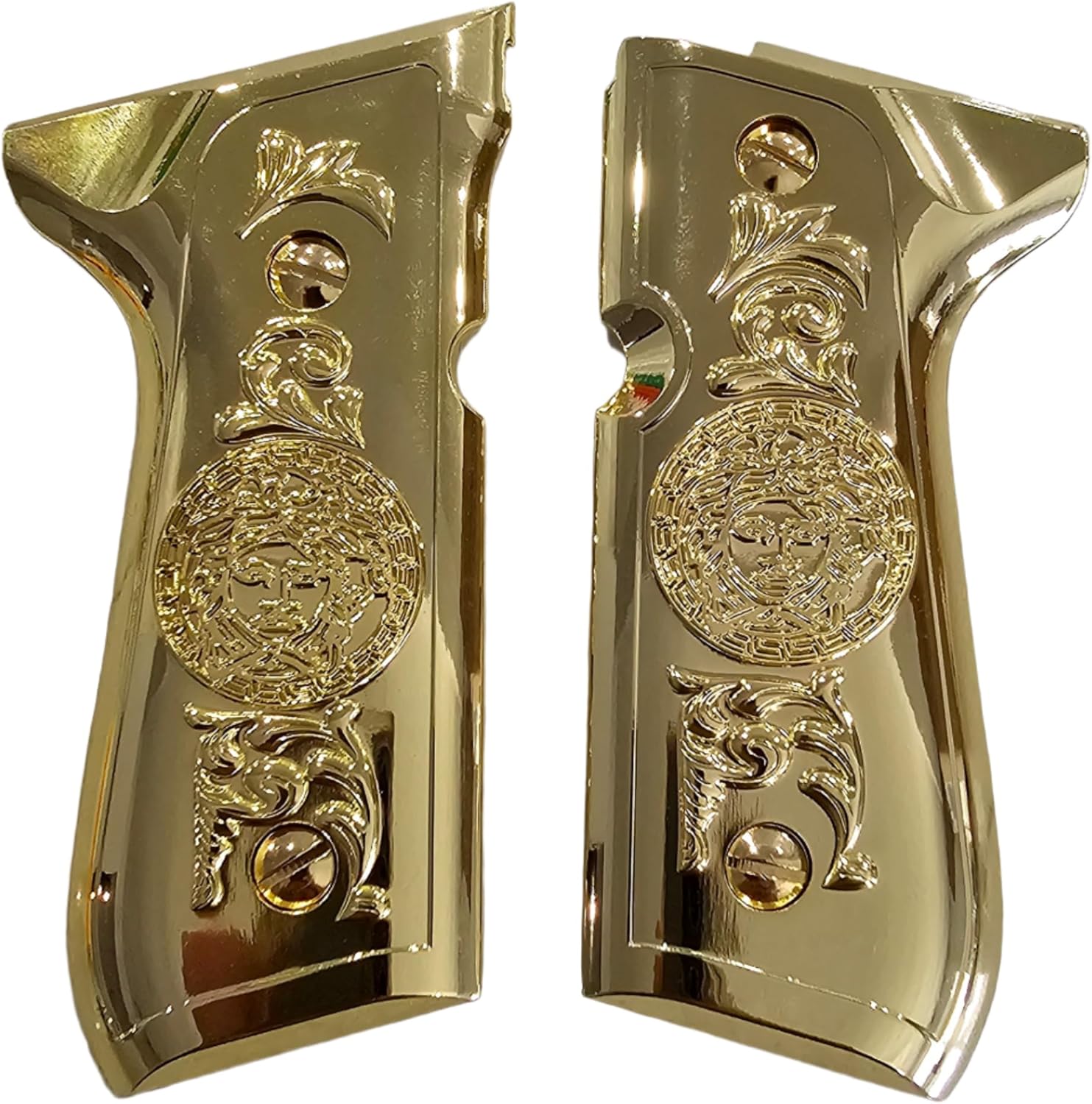Upgrade your Beretta with these premium full-size metal grips featuring an elegant gold finish Medusa emblem detailing. Designed for 92 and 96 series pistols, these grips combine durability, comfort, and luxury for an unmatched custom look.