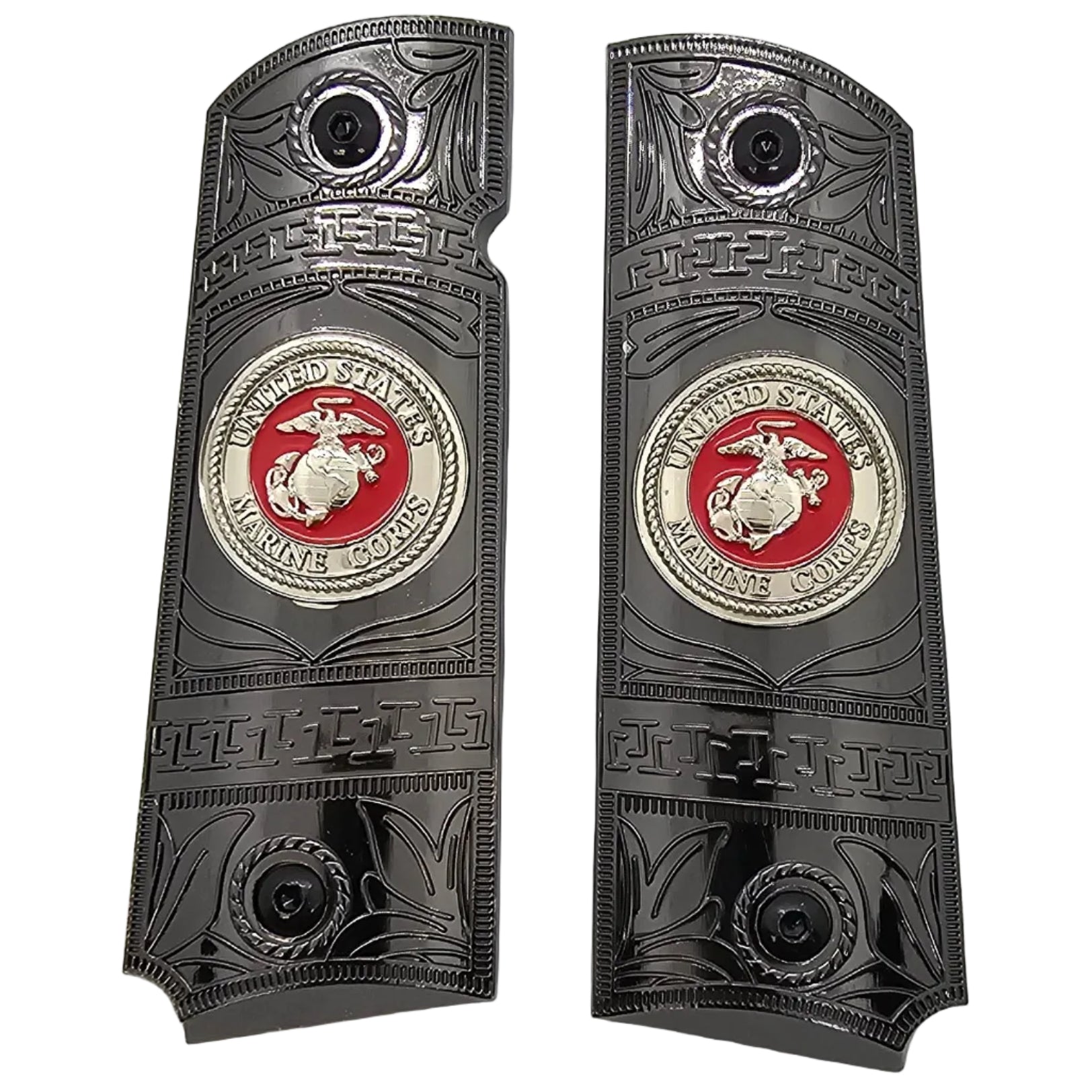 • Black Nickel Metal 1911 Grips – USMC Emblem – Full Size with Ambi Cut + Screws