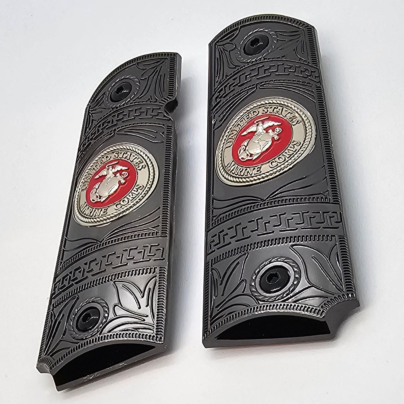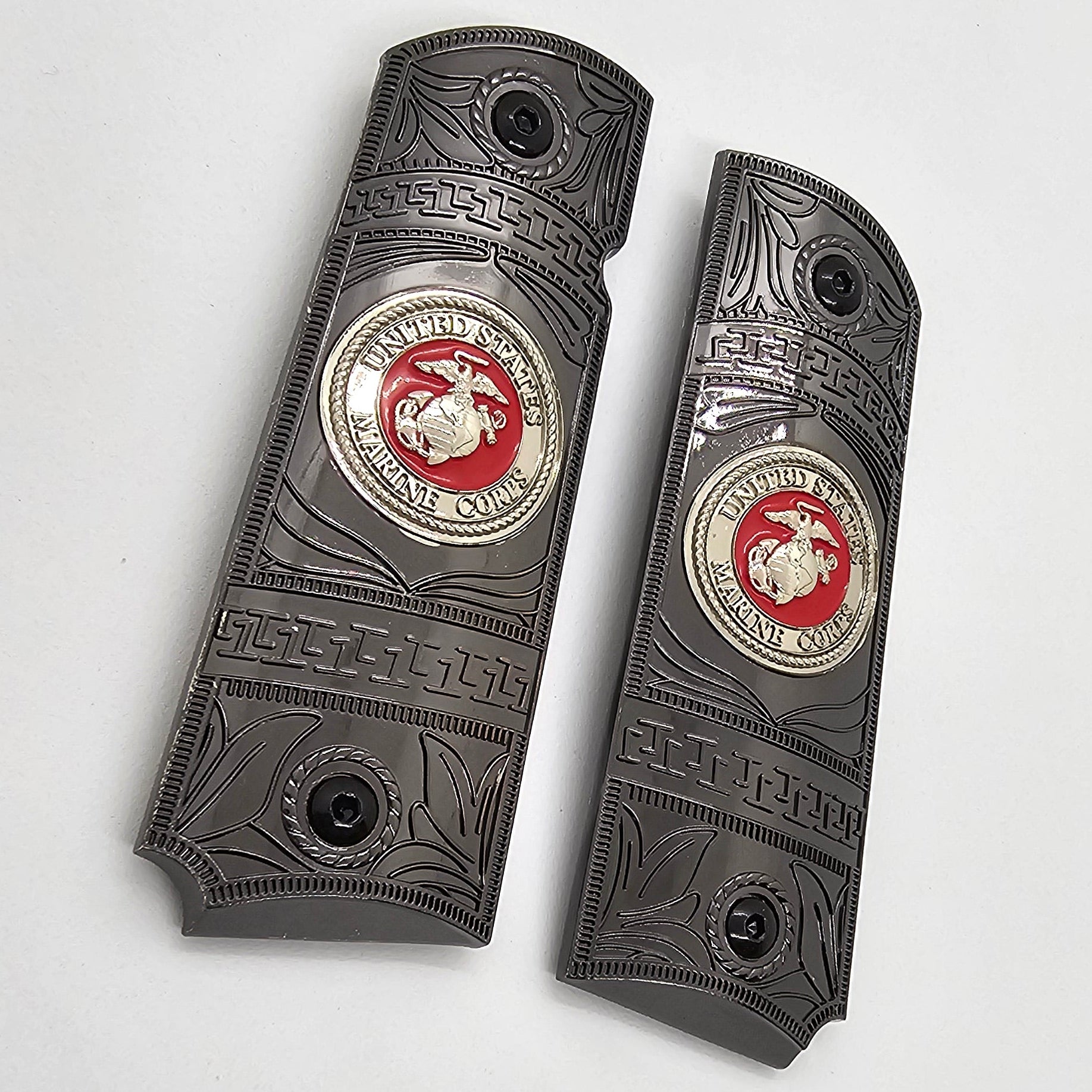 Black Nickel Metal 1911 Grips – USMC Emblem – Full Size with Ambi Cut + Screws