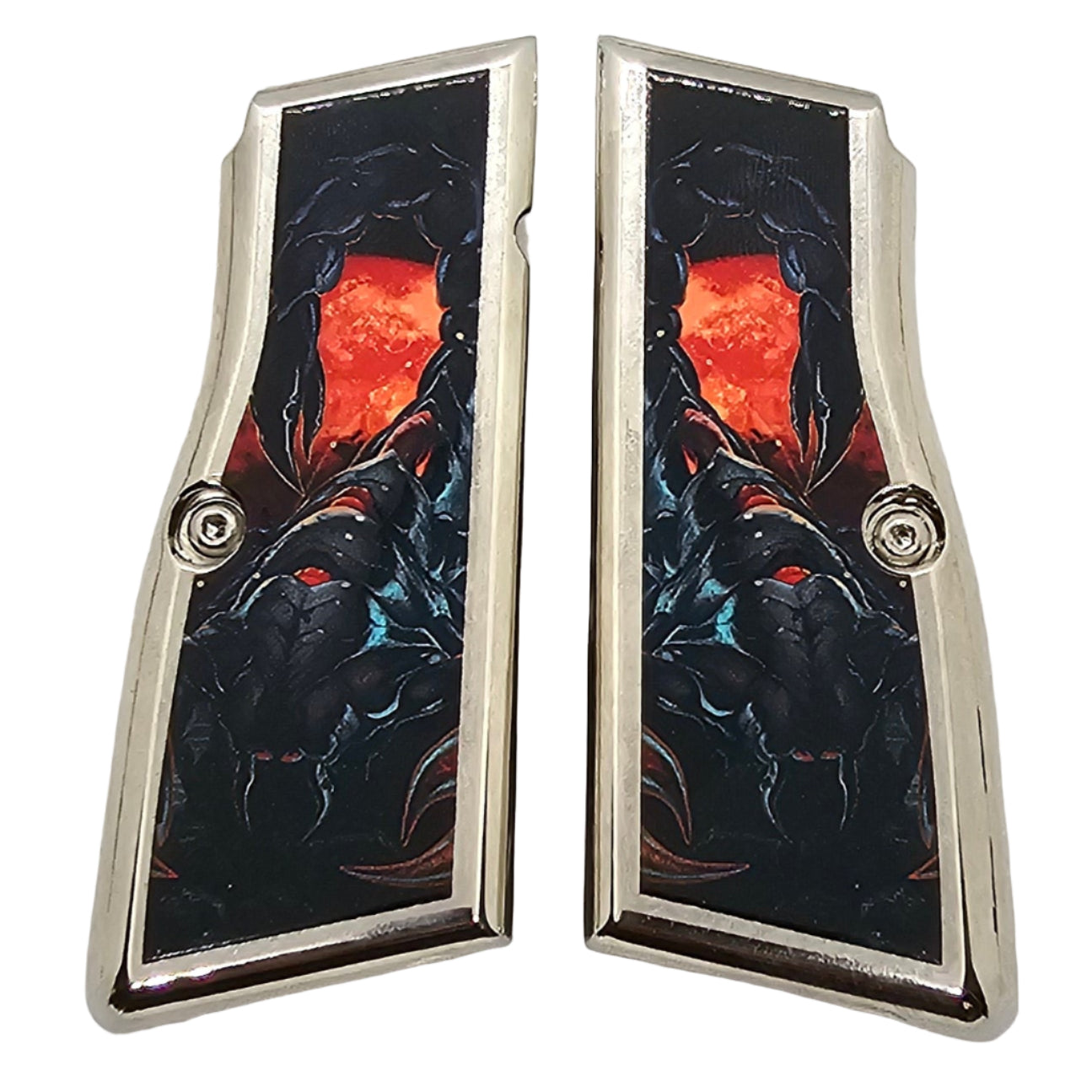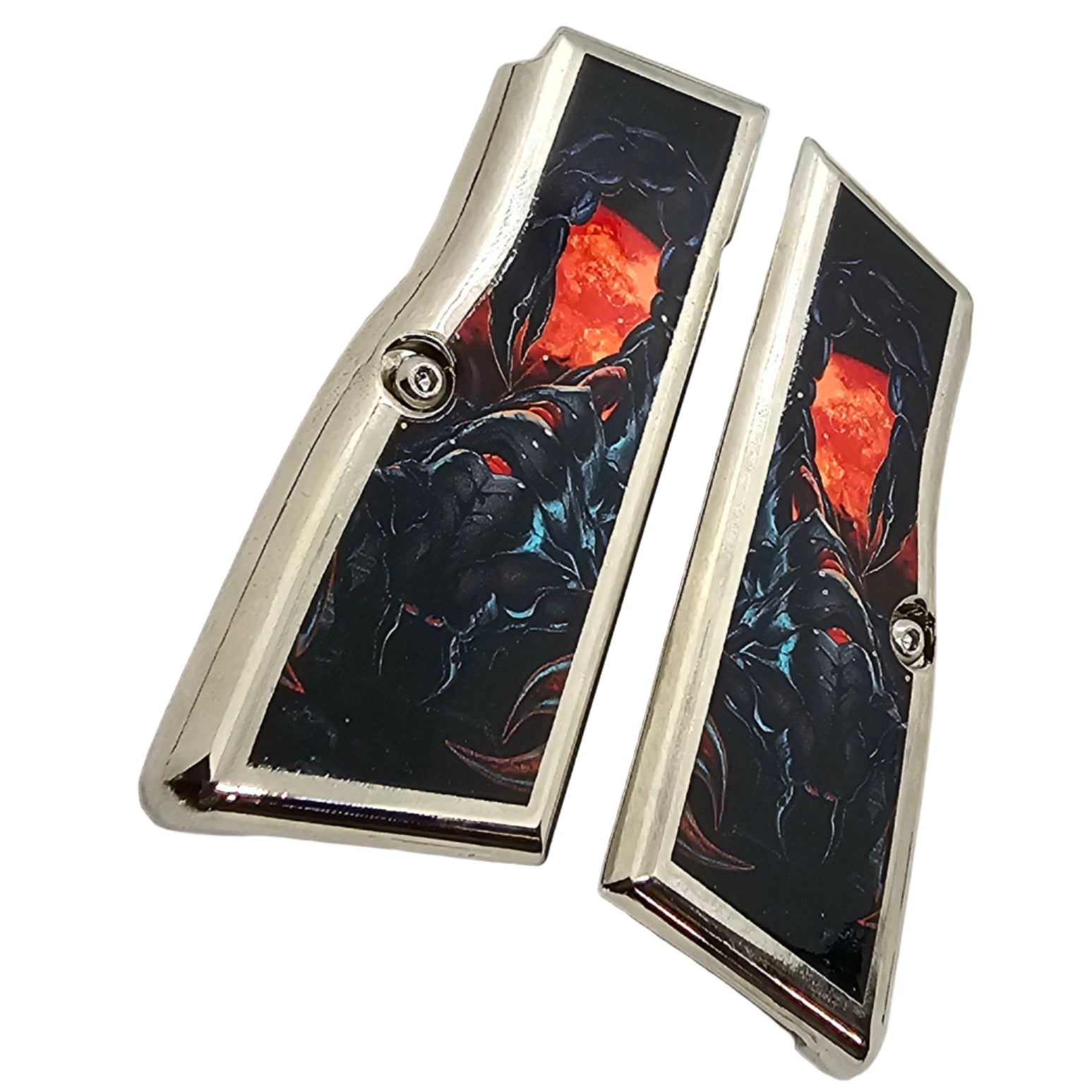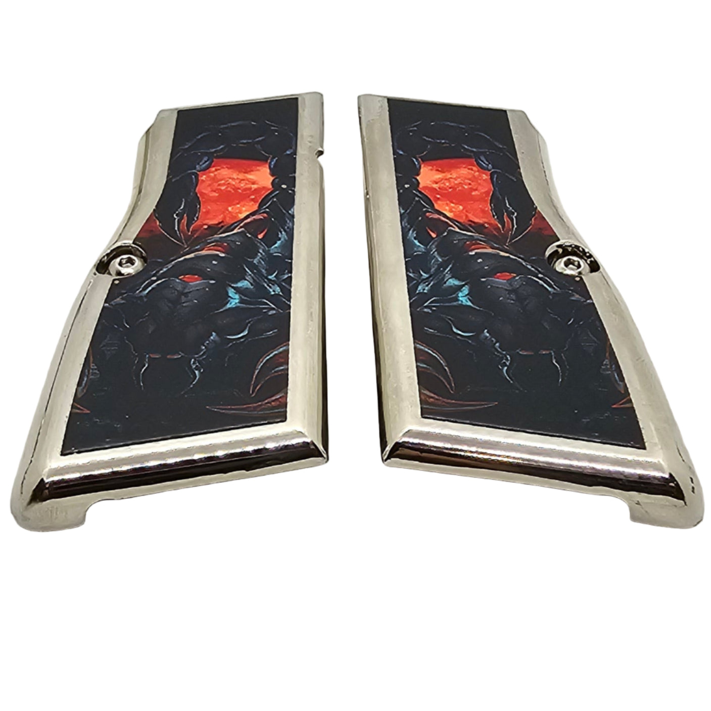 Give your Browning Hi-Power a bold upgrade with these nickel-plated full metal grips, crafted for a perfect fit and long-lasting durability. Featuring a scorpion artwork set against a fiery background, these grips combine durability with striking style.