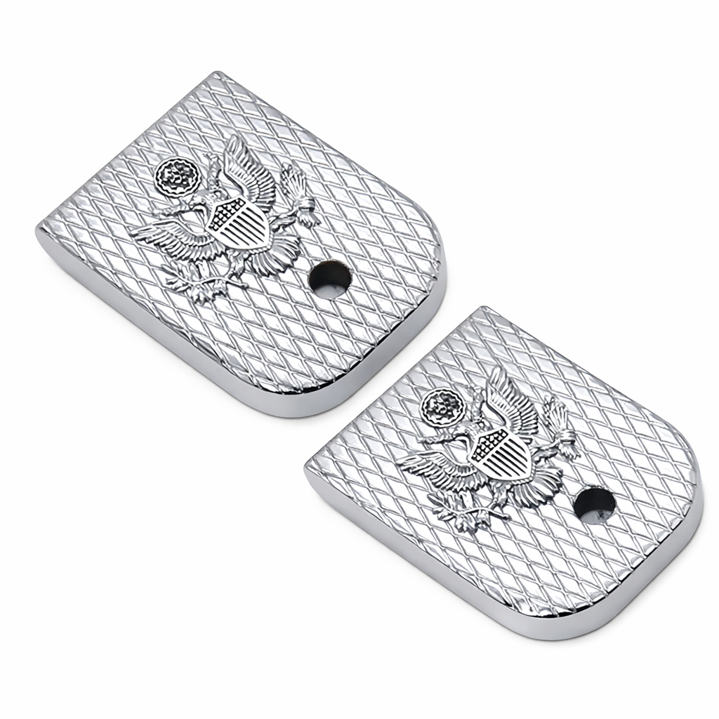 Glock 17, 19, 22, 23, 26 (Gen 1–5) Metal Magazine Base Plates – 2 Pack | Chrome Diamond Texture with Engraved Emblem