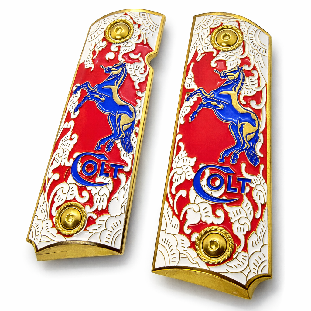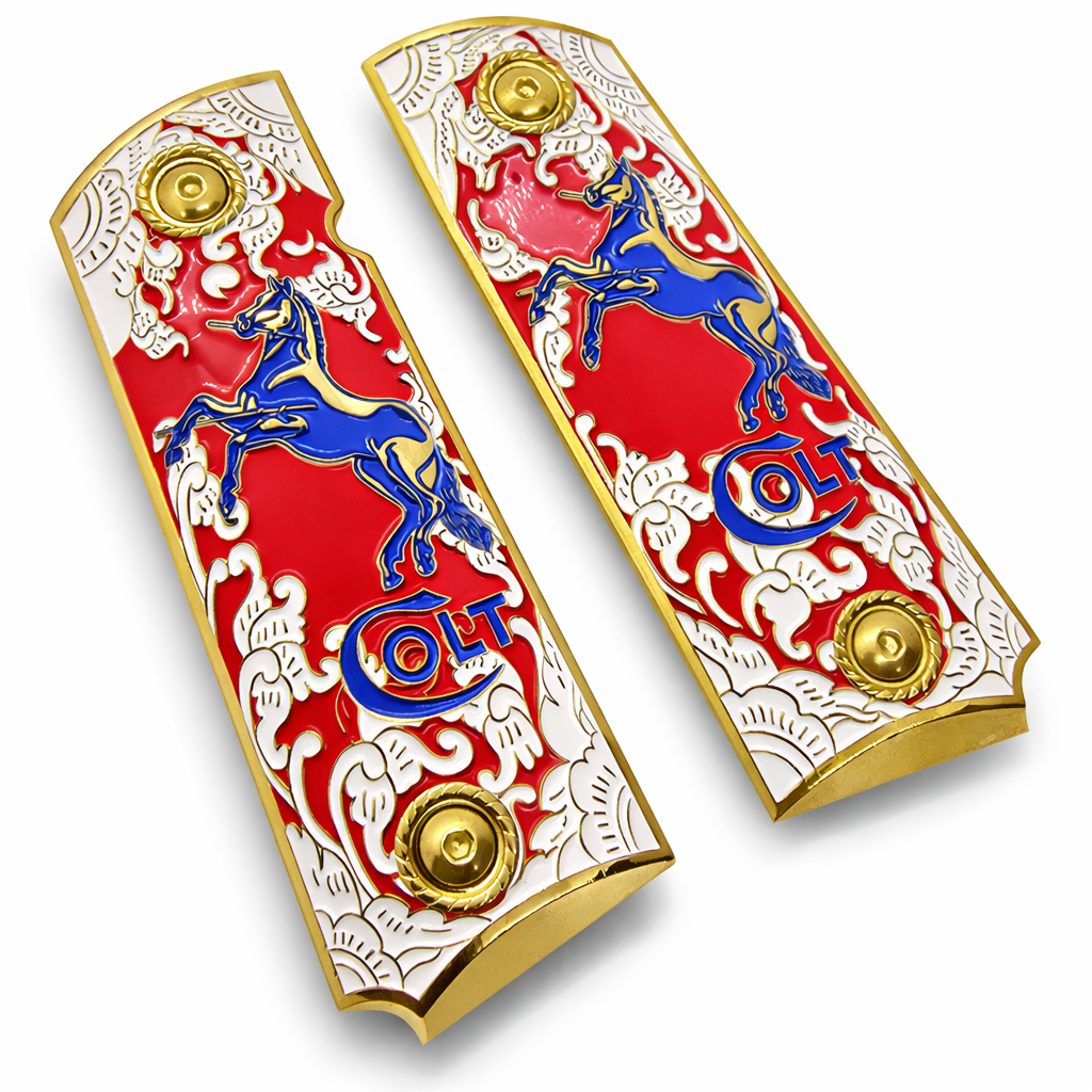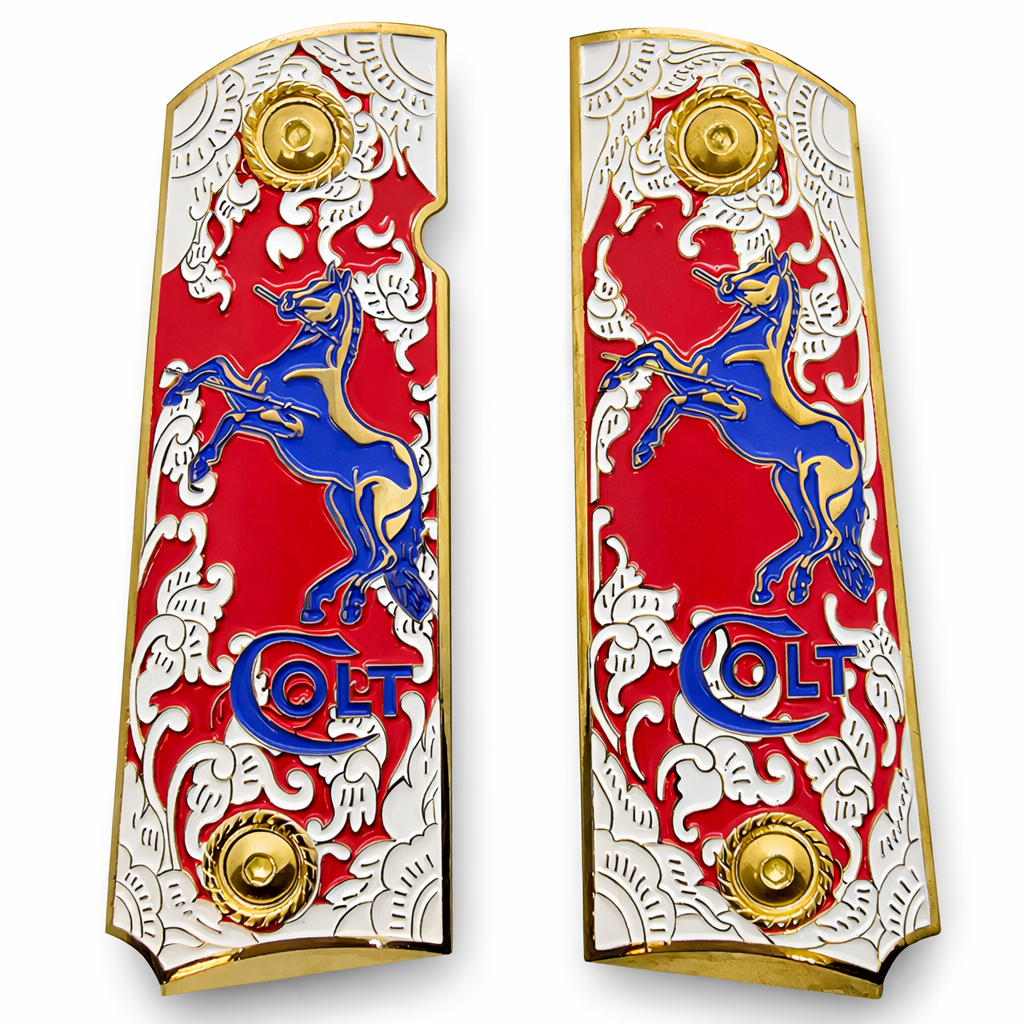 These premium gold plated metal grips transform your full-size 1911 into a bold display piece. Featuring deep red enamel, raised blue rearing stallion artwork, and sculpted scroll detailing, this set delivers luxury presentation with solid metal durability.