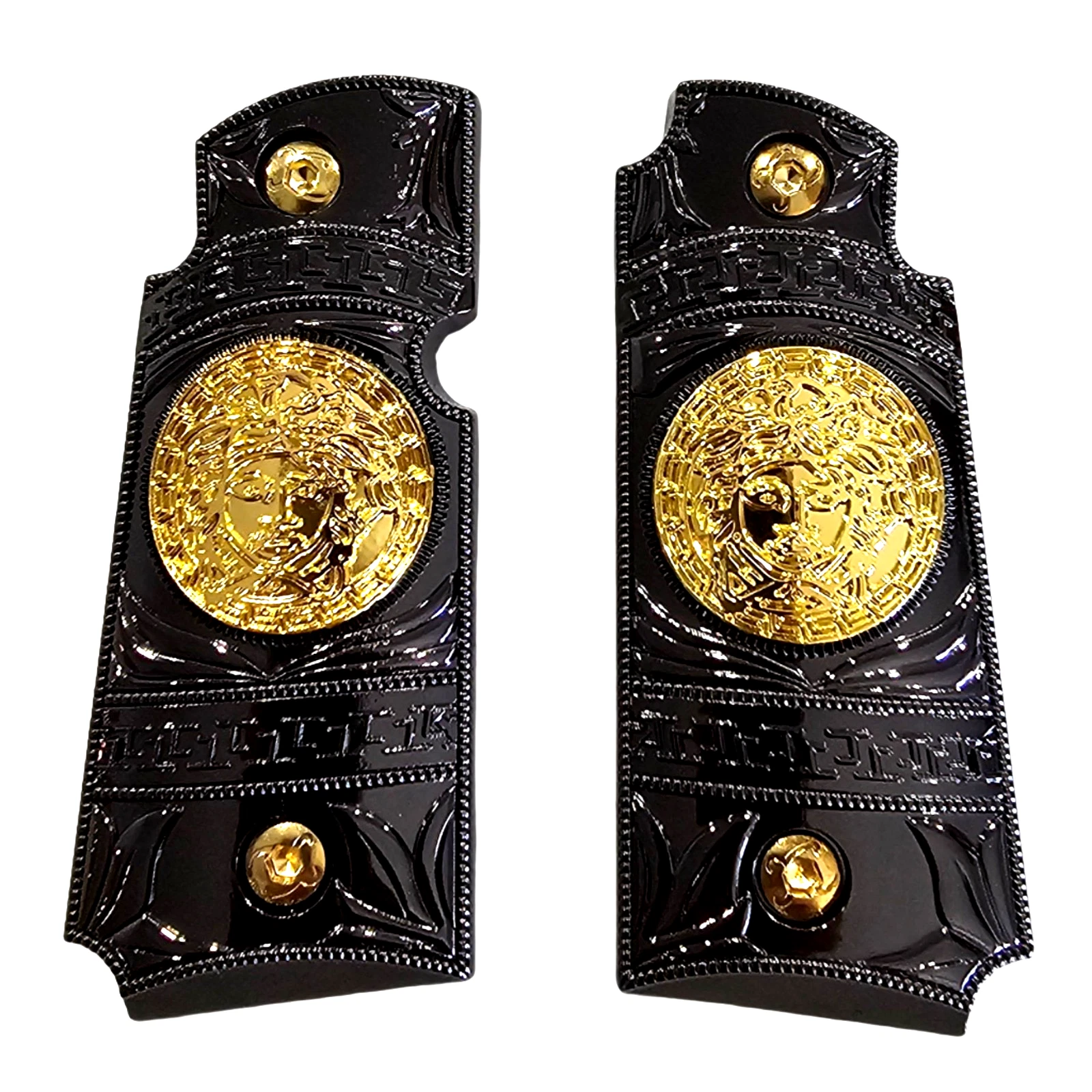 Elevate your Kimber Micro Carry 380 with these luxury Black & Gold Metal Grips featuring an intricately embossed Medusa emblem. Designed for both performance and style, the polished black body and radiant gold detailing make your pistol stand out with elegance and authority. Crafted from solid alloy for lasting durability and a flawless fit, these grips are perfect for collectors and shooters who demand premium design.