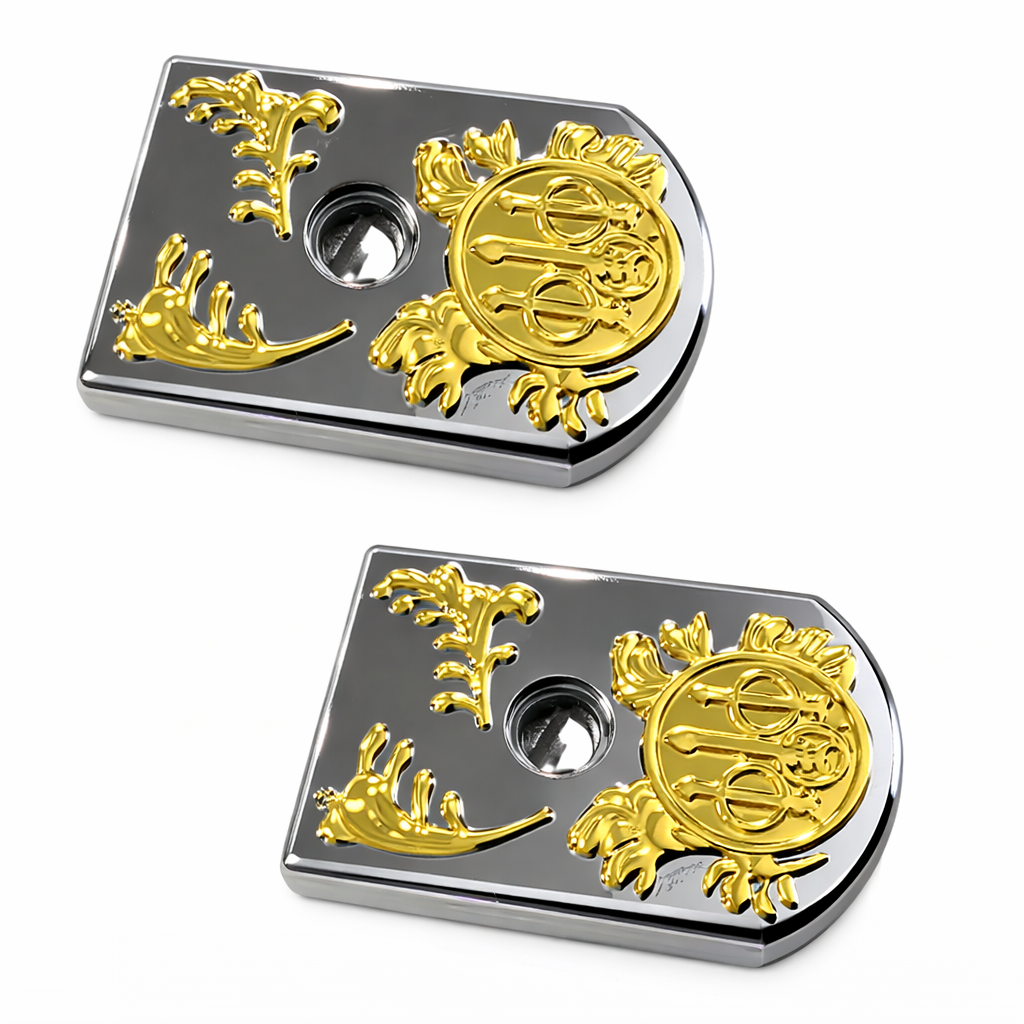 Upgrade the look and feel of your Beretta 92/96 with these polished steel magazine floor plate base pads, featuring an ornate scroll design with gold-plated accents over a mirror nickel finish. Designed to blend classic elegance with durability, these base pads add a refined custom touch while maintaining proper fit and function.