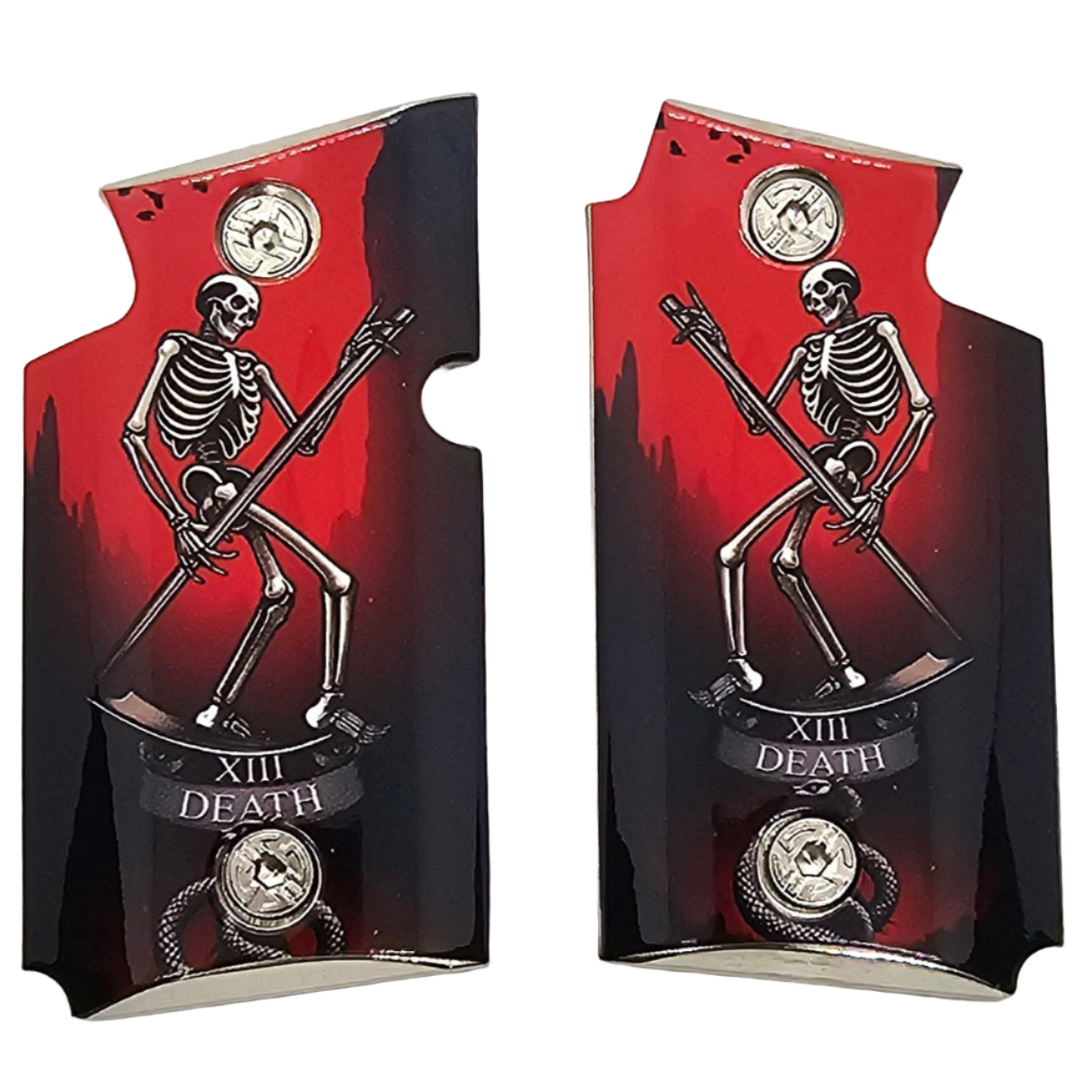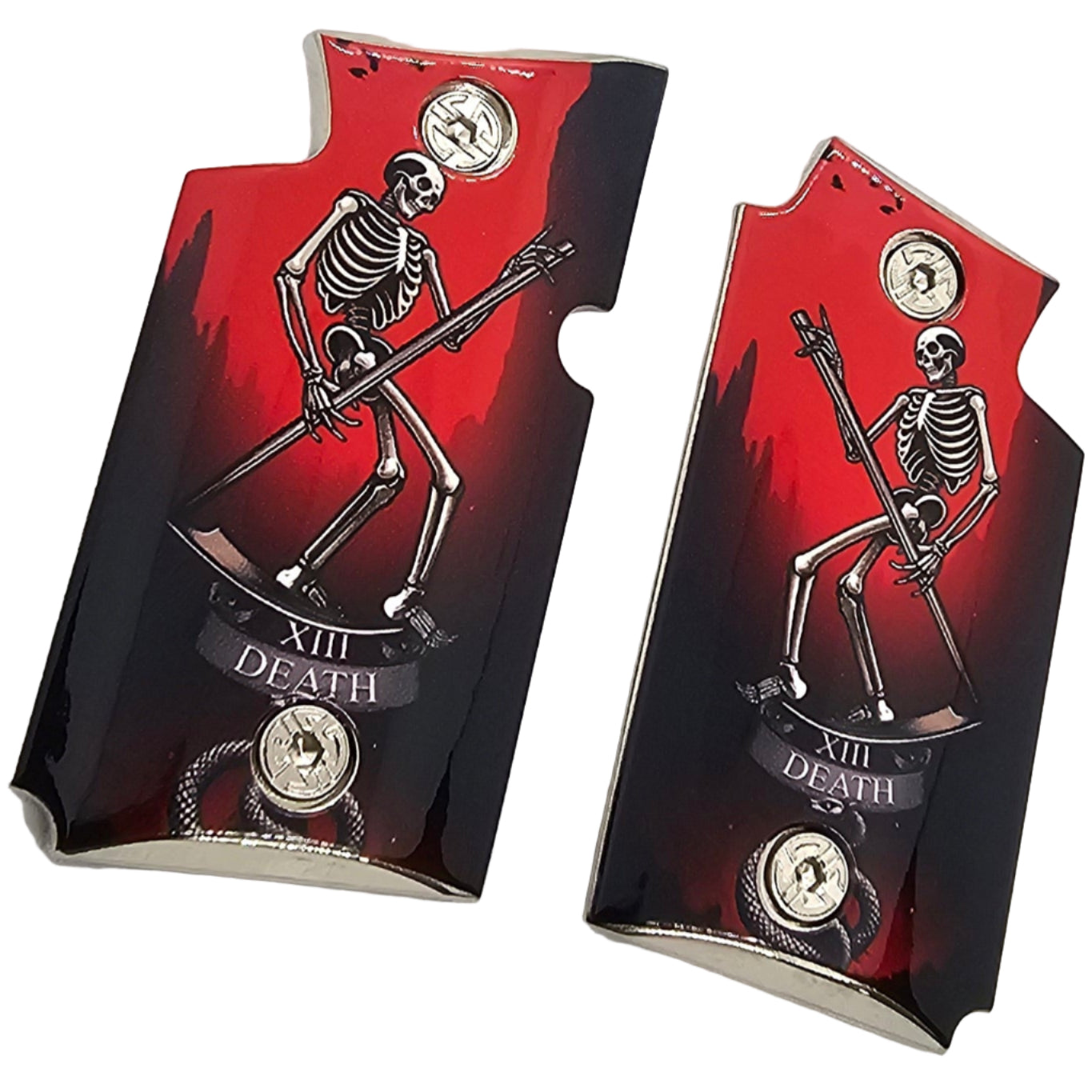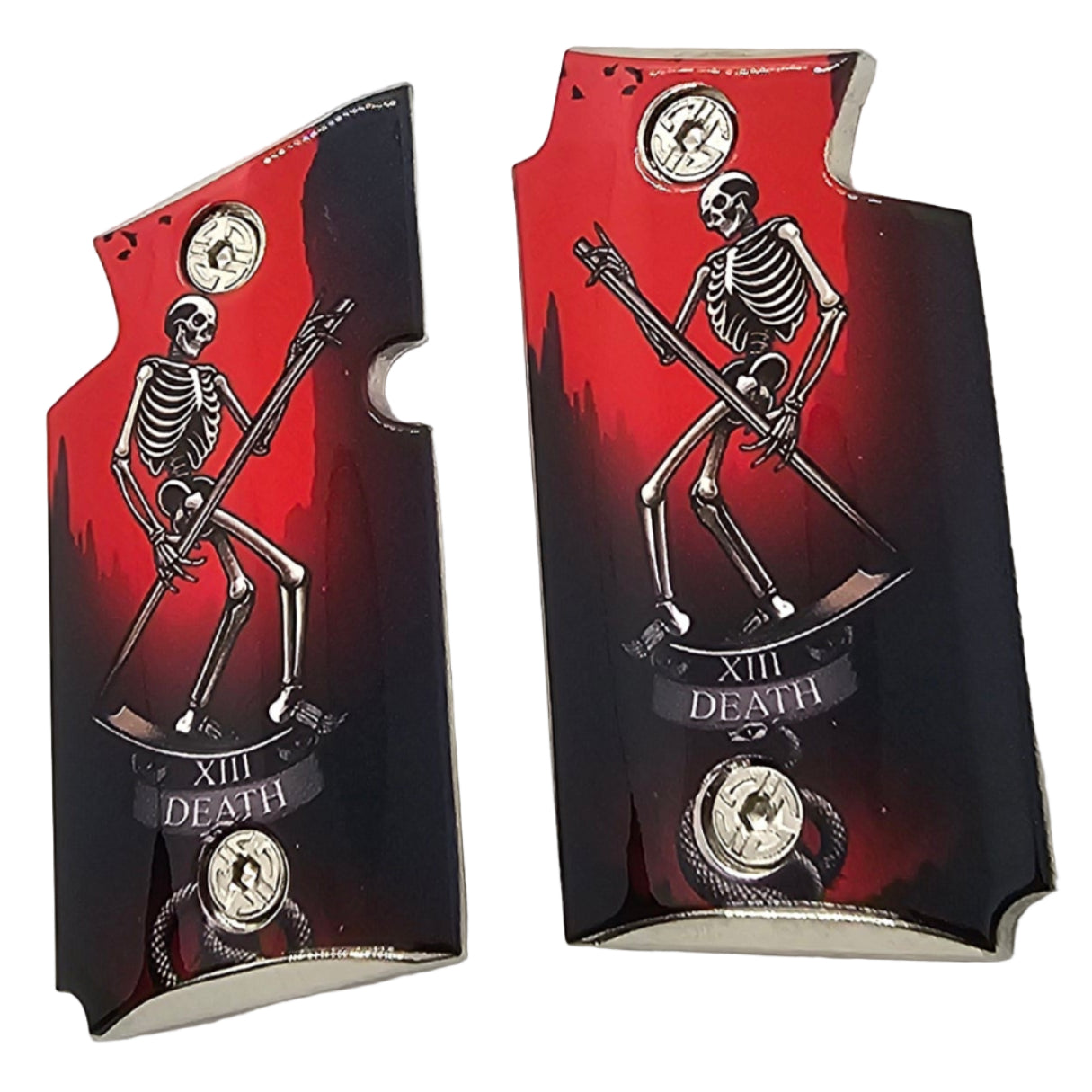 Transform your Sig Sauer P938 with these custom Death Tarot Card grips, featuring a striking skeleton with scythe design set against a bold red and black background. Crafted from durable metal alloy with a polished high-gloss finish, these grips deliver both strength and dramatic style.
