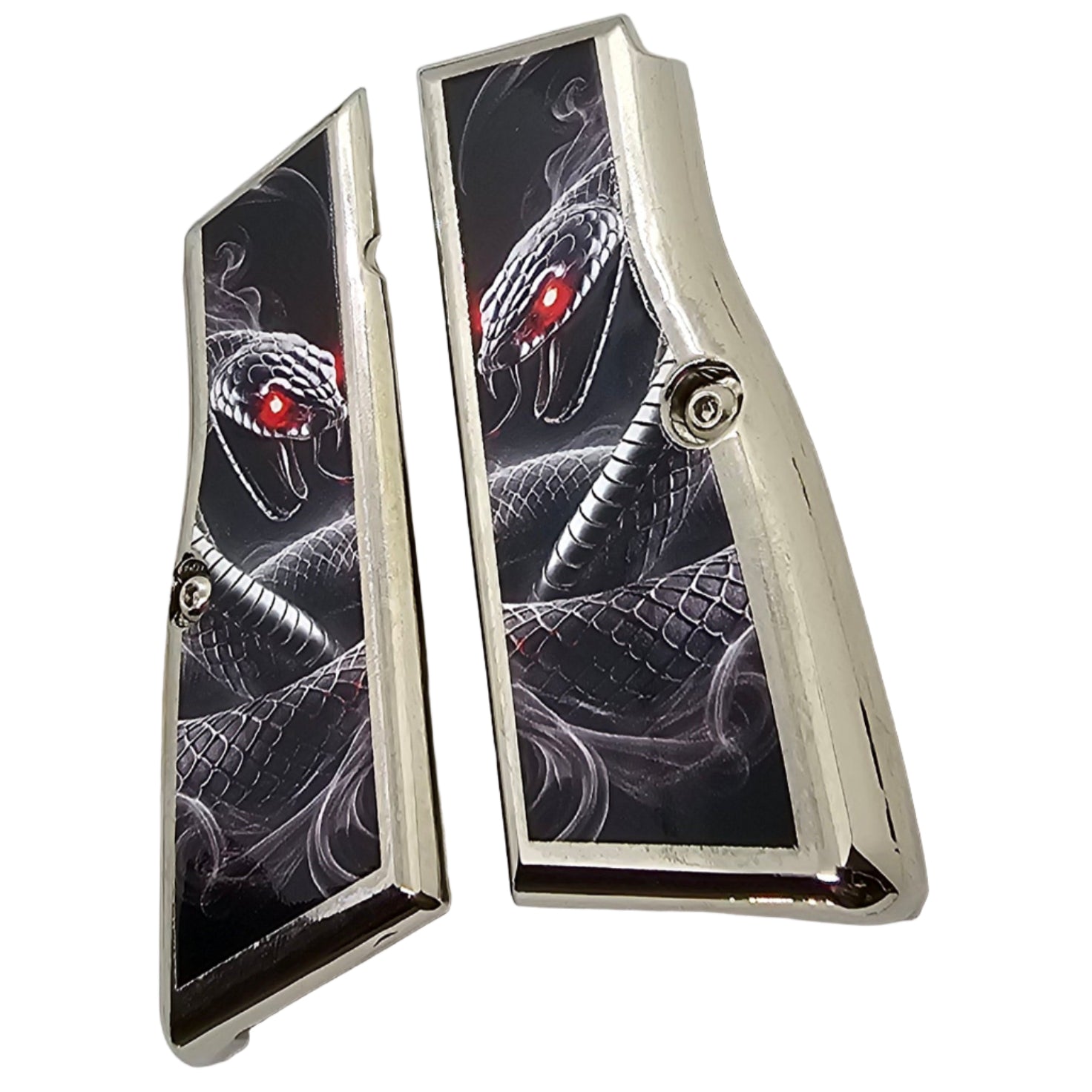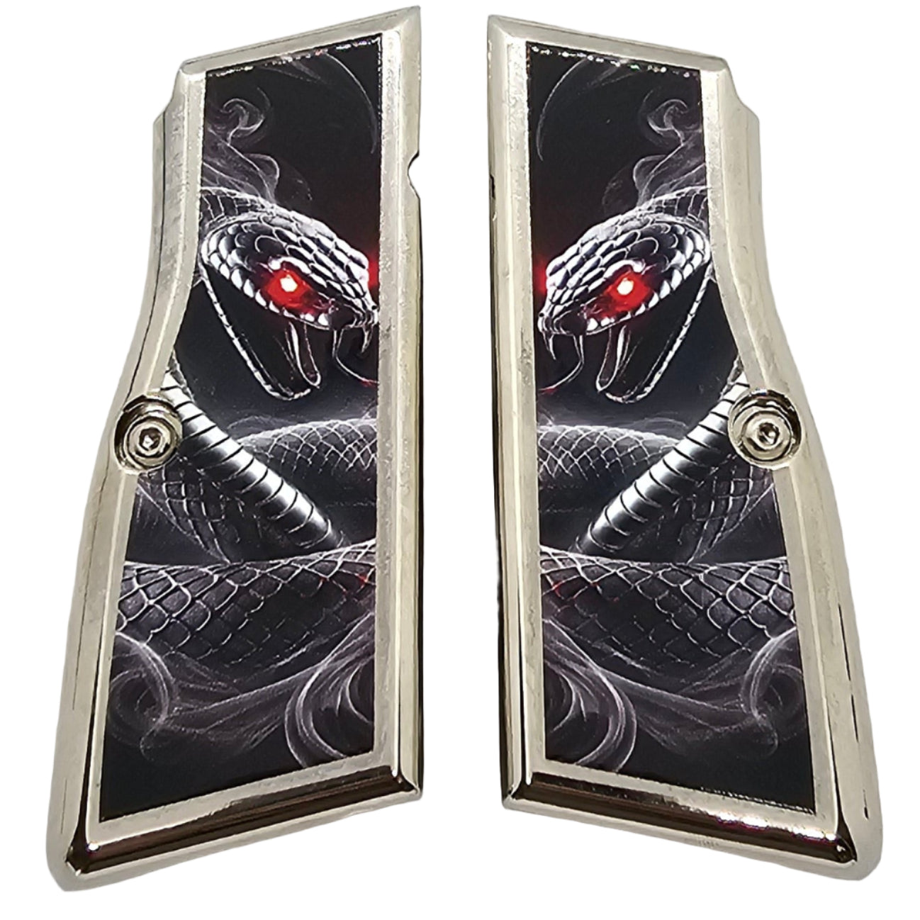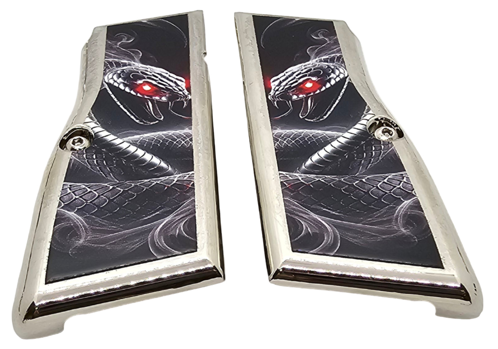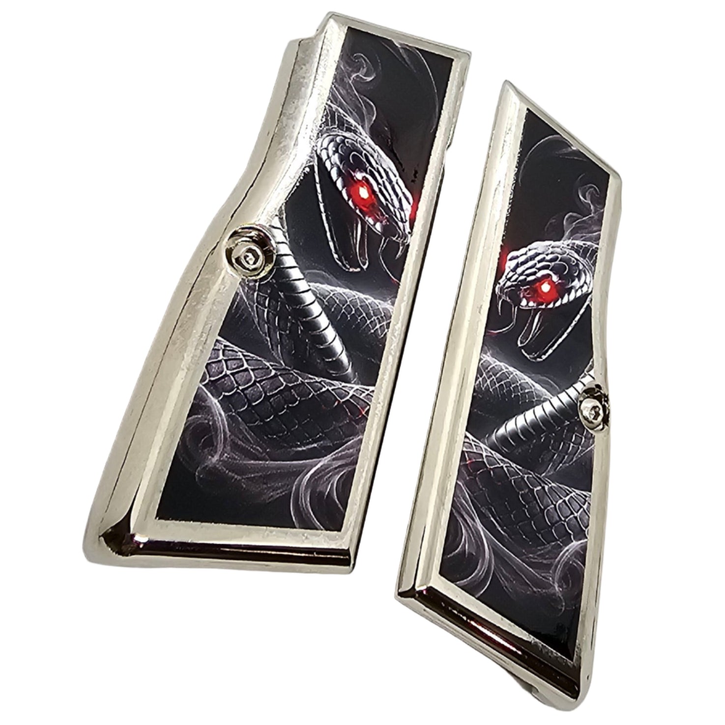 Transform your Browning Hi Power with these aggressive, custom full-size grips. Featuring a striking snake design with glowing red eyes over a nickel-plated metal base, these grips deliver both intimidation and durability.