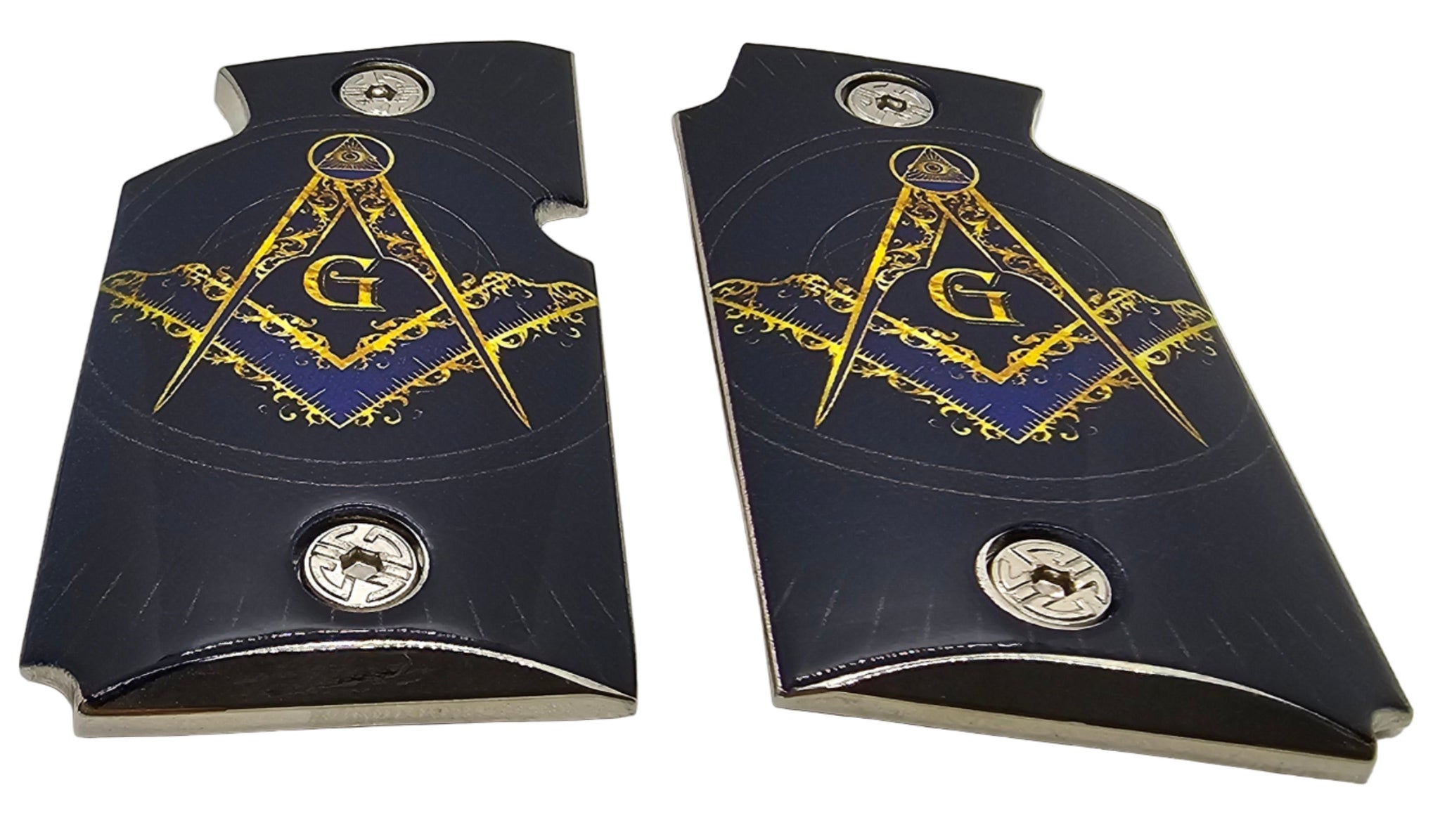 Give your Sig Sauer P938 a premium custom upgrade with these smooth nickel-plated grips featuring the Masonic Square and Compass design. Crafted from durable metal alloy with a polished high-gloss finish, these grips combine strength with striking visual appeal.