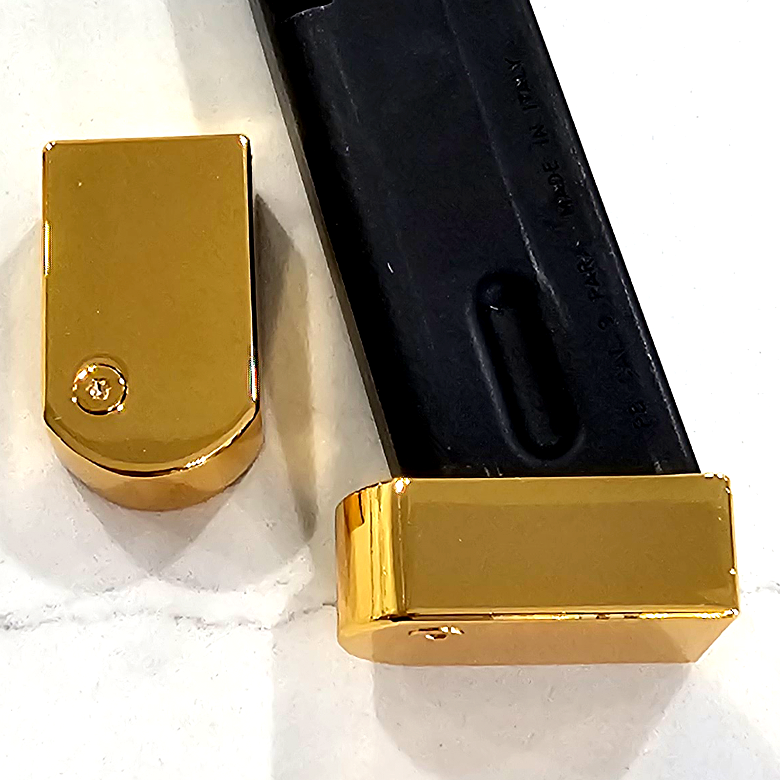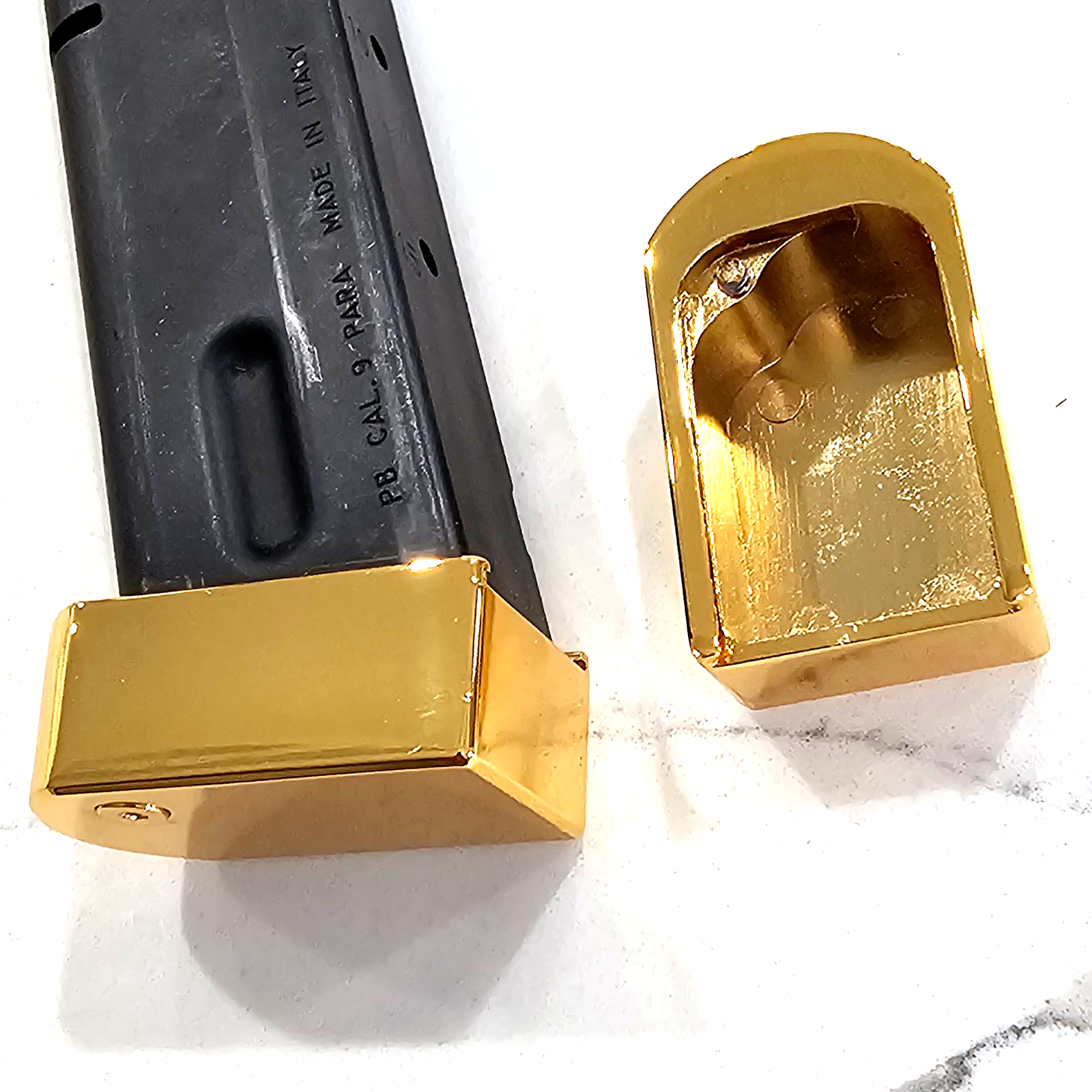 Upgrade your magazines with this 2-pack of solid steel, real gold-plated magazine extensions. Precision-machined and finished with genuine gold plating, these base pads combine strength, durability, and a premium custom appearance.
